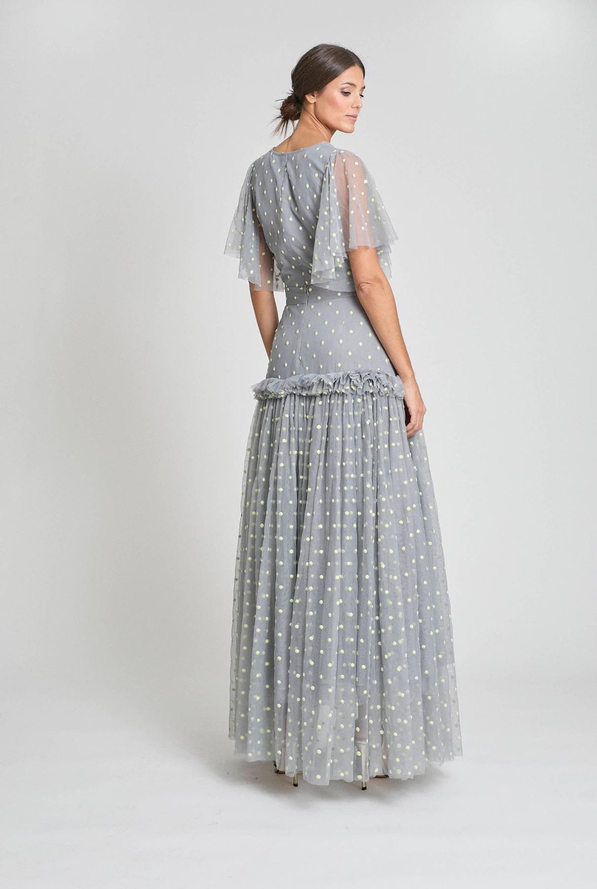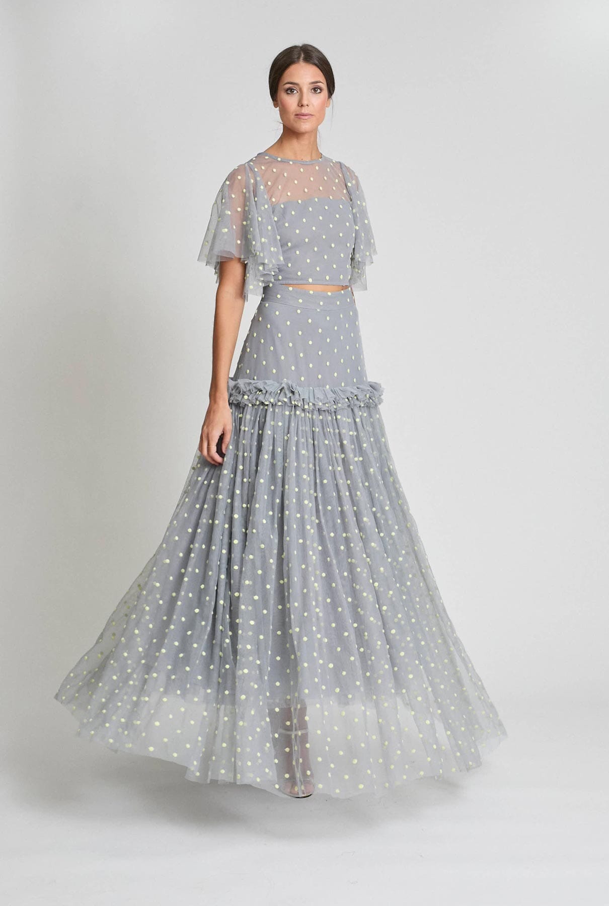 Cuerpo de tul gris con lunares bordados hechos a mano en color lima.