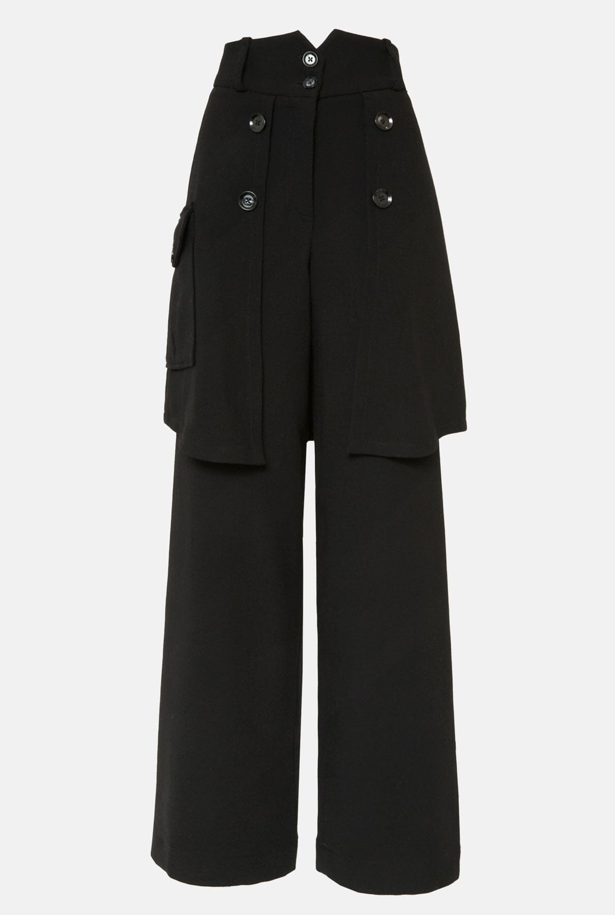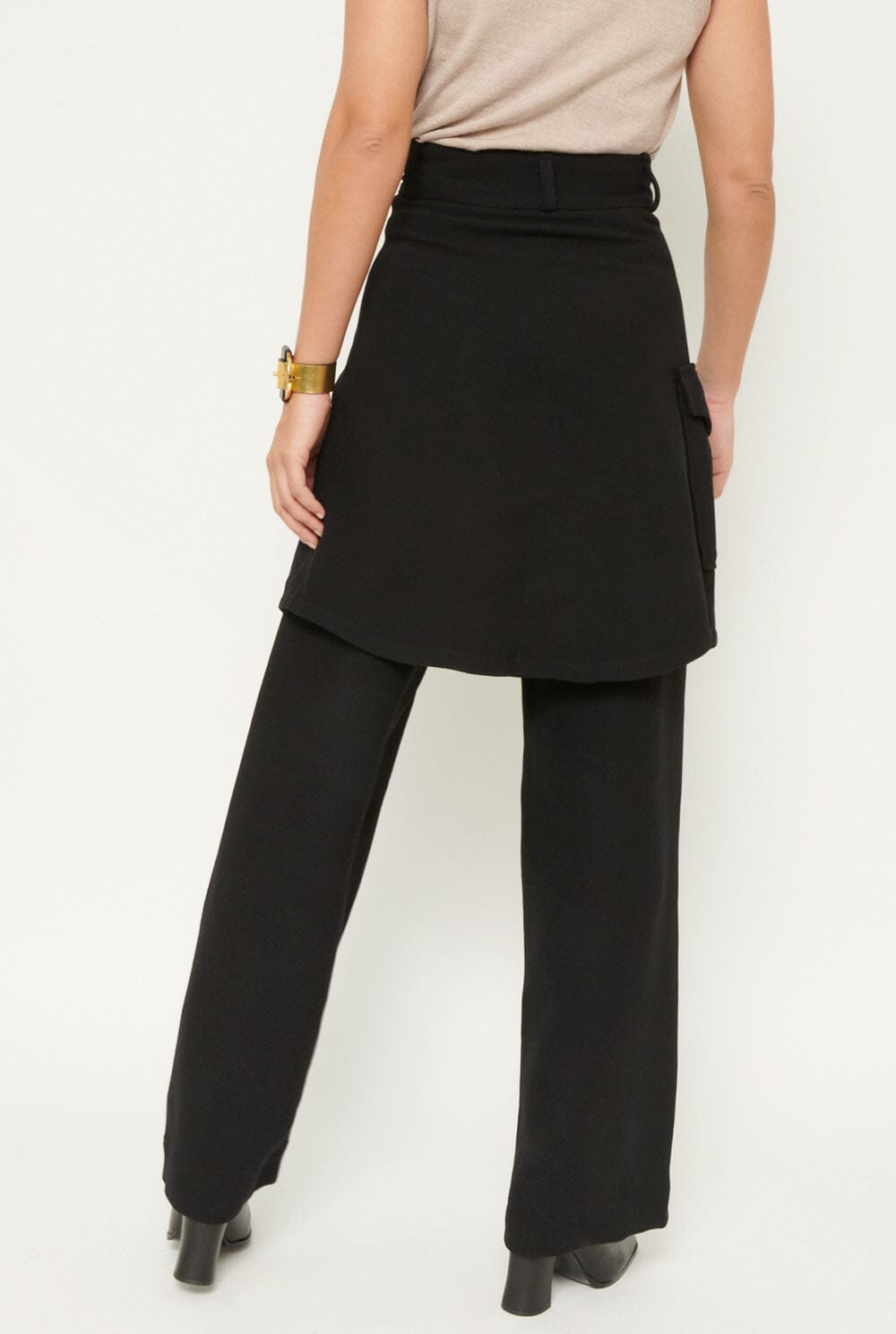 Pantalón negro de talle alto con detalle de falda. Diseño de pernera ancha con cierre frontal de cremallera y botón. Bolsillo lateral de parche con solapa.