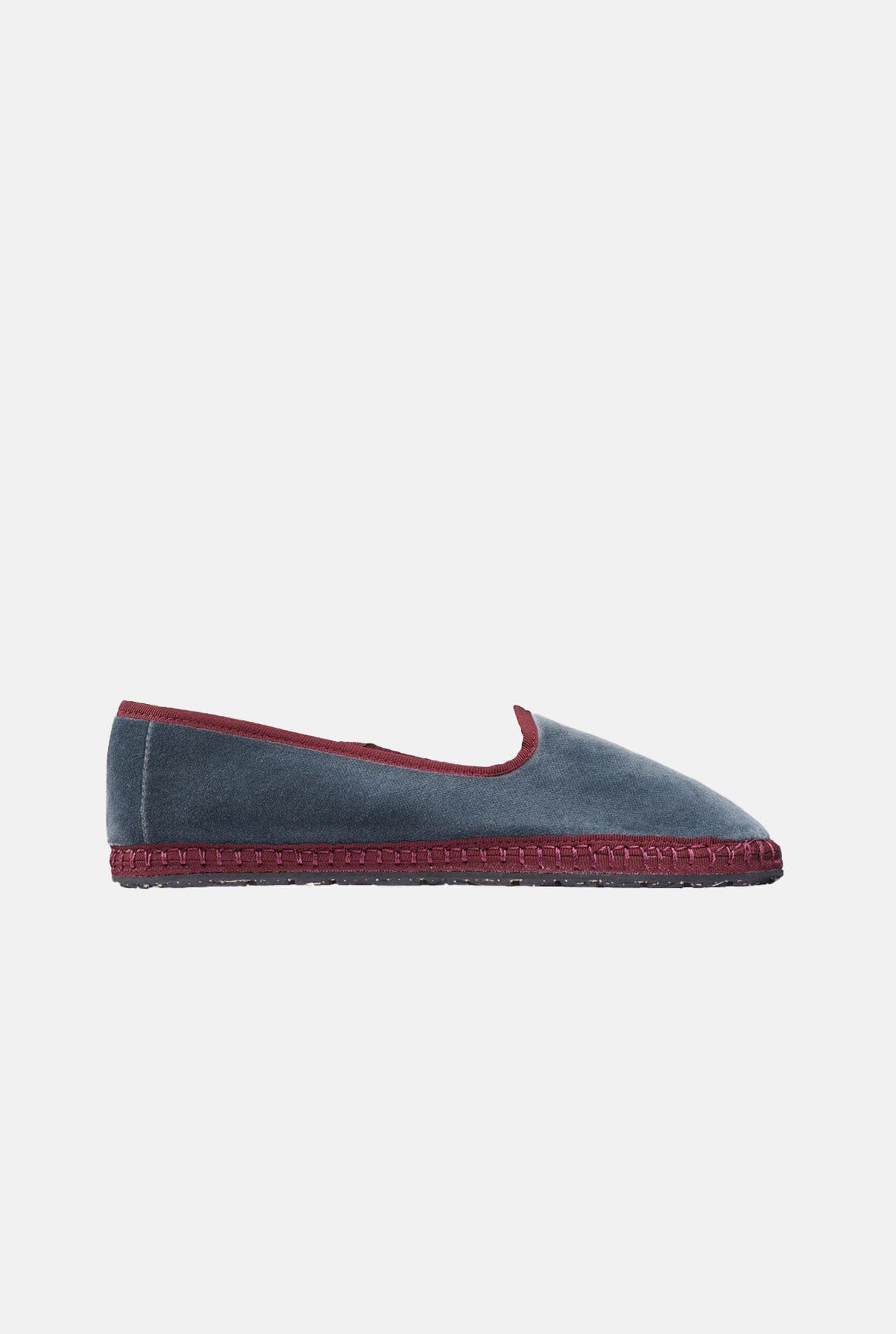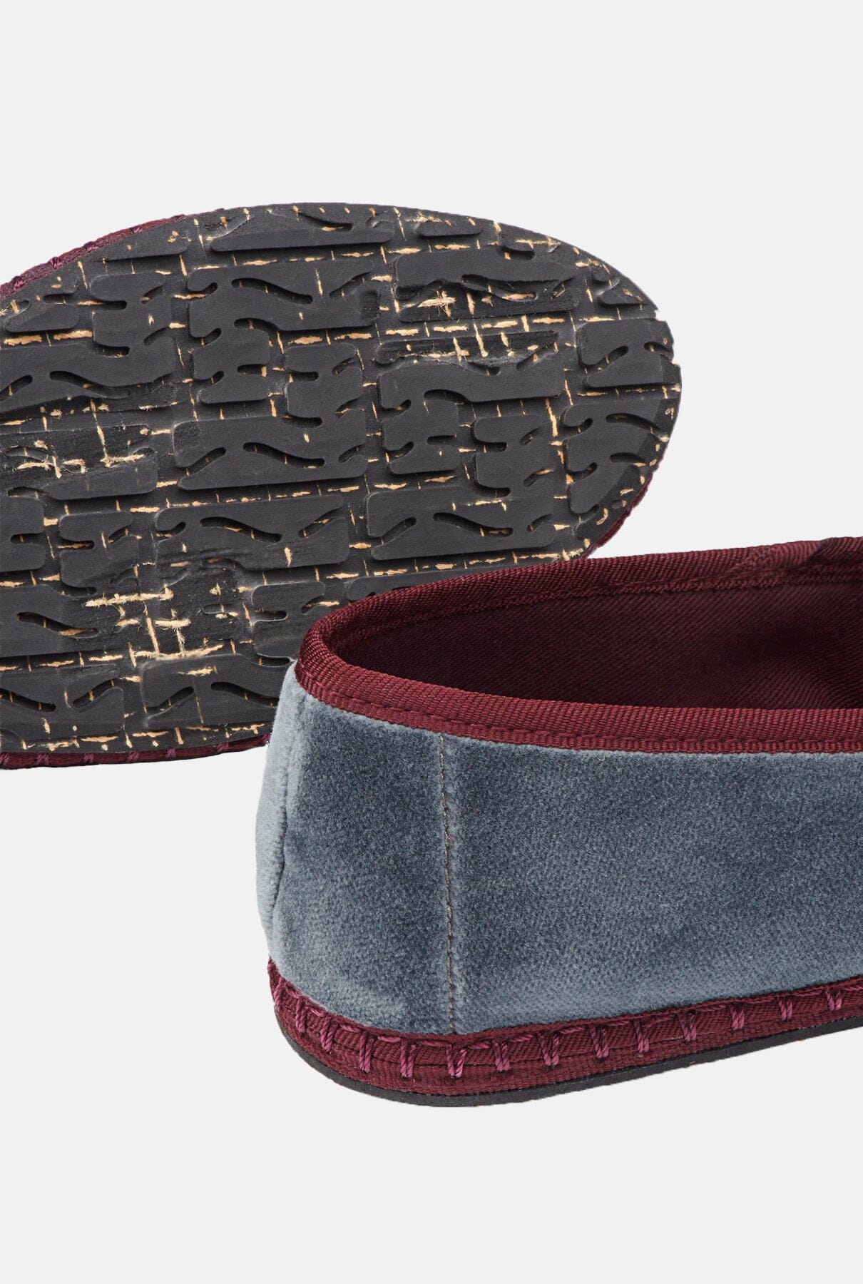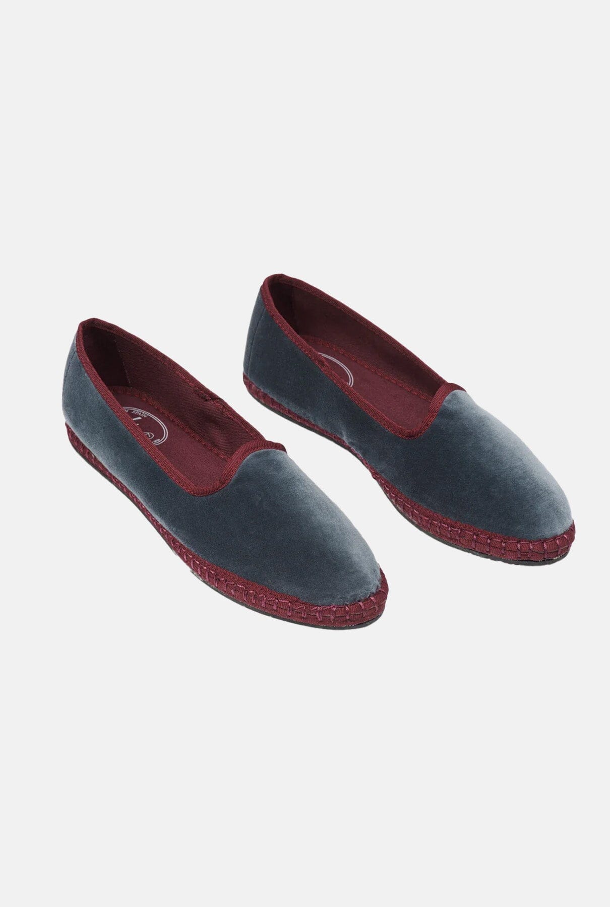 Zapatilla de terciopelo gris oscuro con ribete a contraste en color burdeos. El exterior del zapato es 100% terciopelo de algodón, y el interior del zapato es 100% algodón orgánico con tratamiento antibacteriano. La suela está hecha de caucho producido a partir de neumáticos de bicicleta reciclados.