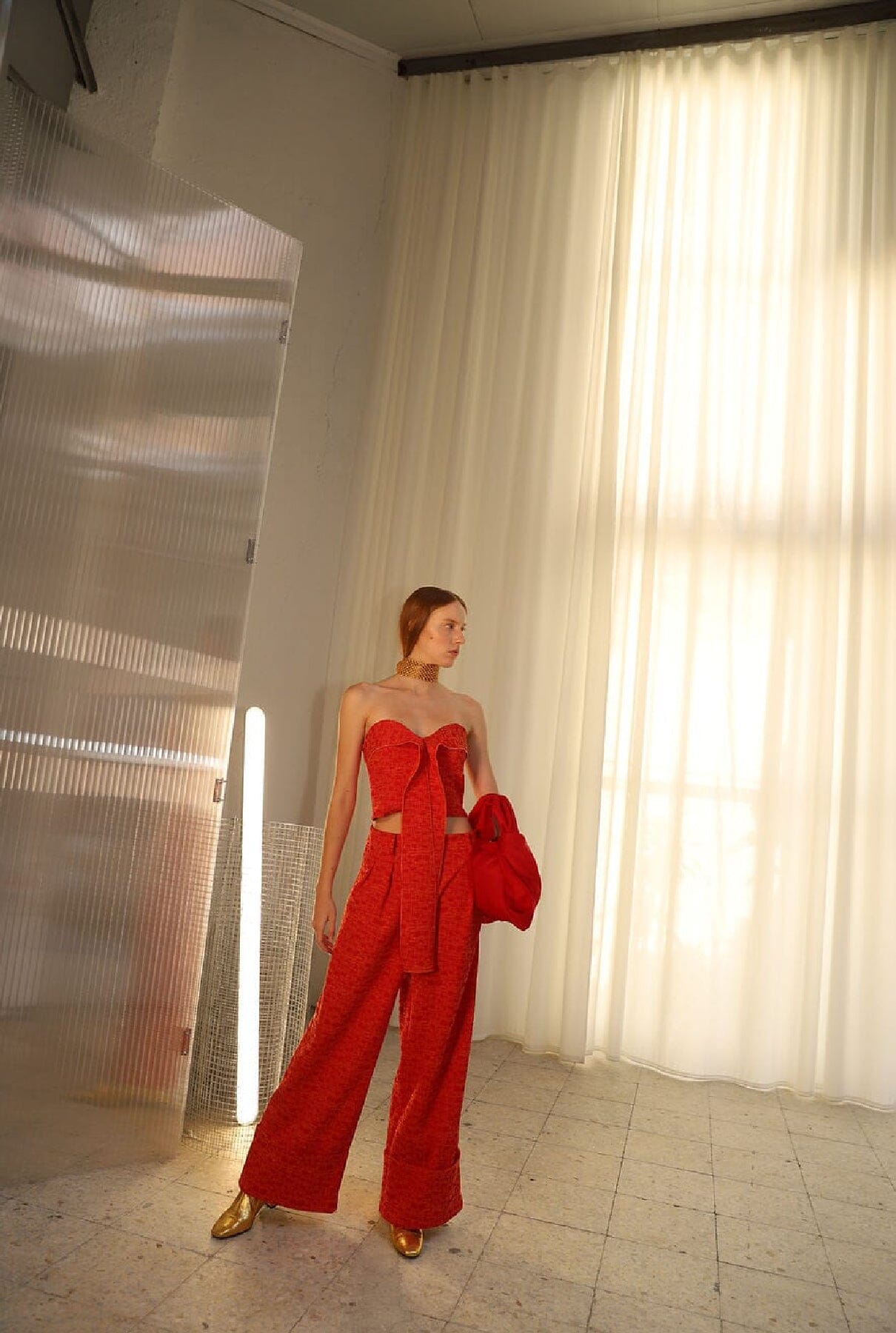 Vestido midi de lana de tweed con escote halter y espalda descubierta. Puedes combinarlo con nuestro chal a juego. Perfecto para cualquier ocasión formal, este vestido atraerá todas las miradas.