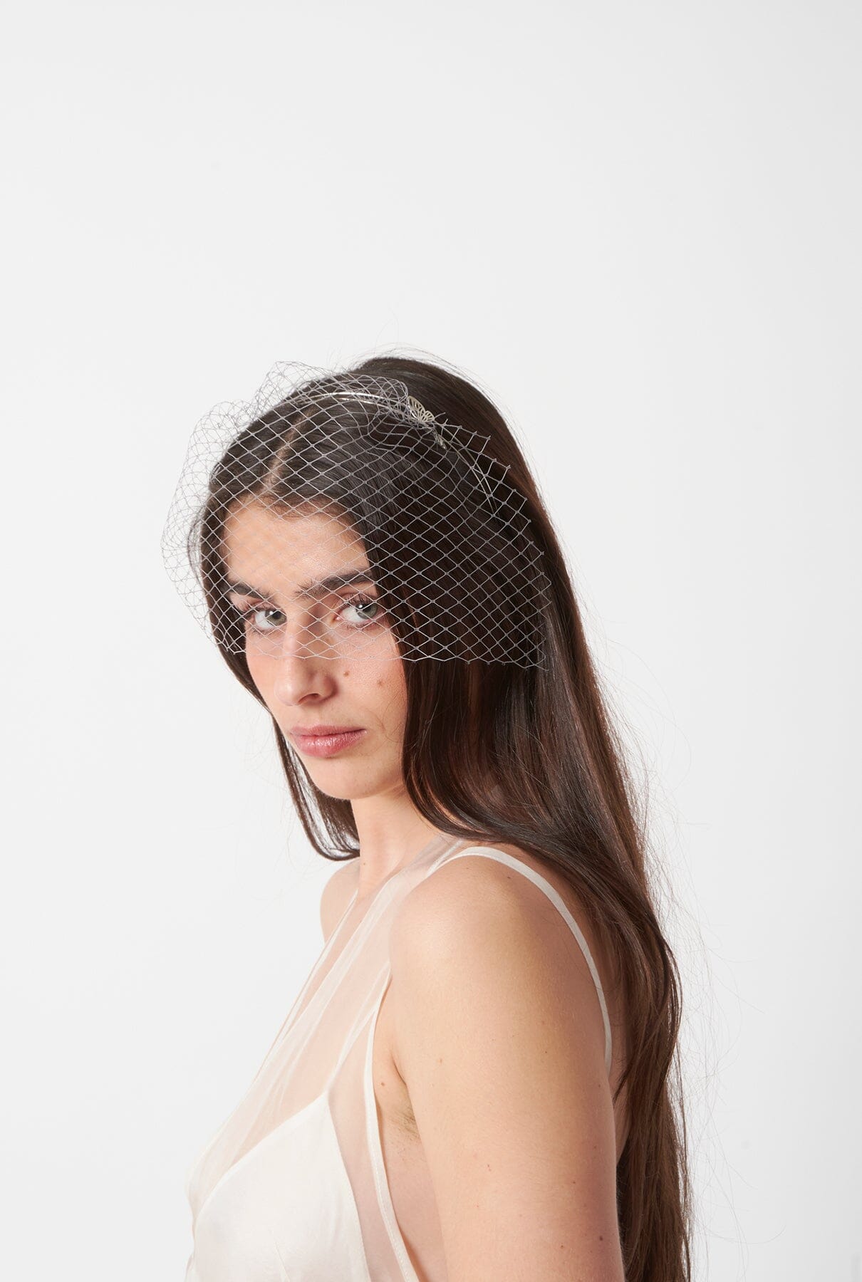 Diadema doble metálica con mariposas y velo en tono gris