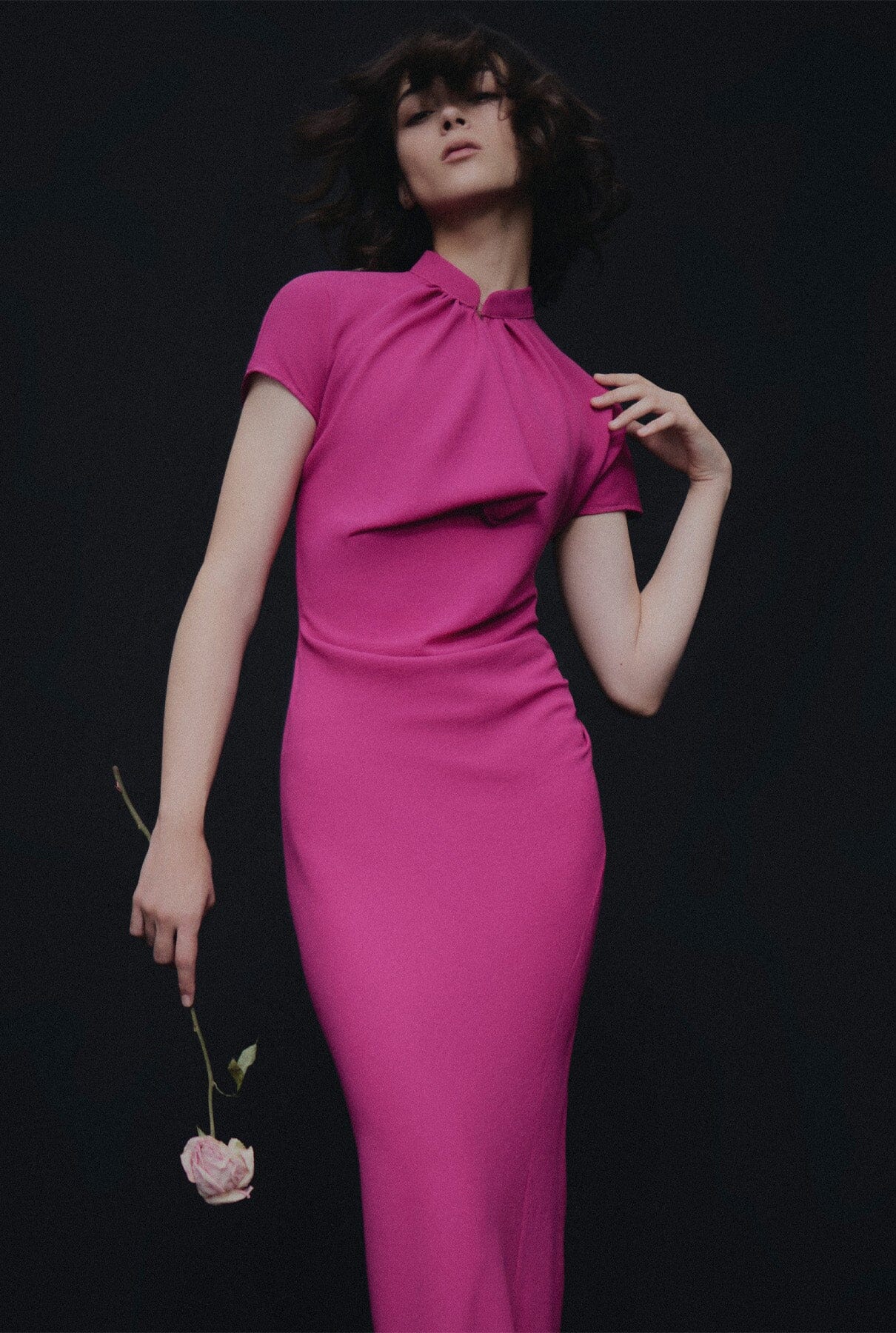 VESTIDO QIPAO DECONSTRUIDO CON COSTURAS ENROLLADAS EN EL CUERPO. MANGAS CAÍDAS Y CORTE AL BIES. ESCOTE DE PAÑUELO CON CUELLO MAO ABOTONADO EN EL FRENTE. RIZADO EN LA CINTURA EN UN LADO.