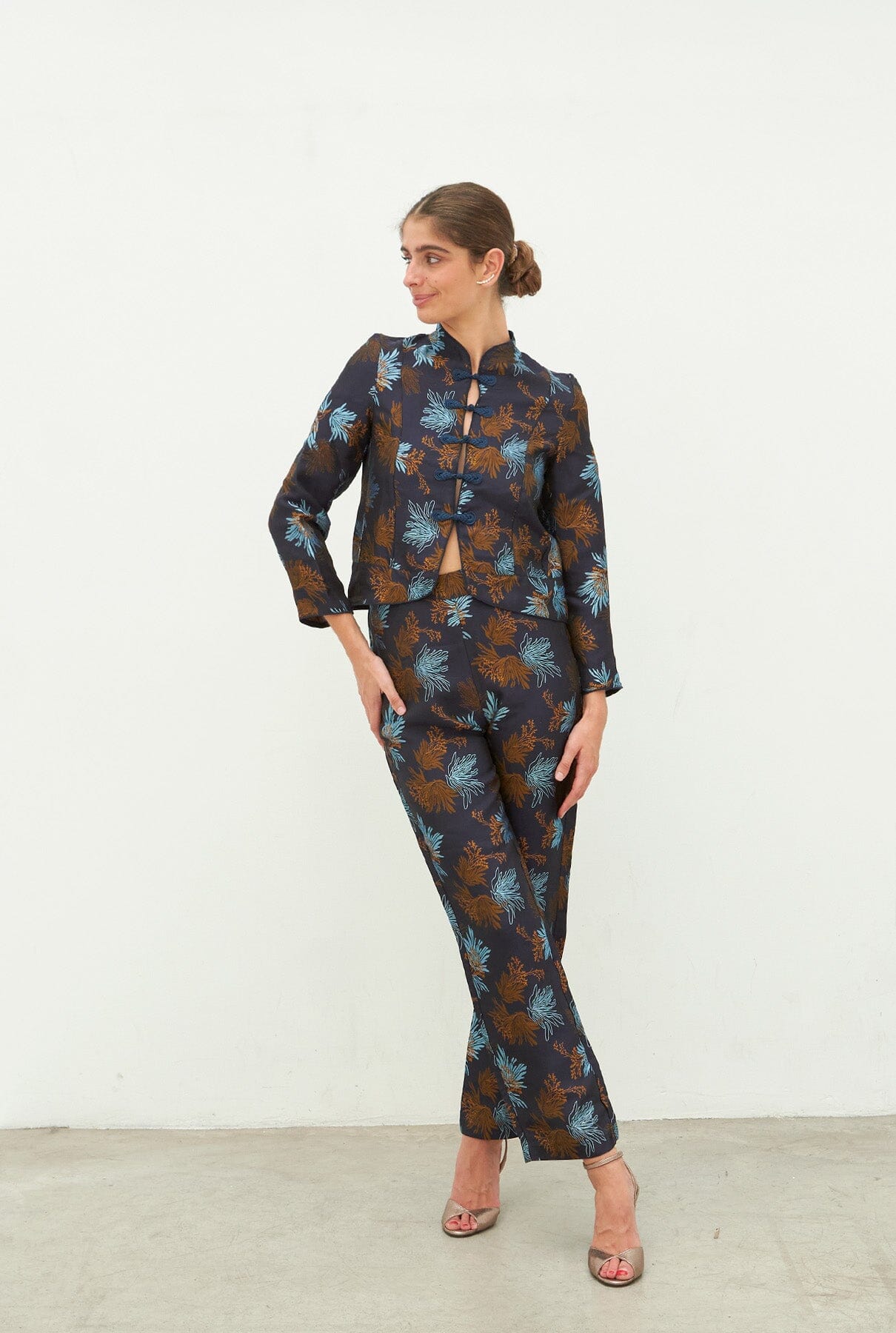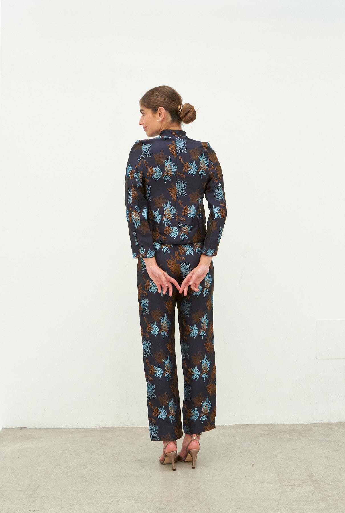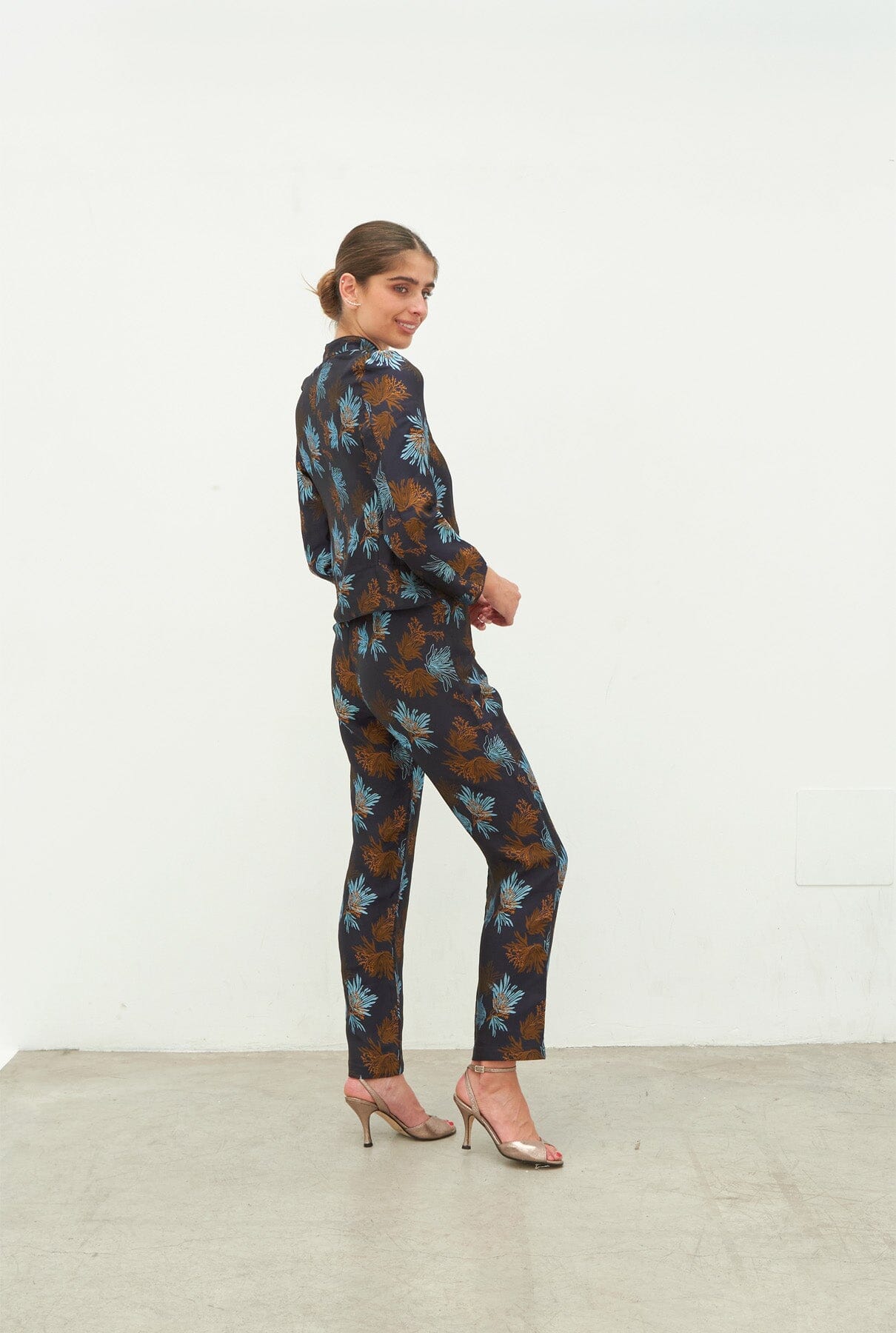 Pantalón sofisticado en color azul oscuro y bronce con estampado de flores.