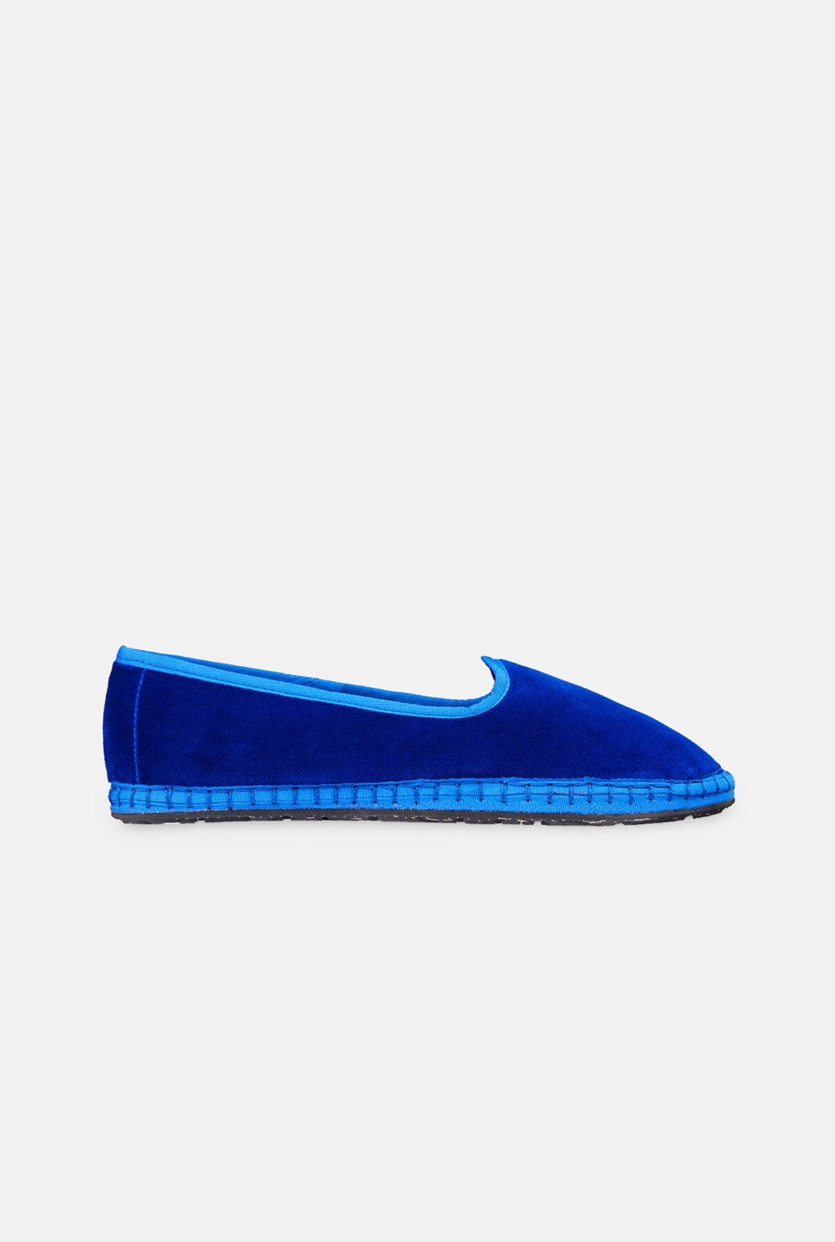 Zapatilla de terciopelo azul eléctrico con ribetes azules. El exterior del zapato es 100% terciopelo de algodón, y el interior del zapato es 100% algodón ecológico con tratamiento antibacteriano. La suela está hecha de caucho producido a partir de neumáticos de bicicleta reciclados.