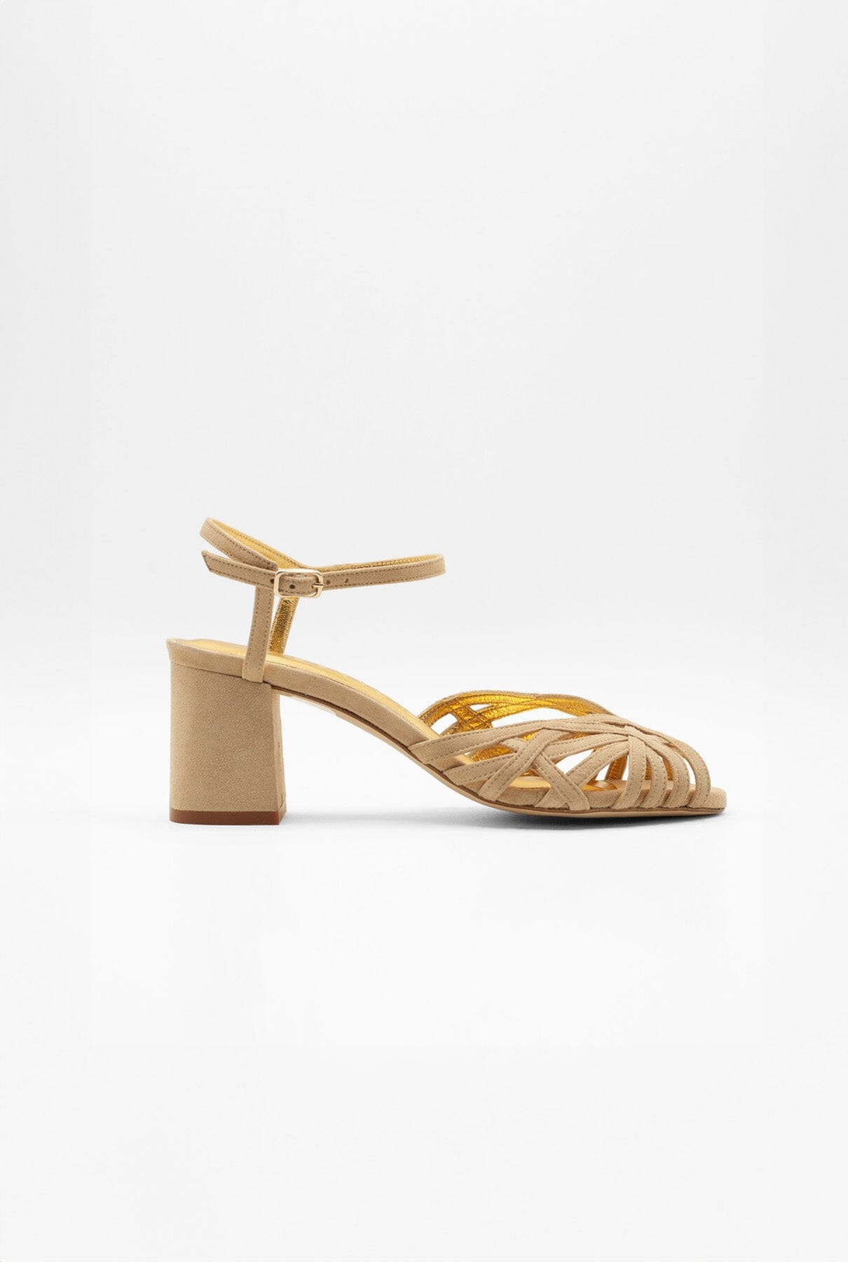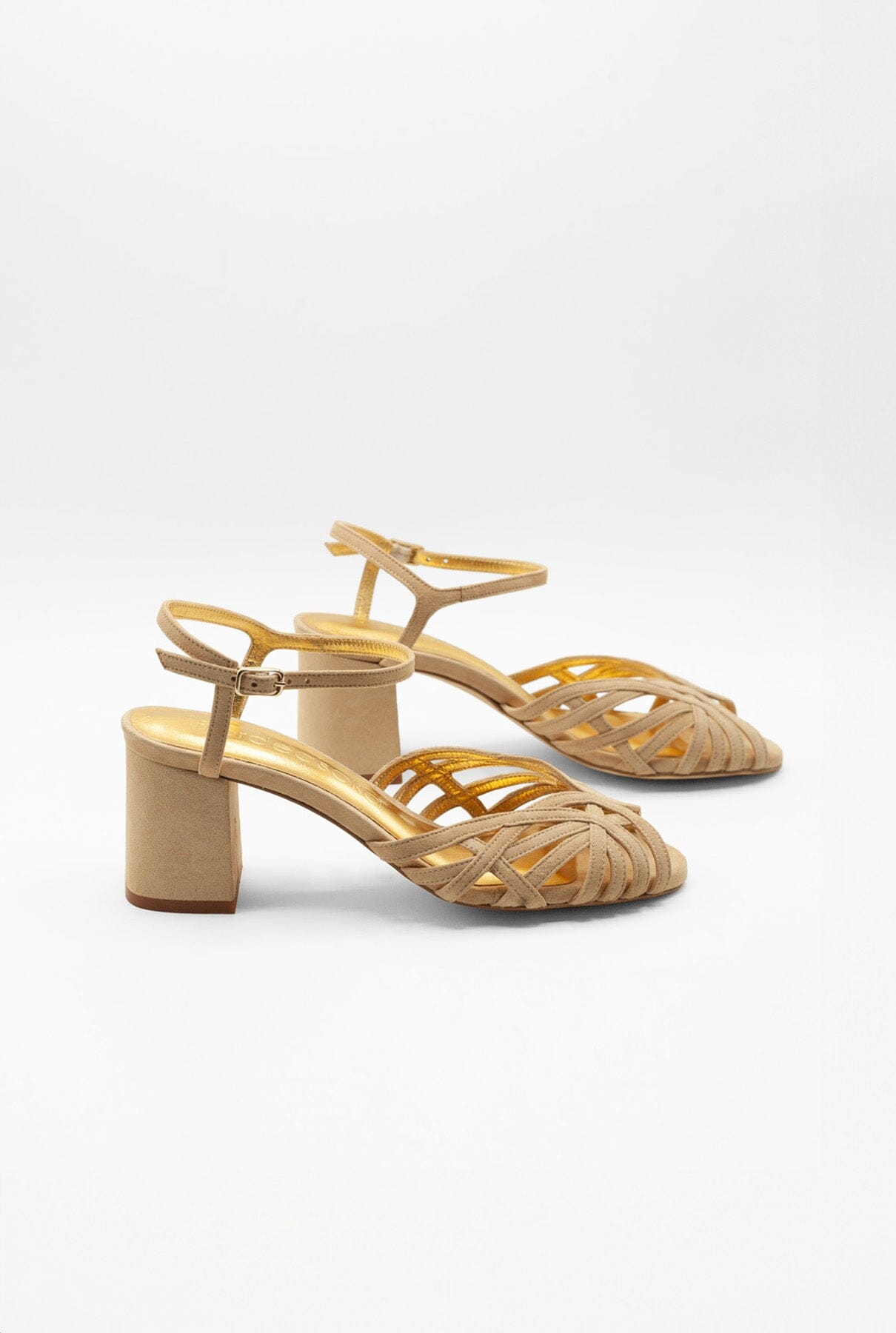 Sandalias de tiras beige con detalles dorados diseñadas para novias e invitadas, hechas a mano 100% en España. Tacón bajo, cómodo y estable. Plantilla acolchada para mayor comodidad.