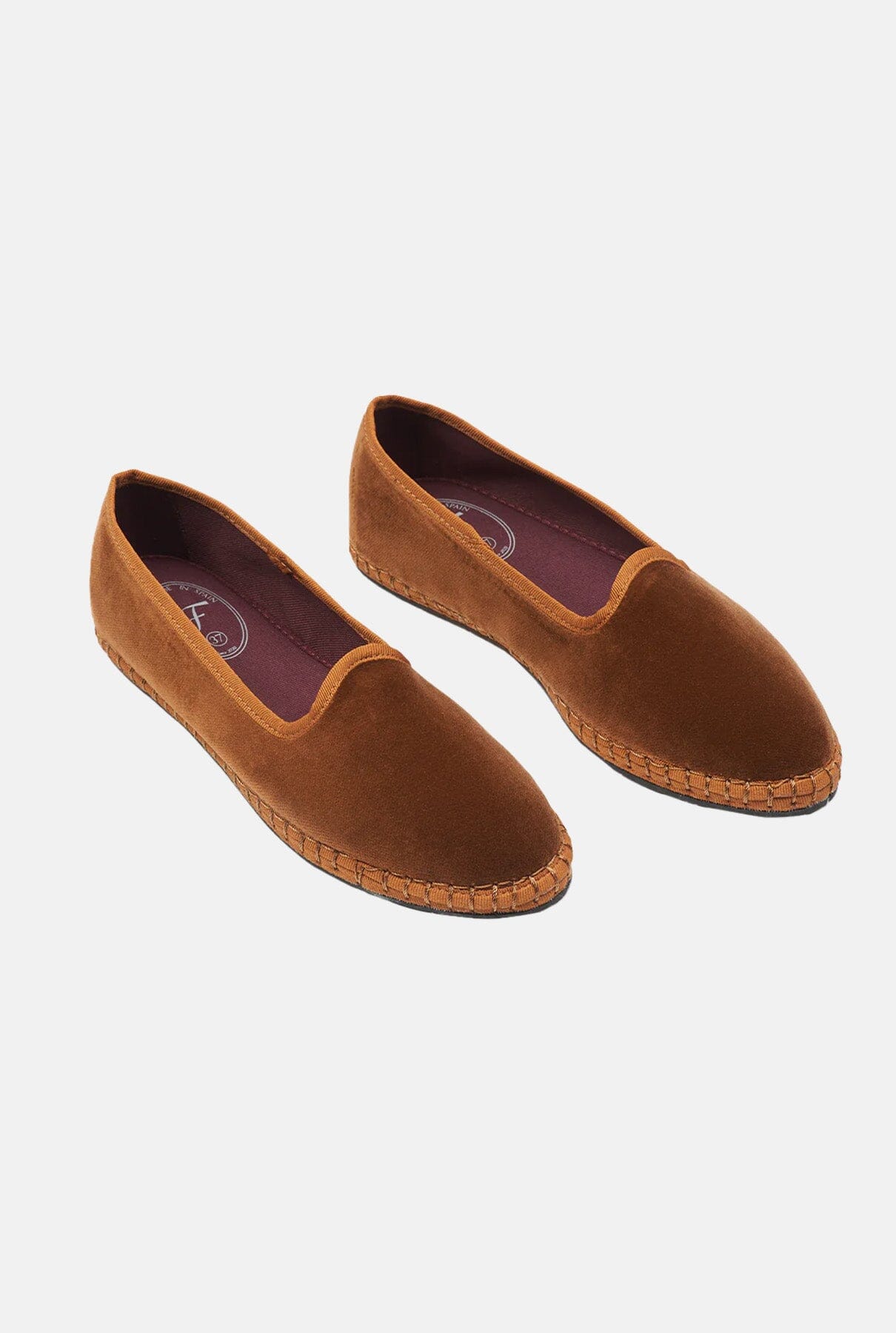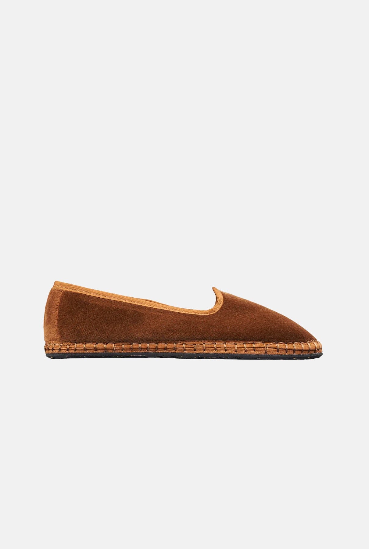 Zapatilla de terciopelo marrón con ribetes a contraste marrón. El exterior del zapato es 100% terciopelo de algodón, y el interior del zapato es 100% algodón orgánico con tratamiento antibacteriano. La suela está hecha de caucho producido a partir de neumáticos de bicicleta reciclados.