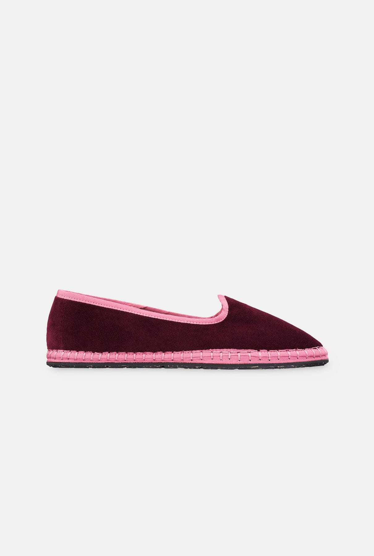 Zapatilla de terciopelo burdeos con vivos a contraste rosa claro. El exterior del zapato es 100% terciopelo de algodón, y el interior del zapato es 100% algodón ecológico con tratamiento antibacteriano. La suela está hecha de caucho producido a partir de neumáticos de bicicleta reciclados.