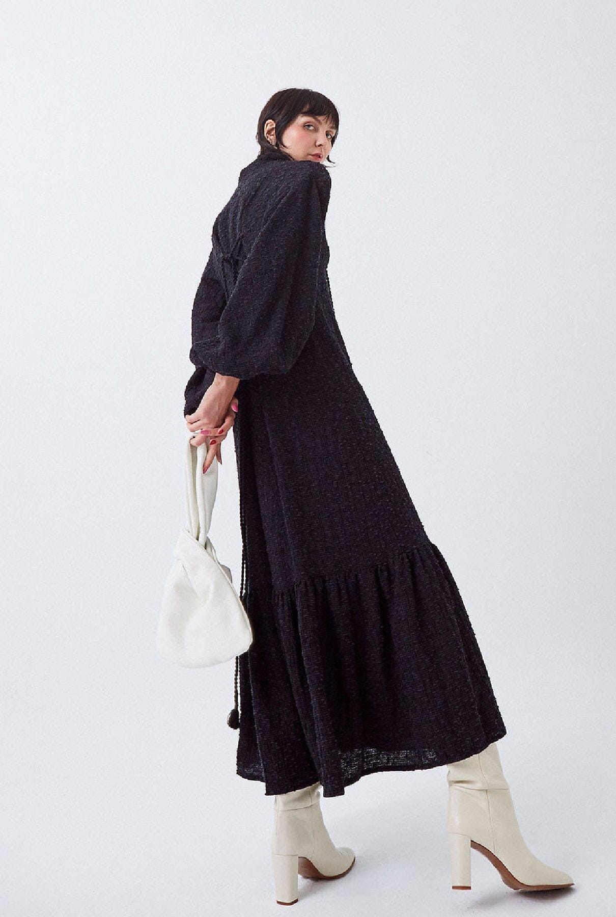 Vestido largo de tweed con mangas abullonadas, escote en pico y volante en el bajo. Tiras de adorno ajustables en pecho y espalda.