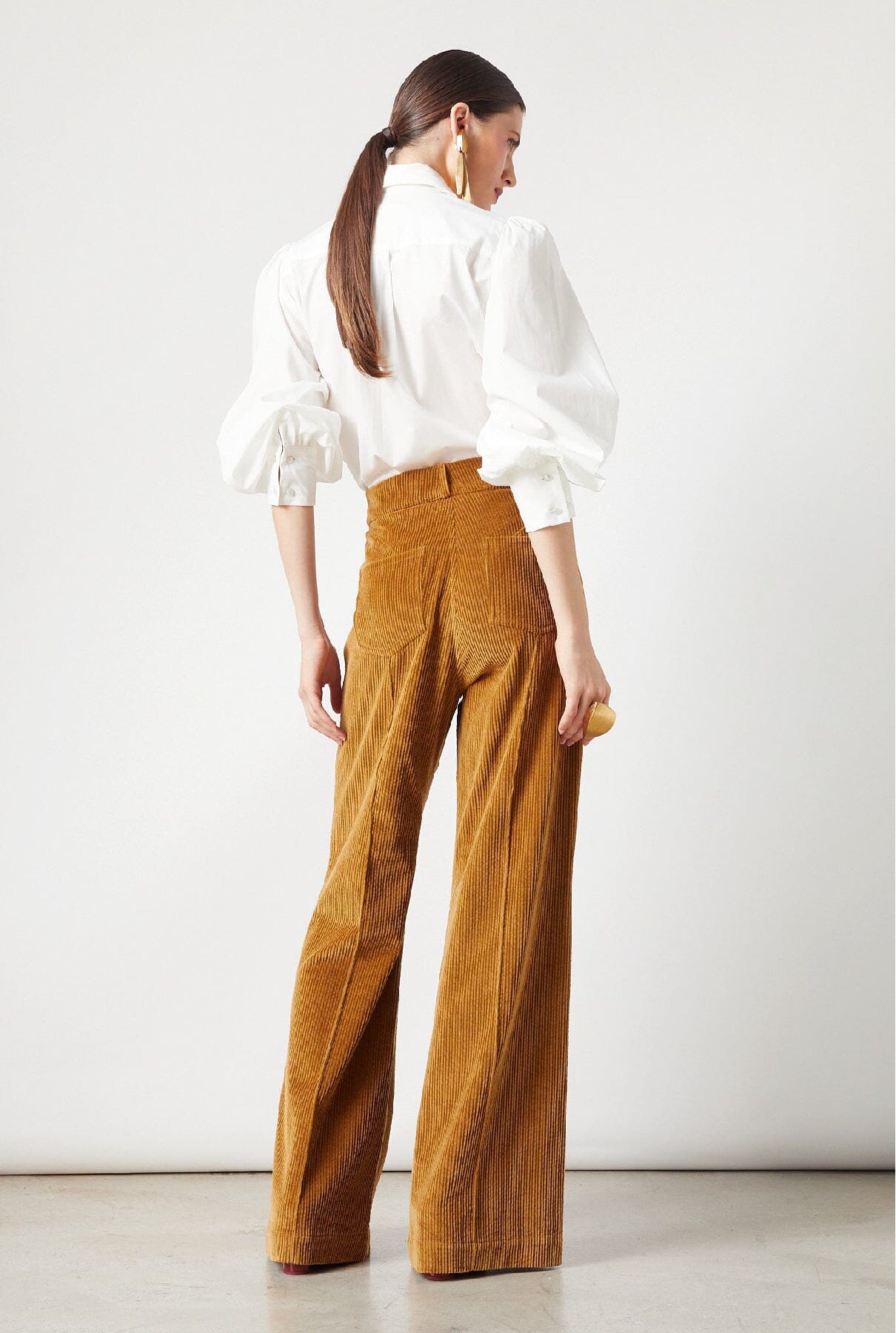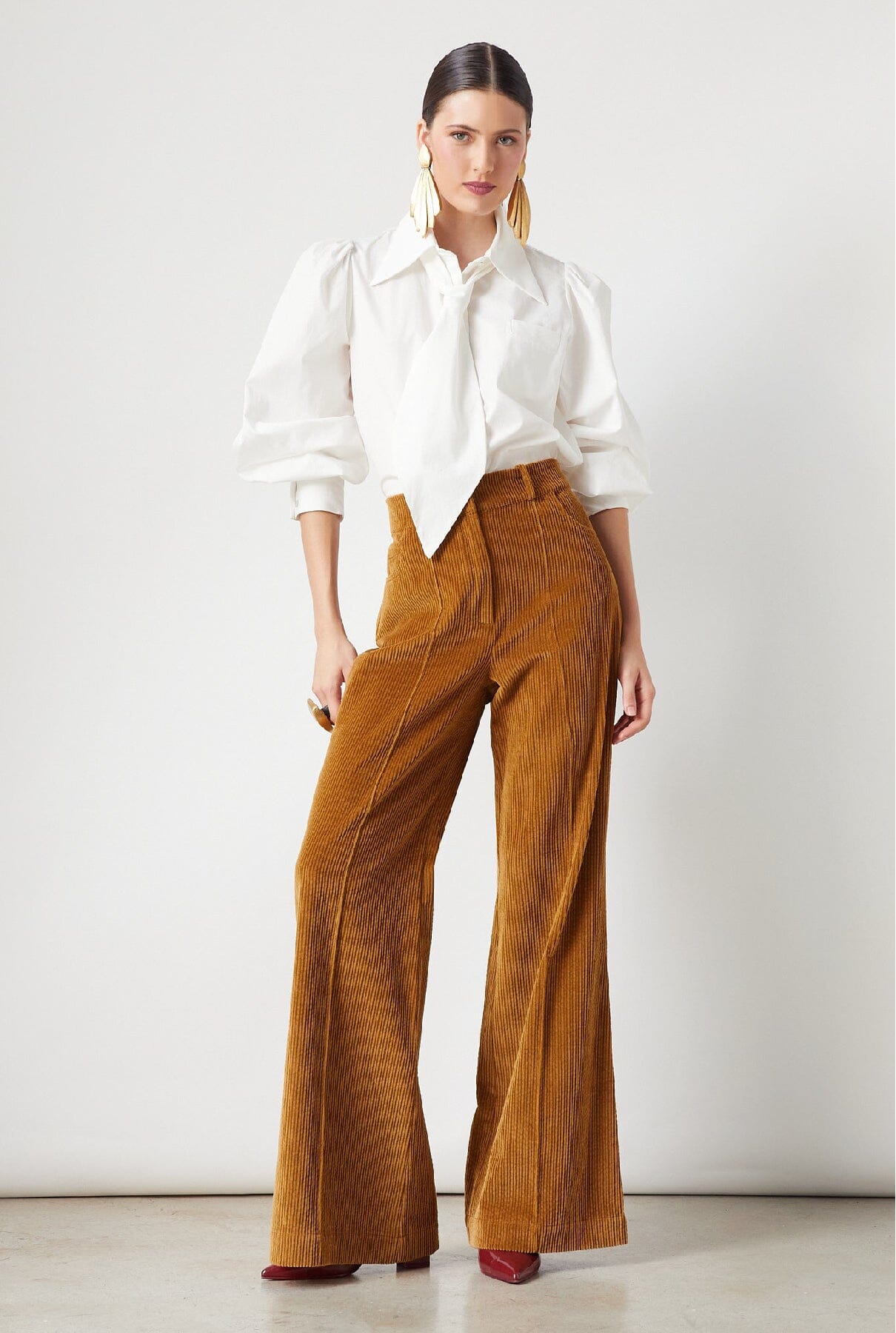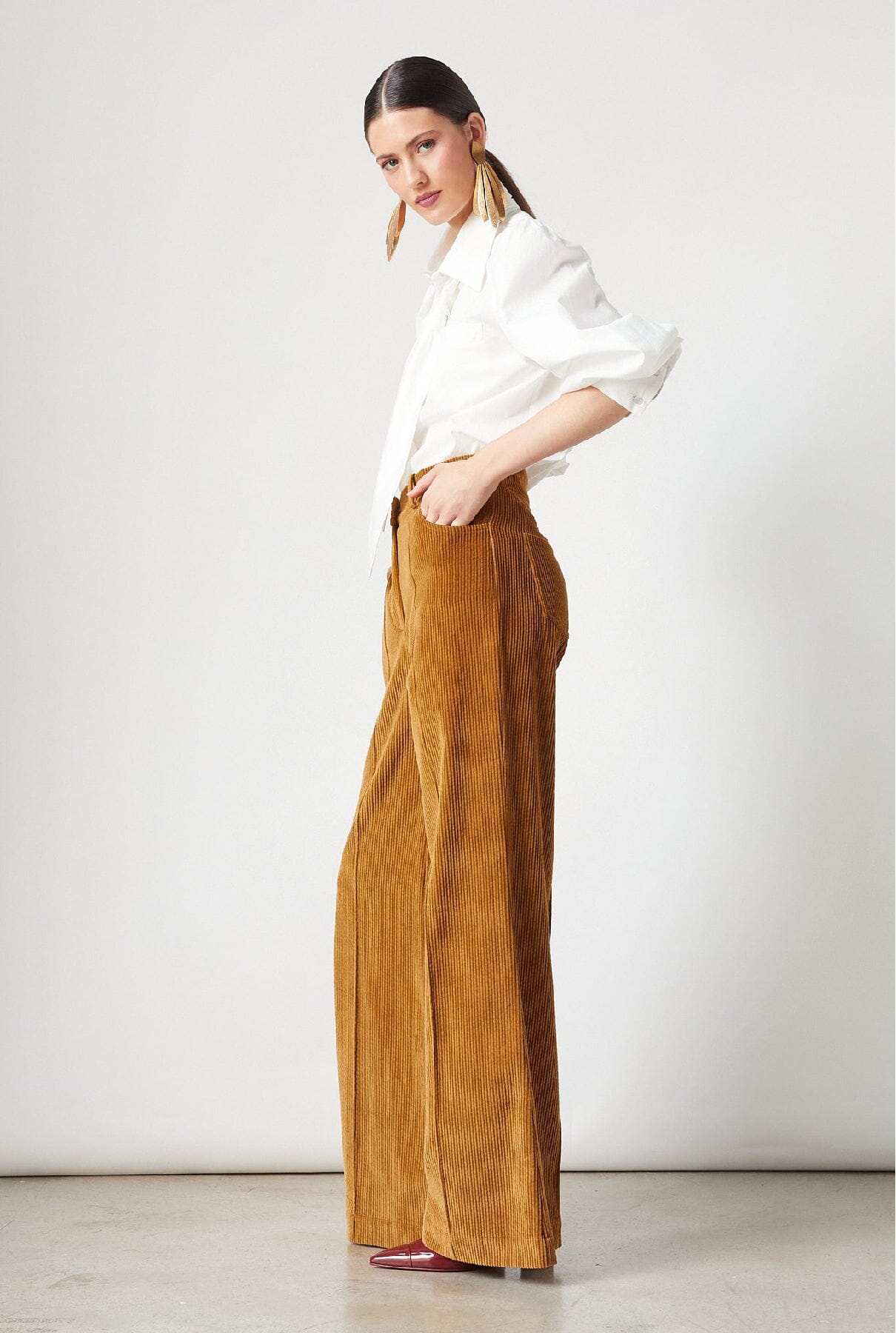 Estos pantalones de tiro alto y pierna ancha, que recuerdan a los años 70, están confeccionados en pana color mostaza. Están diseñados para resaltar tu lado femenino y elegante, permitiéndote hacer una declaración de estilo y confianza.