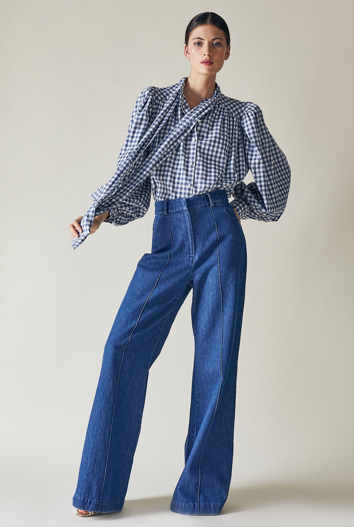 Estos pantalones de tiro alto y pierna ancha, que recuerdan a los años 70, están confeccionados con denim oscuro de primera calidad. Diseñados para resaltar tu lado femenino y elegante, permitiéndote hacer una declaración segura y con estilo.