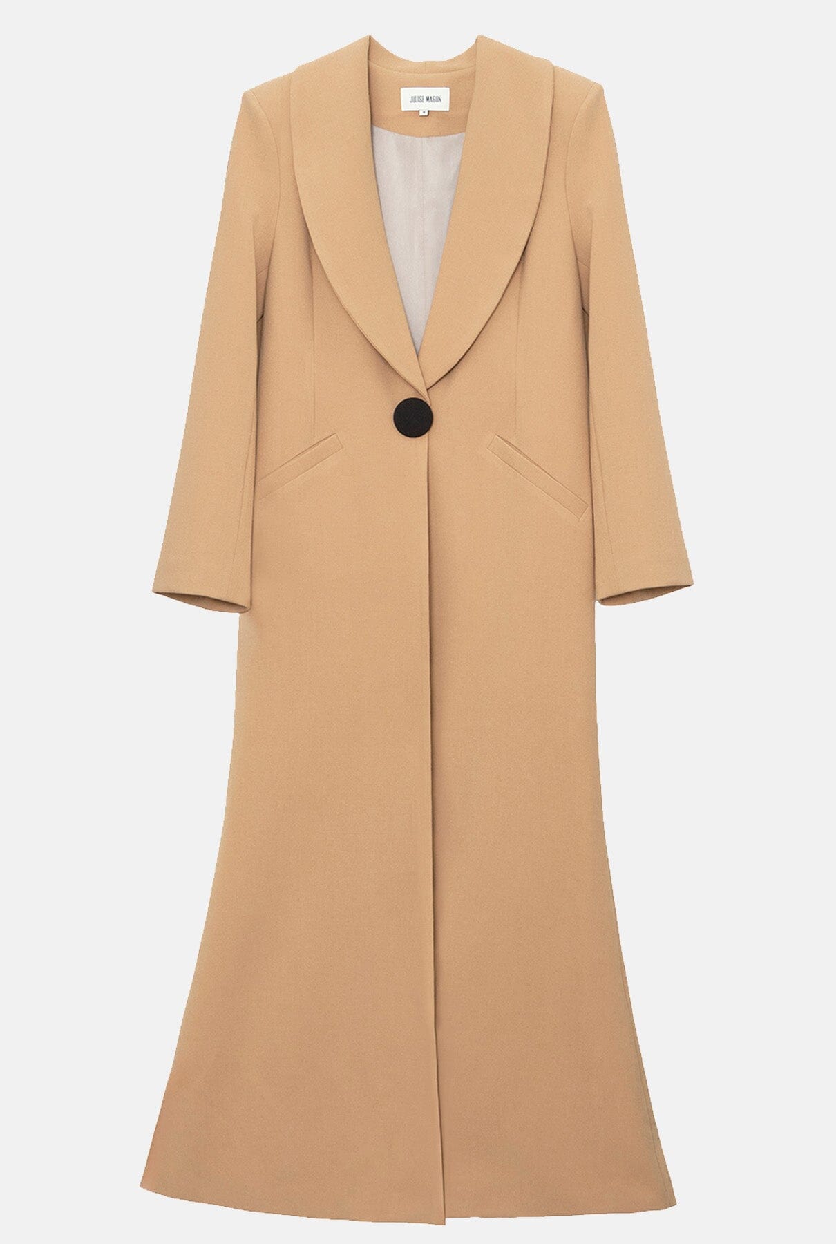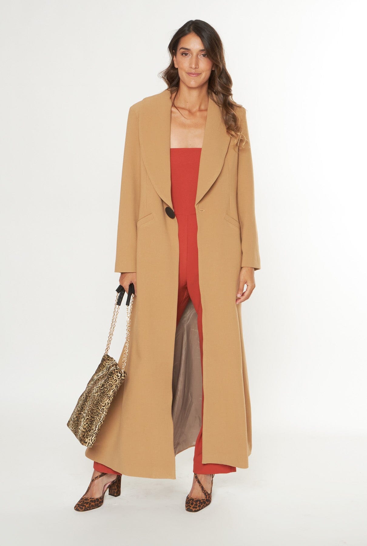 Abrigo largo de corte evasé en el bajo y confeccionado en tejido ligeramente elástico. Cuello tipo smoking y cierre de botones forrados con el mismo tejido en color negro. Con hombreras. Bolsillos laterales en la parte delantera y ocultos en el interior.