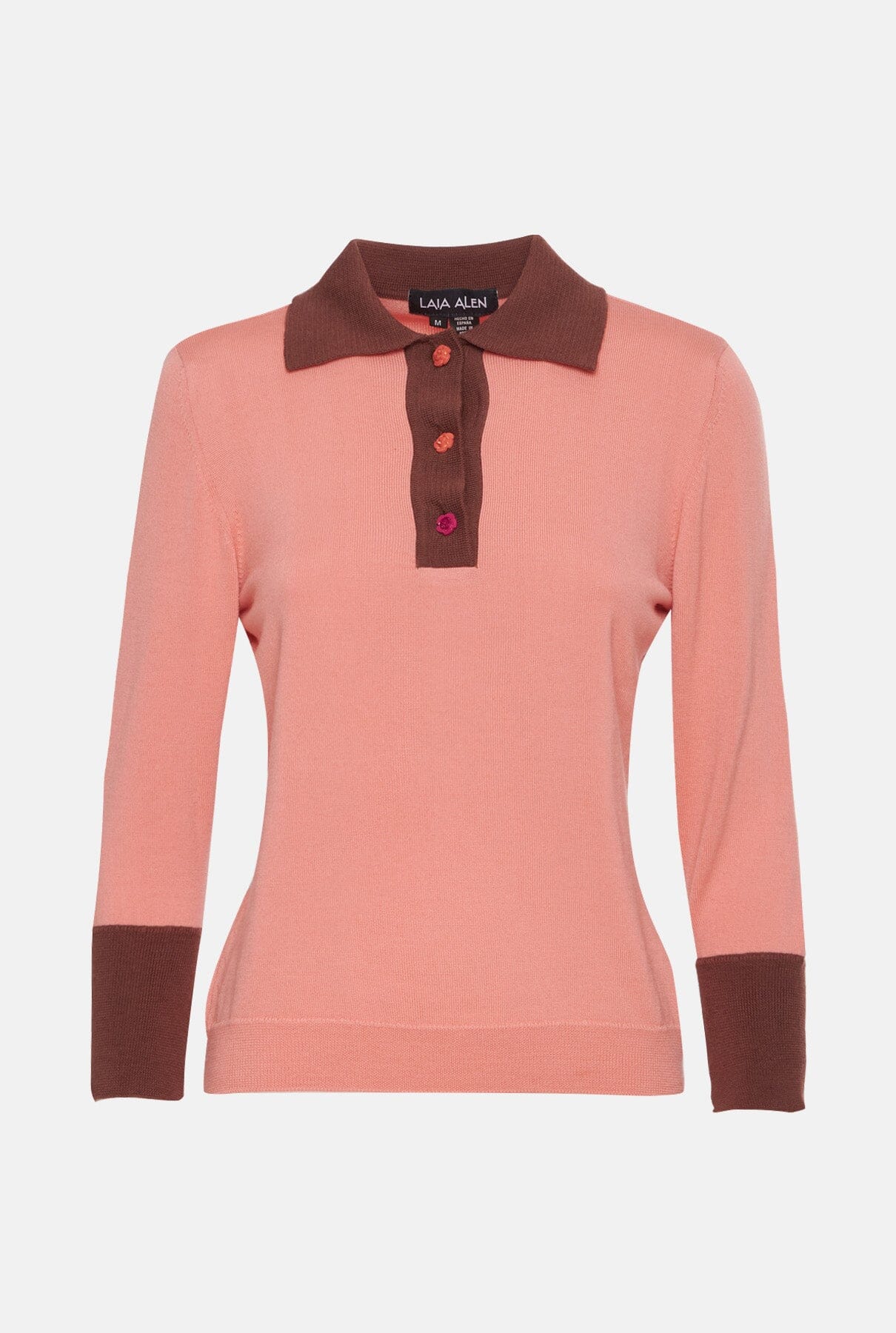 Este suéter está elaborado con una mezcla de lana de alta calidad y cachemira para lograr un tacto maravillosamente suave. El Emily Polo Pink está fabricado en España con un cuello en contraste y botones adornados con flores que refuerzan el amor de la marca por los detalles. Combínalo con jeans y mocasines. Las mangas son de ¾ de largo.