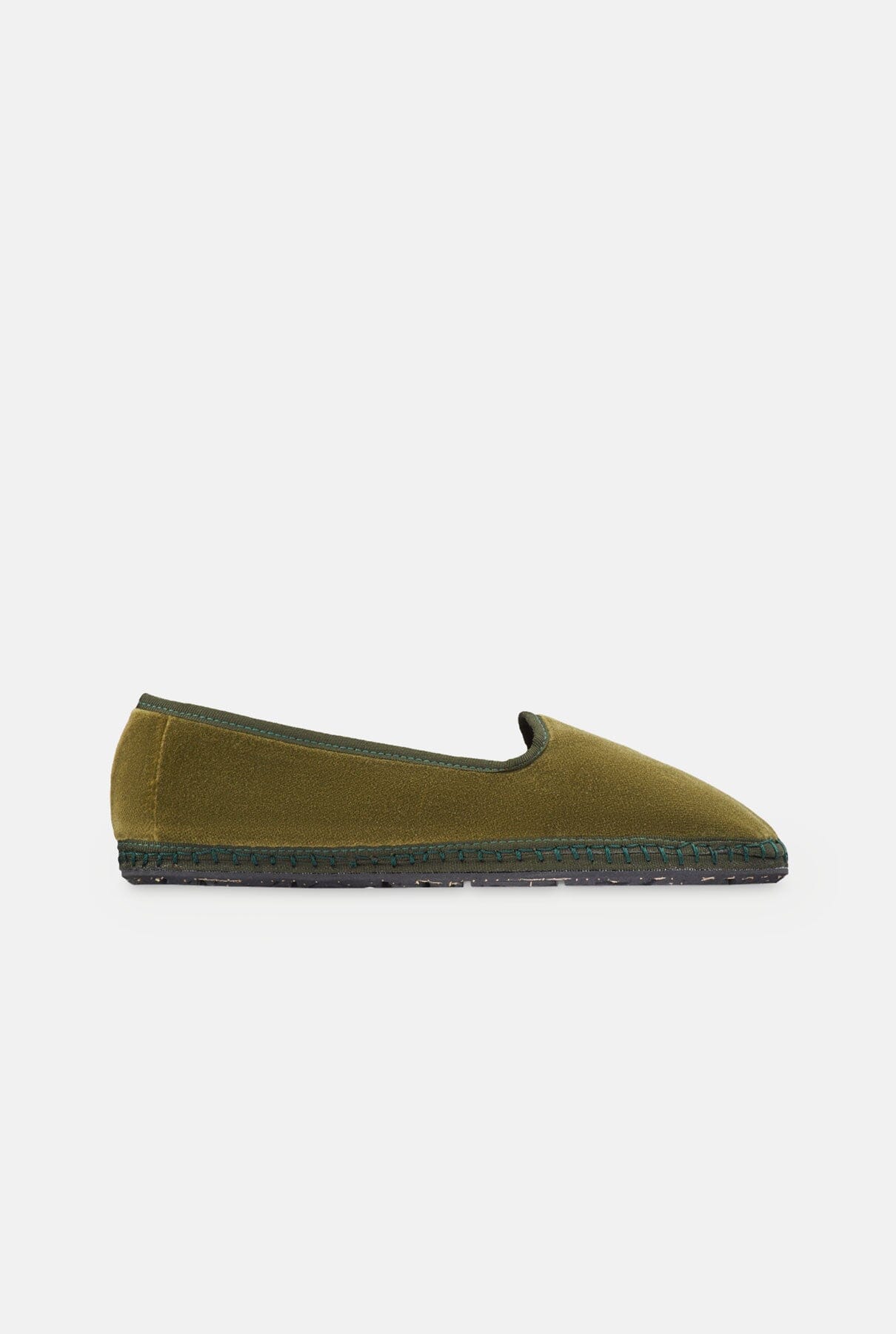 Zapatilla de terciopelo verde militar con ribetes verde militar. El exterior del zapato es 100% terciopelo de algodón, y el interior del zapato es 100% algodón ecológico con tratamiento antibacteriano. La suela está hecha de caucho producido a partir de neumáticos de bicicleta reciclados.