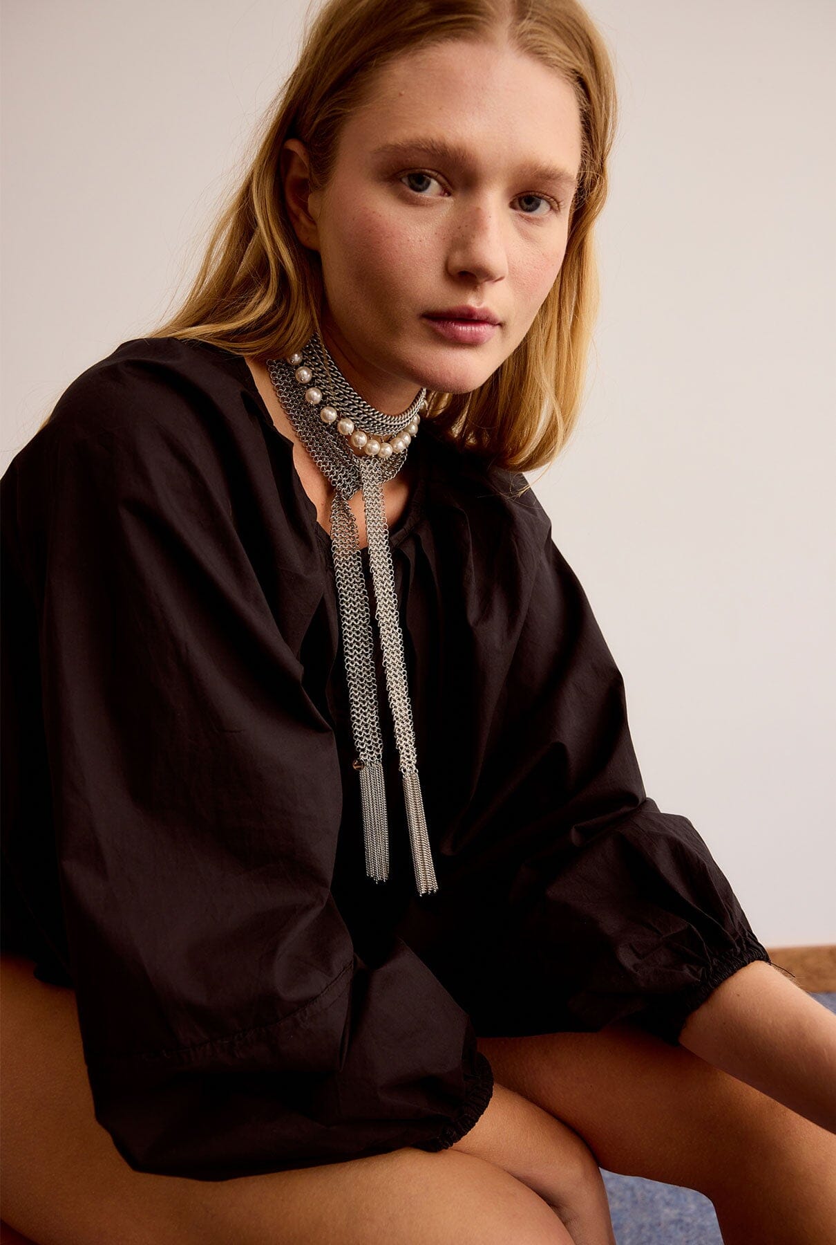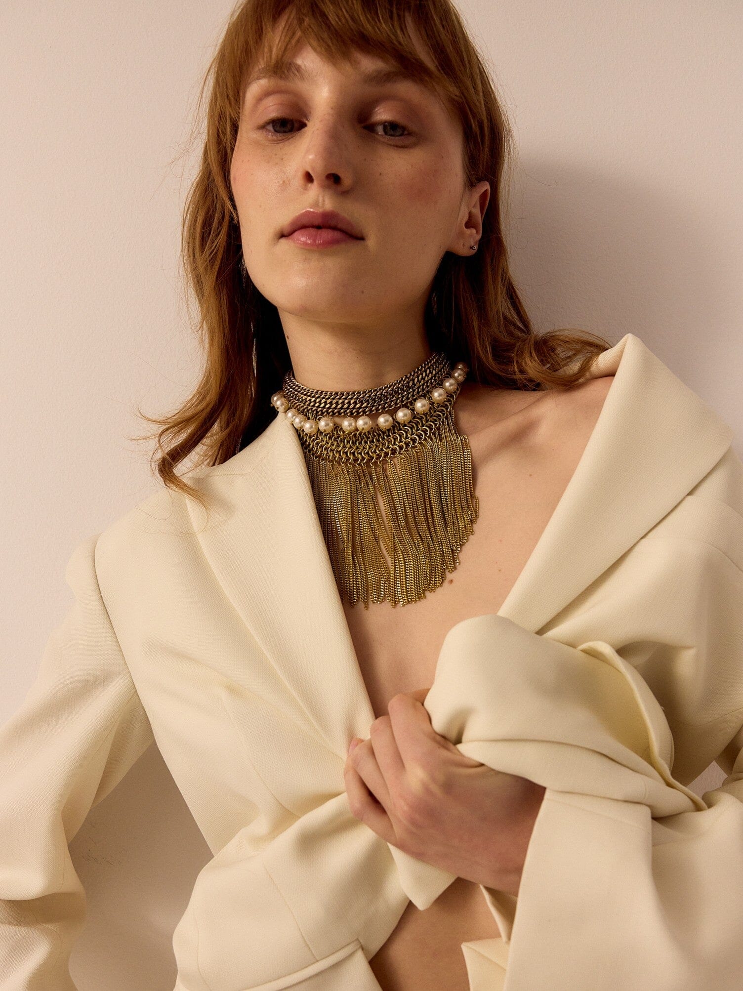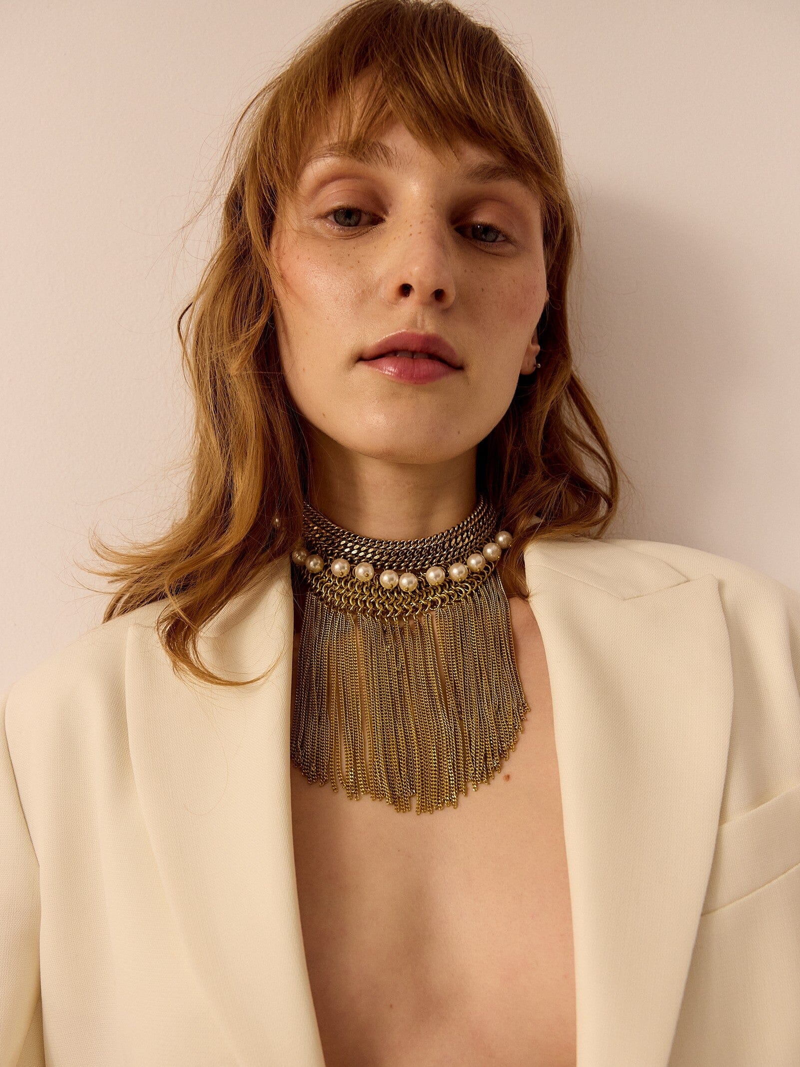 Short necklace, made with a choker chain/mesh and crystal core pearl pendants