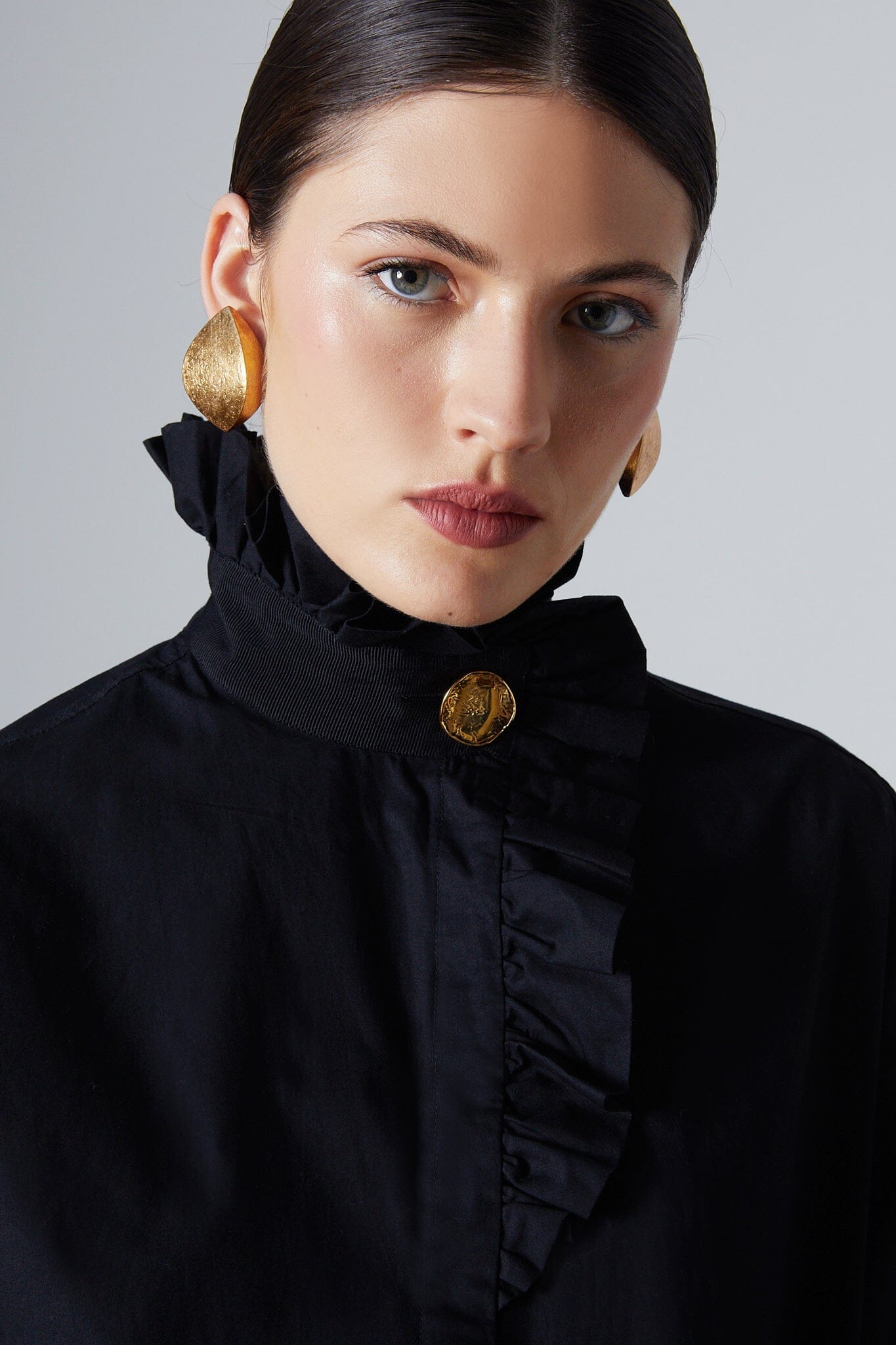 Exclusiva, atemporal y honesta: una versión en negro de la camisa que lleva nuestro ADN hasta los huesos. Camisa de manga larga con puños con volantes y cuello con botones bañados en oro. Fabricada localmente en España.