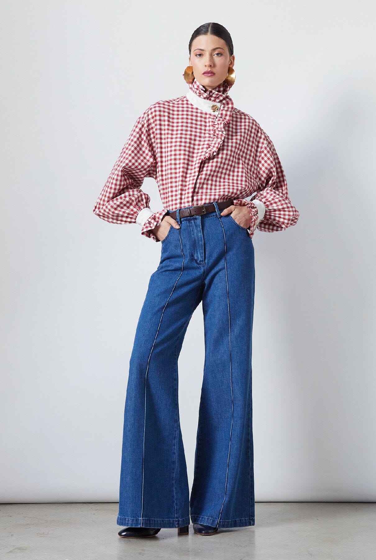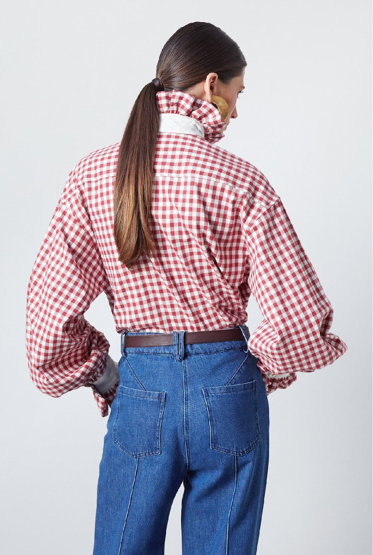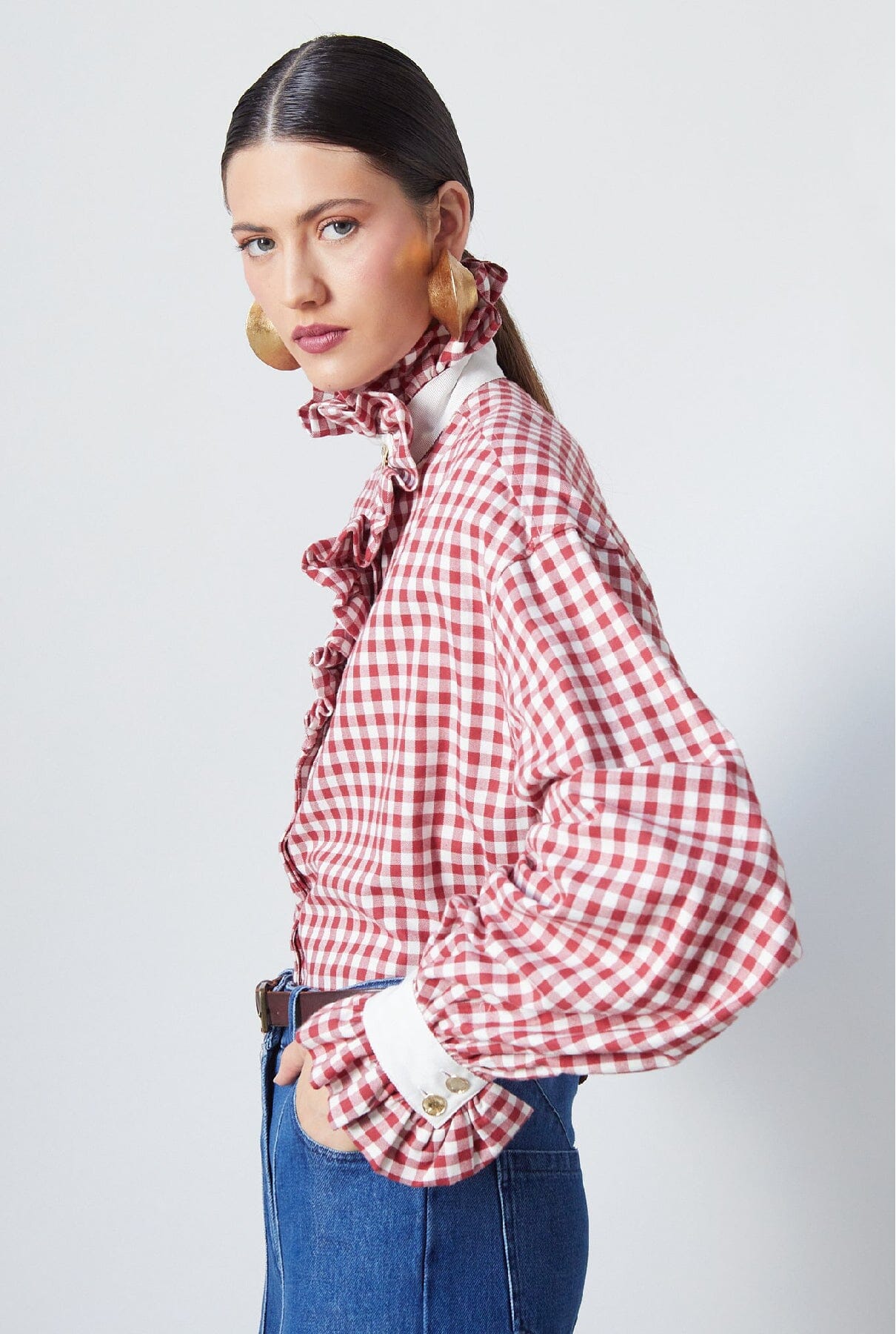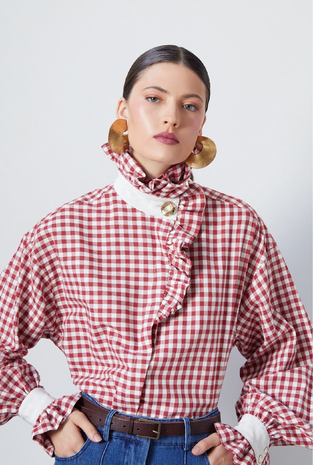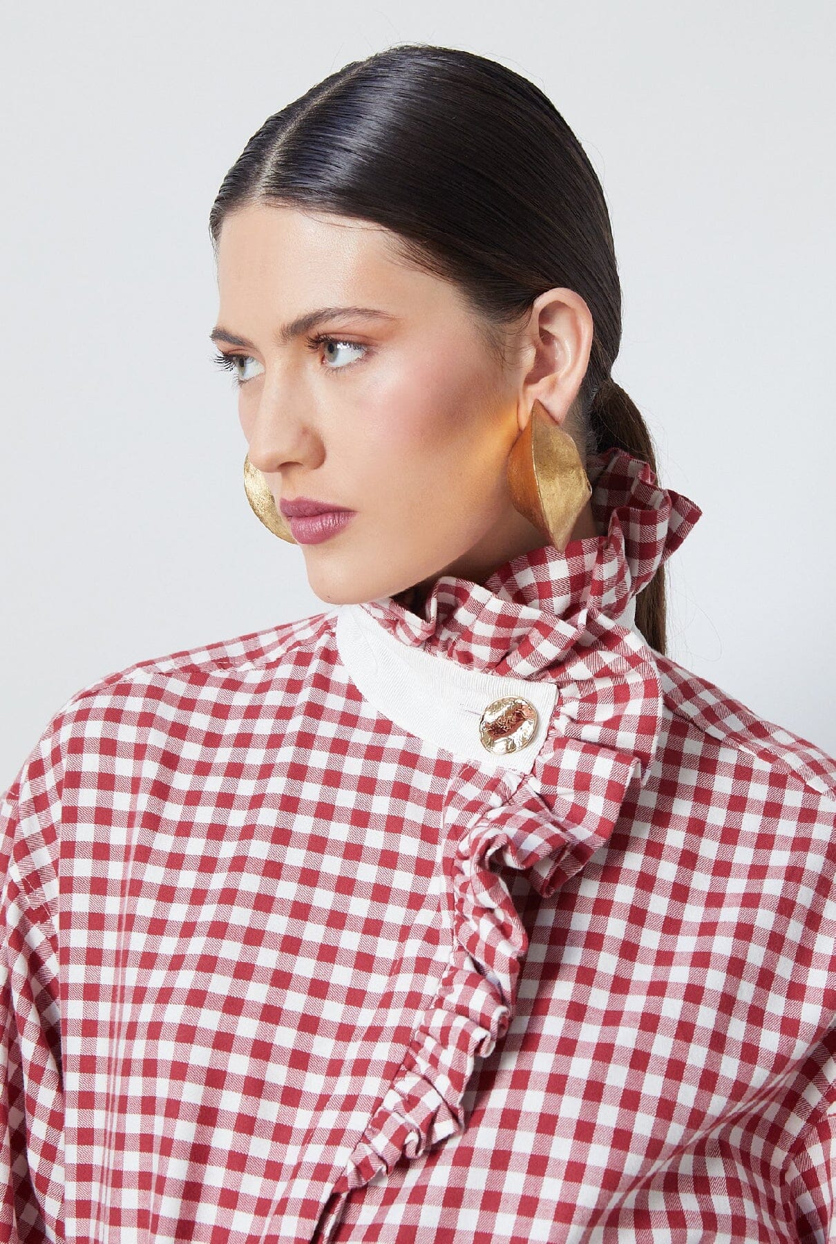 Exclusiva, atemporal y honesta: una nueva versión de la camisa que lleva nuestro ADN hasta los huesos. Camisa de manga larga con puños con volantes y cuello con botones bañados en oro en vichy rojo. Fabricada localmente en España.