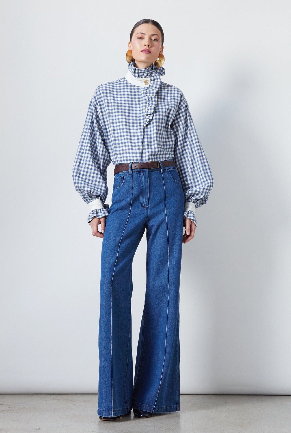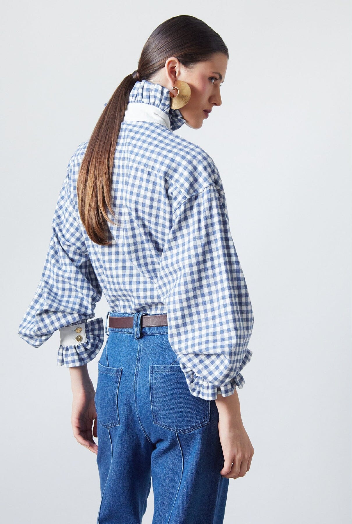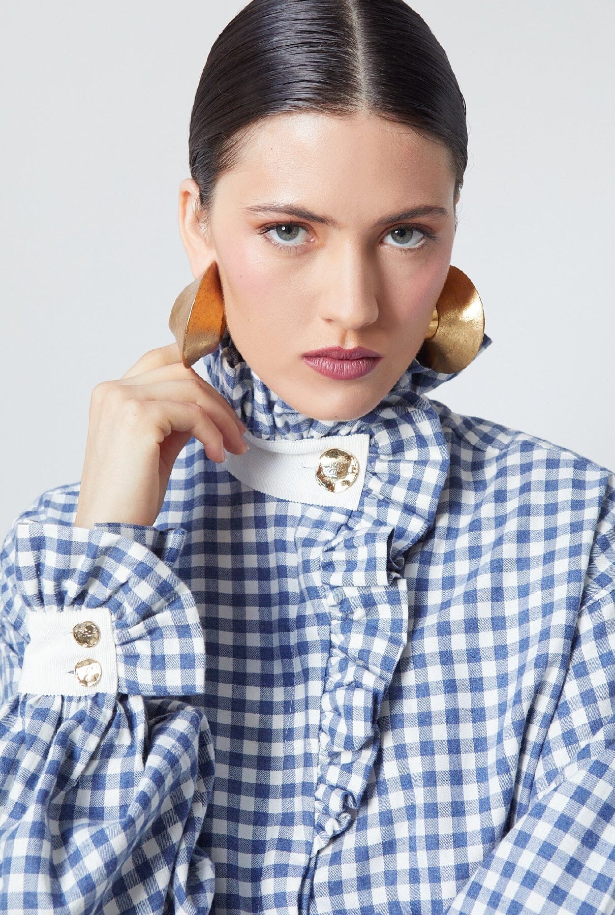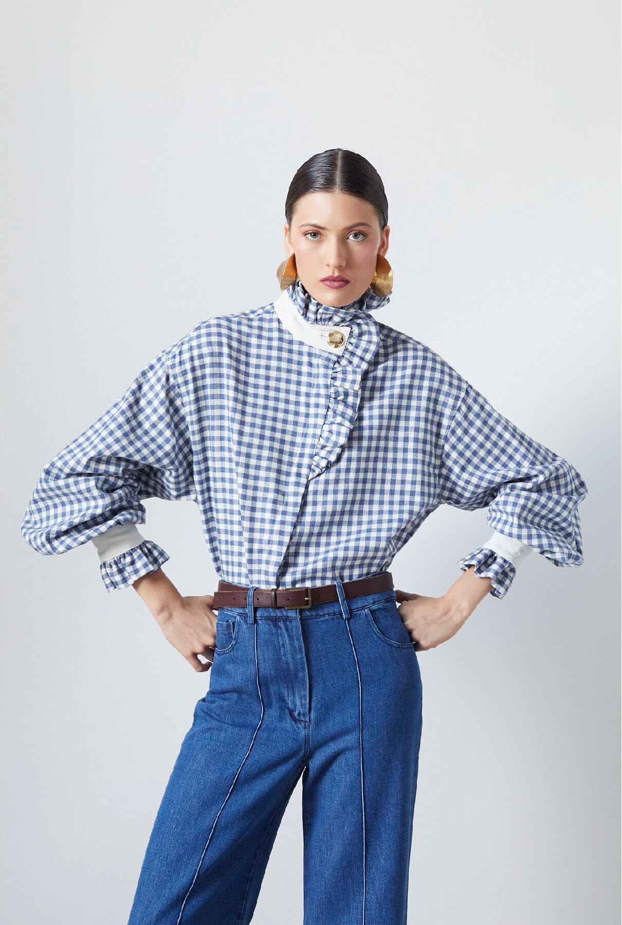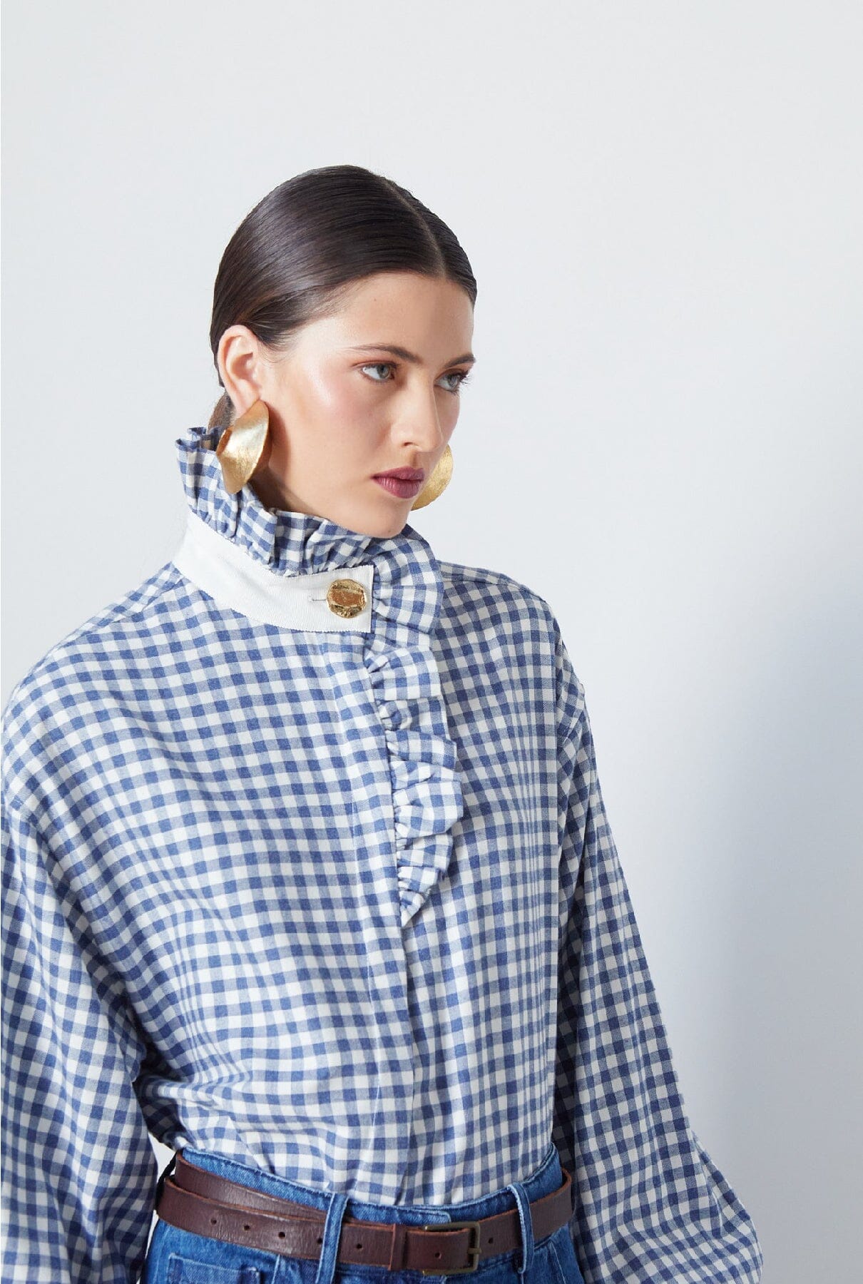 Exclusiva, atemporal y honesta: una nueva versión de la camisa que lleva nuestro ADN hasta los huesos. Camisa de manga larga con puños con volantes y cuello con botones bañados en oro en vichy azul marino. Fabricada localmente en España.