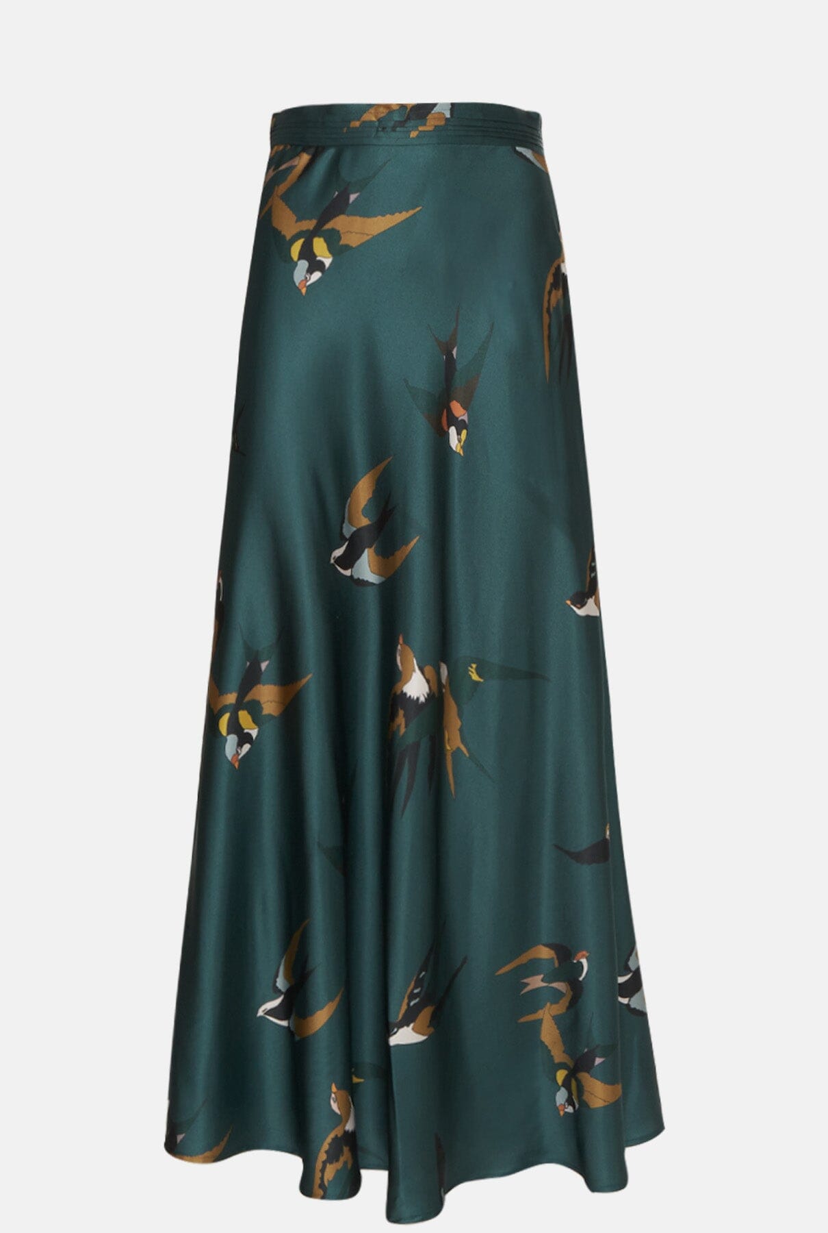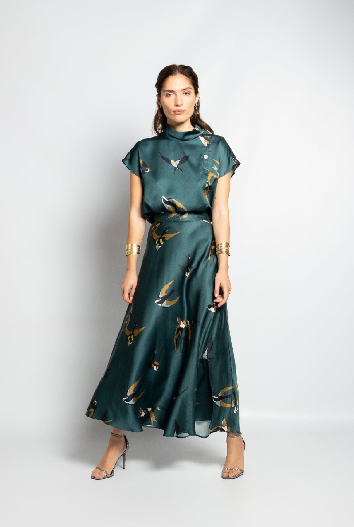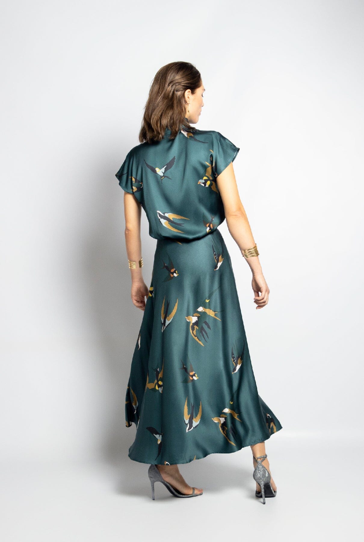 Falda muy amplia con mucho vuelo y movimiento. La falda está cortada en capas y lleva bies en varios puntos, de forma que, con la caída del tejido, el resultado es una falda con un movimiento espectacular. El bajo es ligeramente irregular y la cremallera está en el lado izquierdo. La cinturilla está detallada con un detalle de canalé. Tiene largo hasta el tobillo y está confeccionada en tejido 100% viscosa satinada con estampado de pájaros en tonos verde mostaza, negro y crudo.