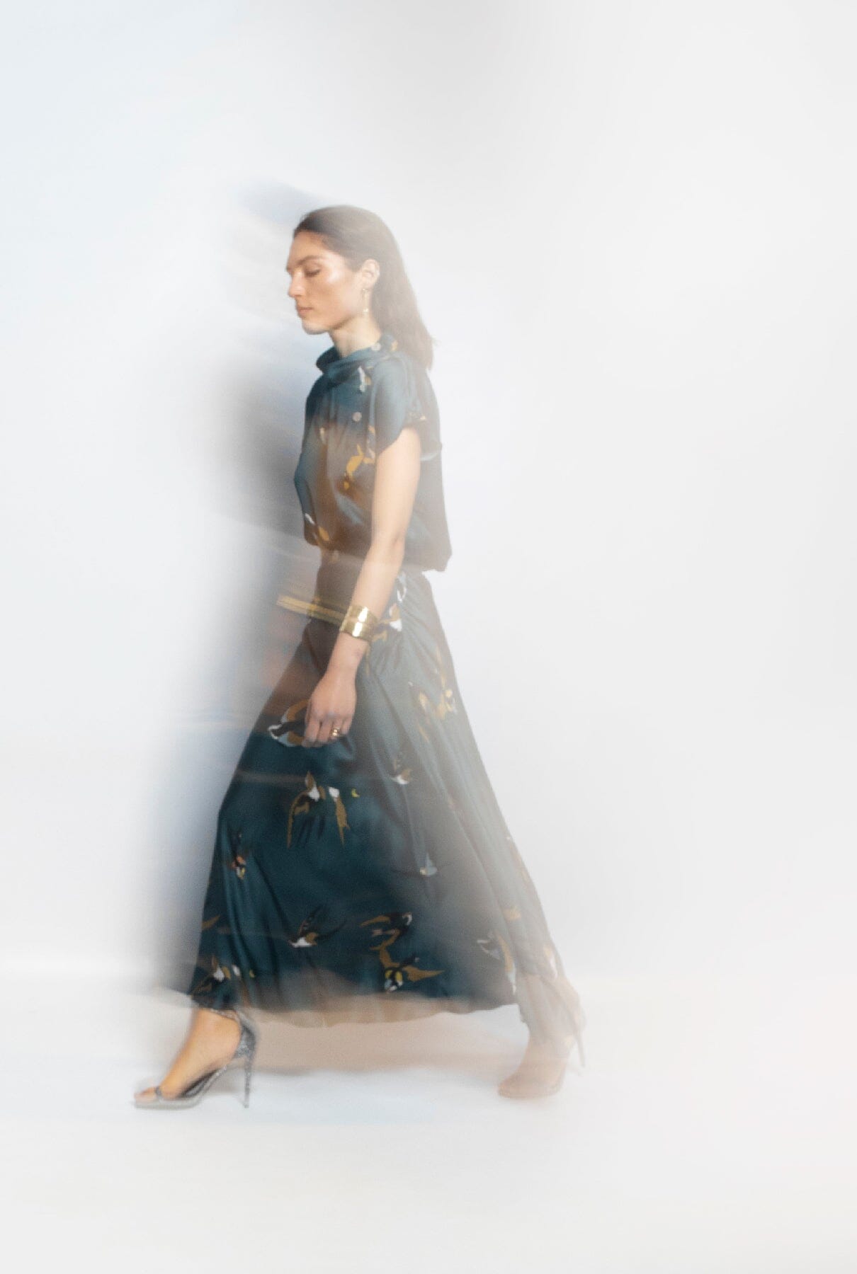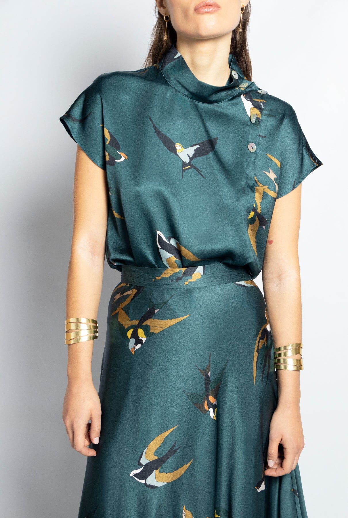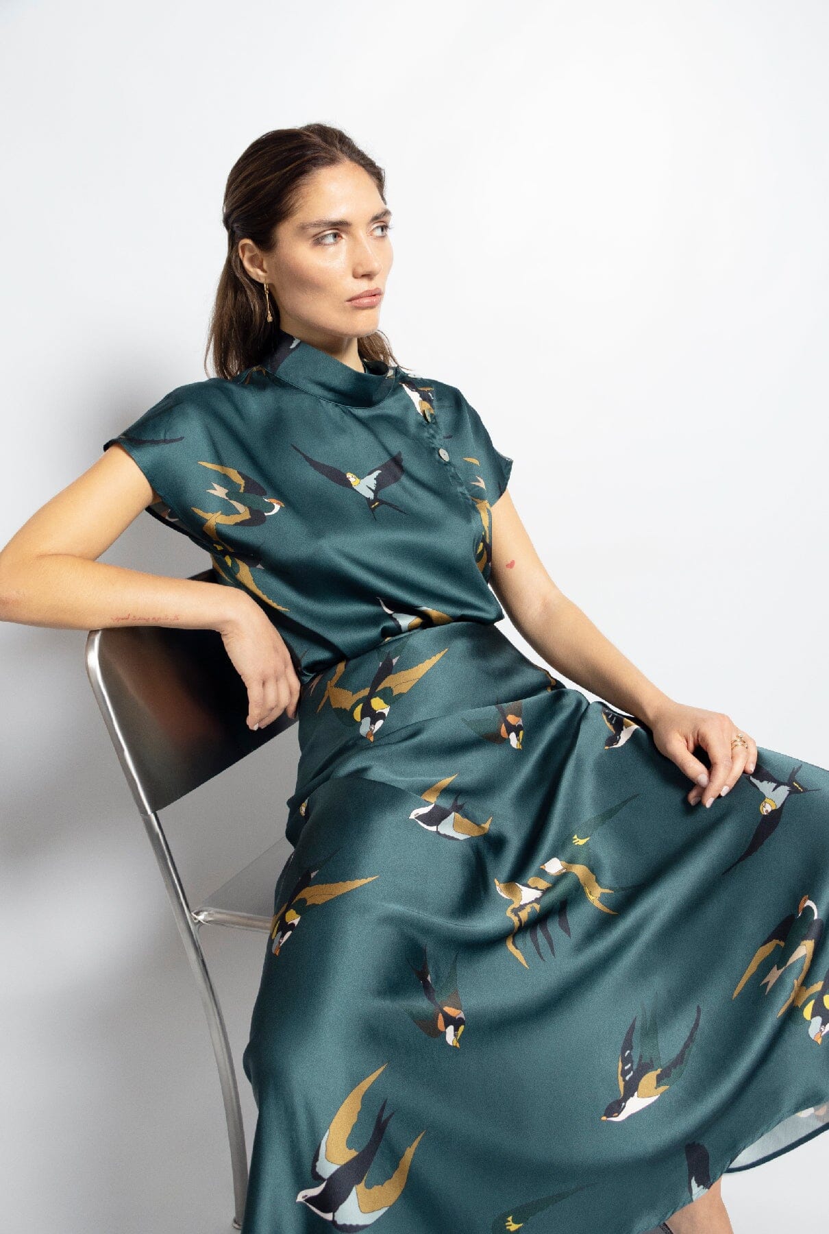 Falda muy amplia con mucho vuelo y movimiento. La falda está cortada en capas y lleva bies en varios puntos, de forma que, con la caída del tejido, el resultado es una falda con un movimiento espectacular. El bajo es ligeramente irregular y la cremallera está en el lado izquierdo. La cinturilla está detallada con un detalle de canalé. Tiene largo hasta el tobillo y está confeccionada en tejido 100% viscosa satinada con estampado de pájaros en tonos verde mostaza, negro y crudo.