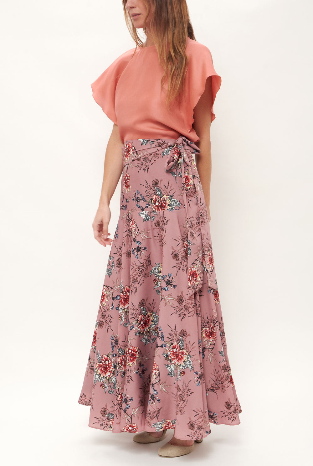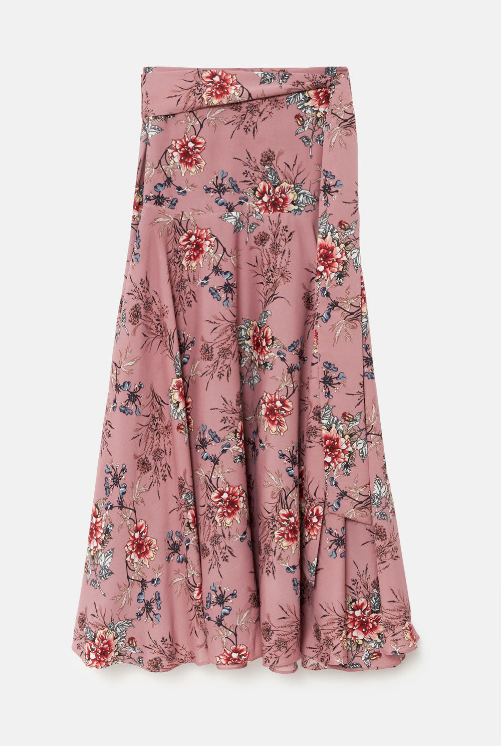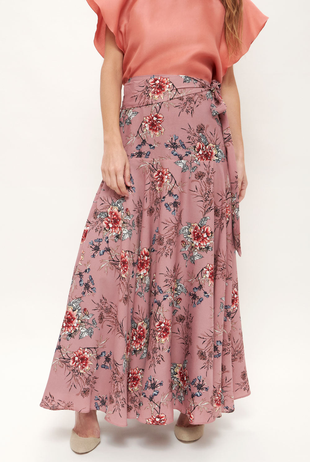 Falda de tiro alto con estampado floral. Cierre de cremallera invisible en espalda. Cinturón de encaje en contraste. Diseñado por Leyre Doueil