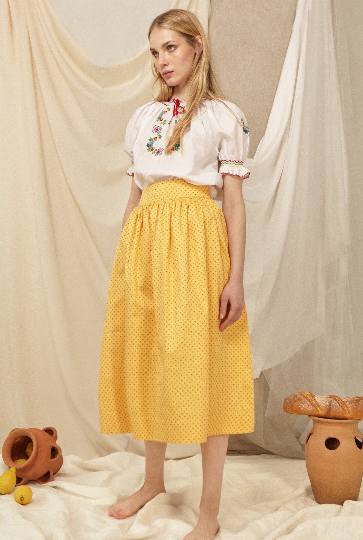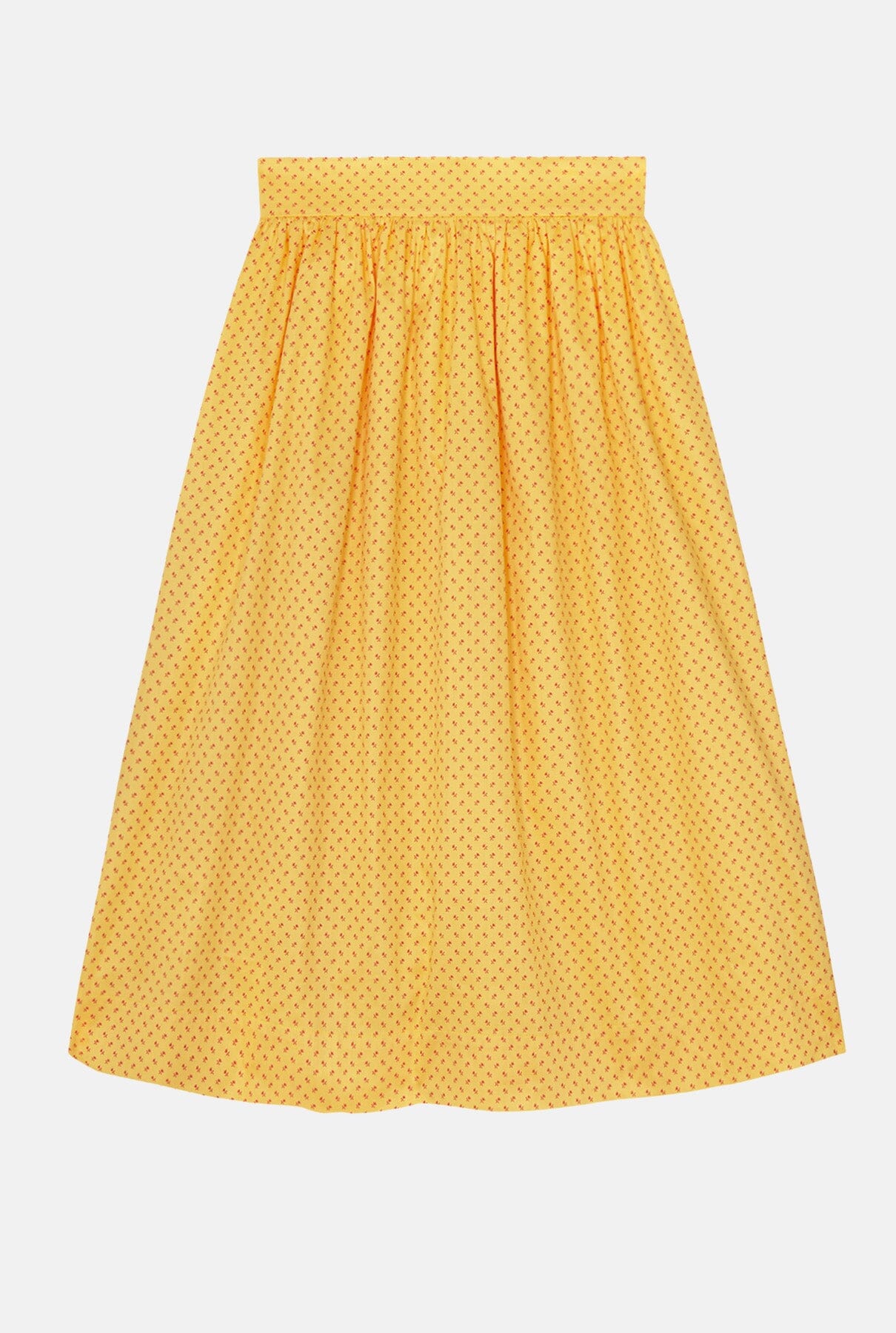 Falda amarilla con estampado floral rojo y forro de voile de algodón.