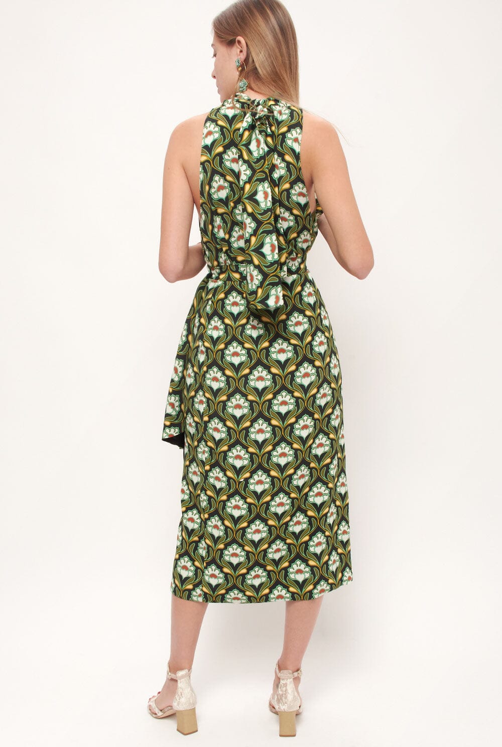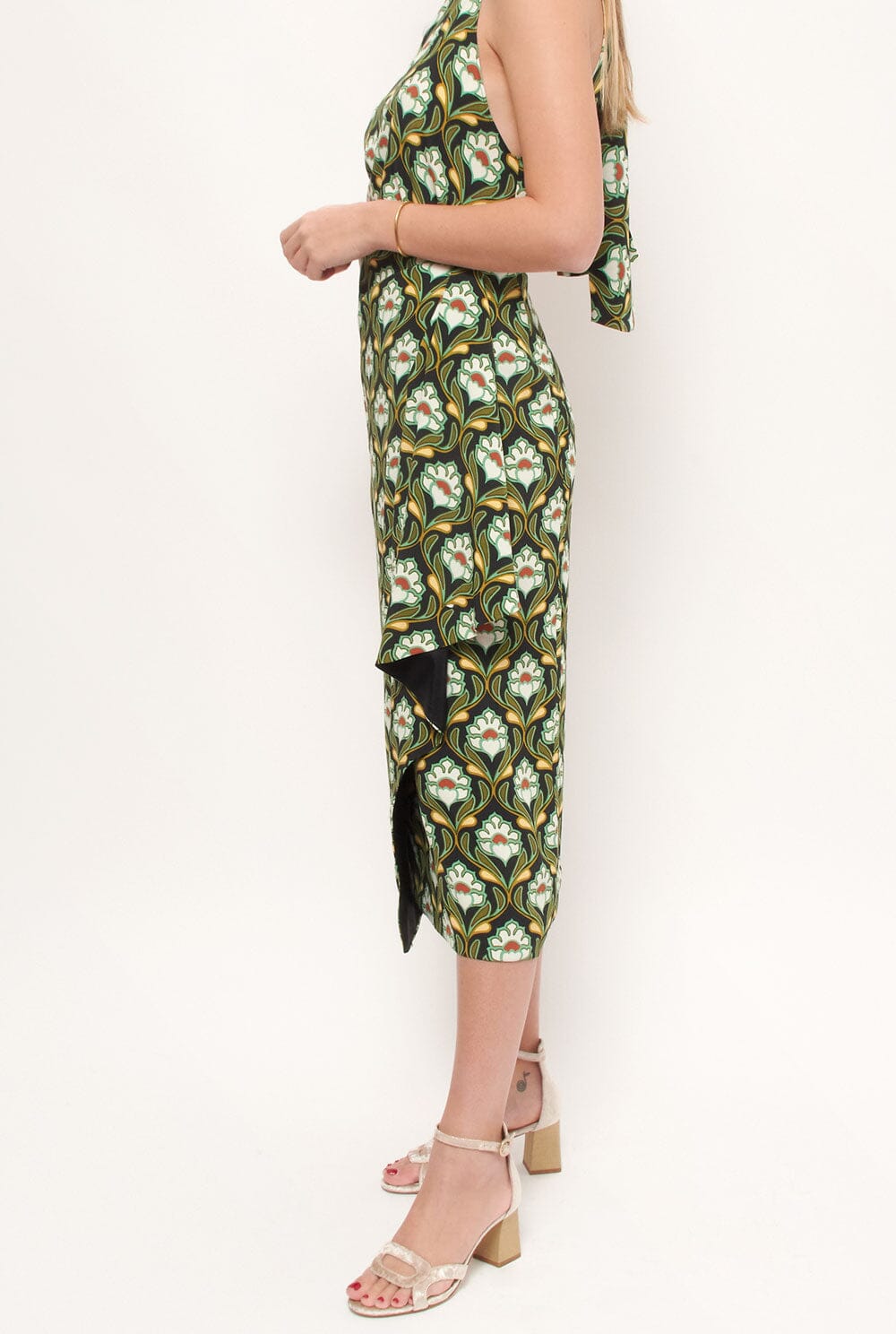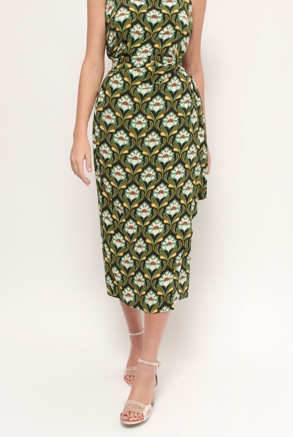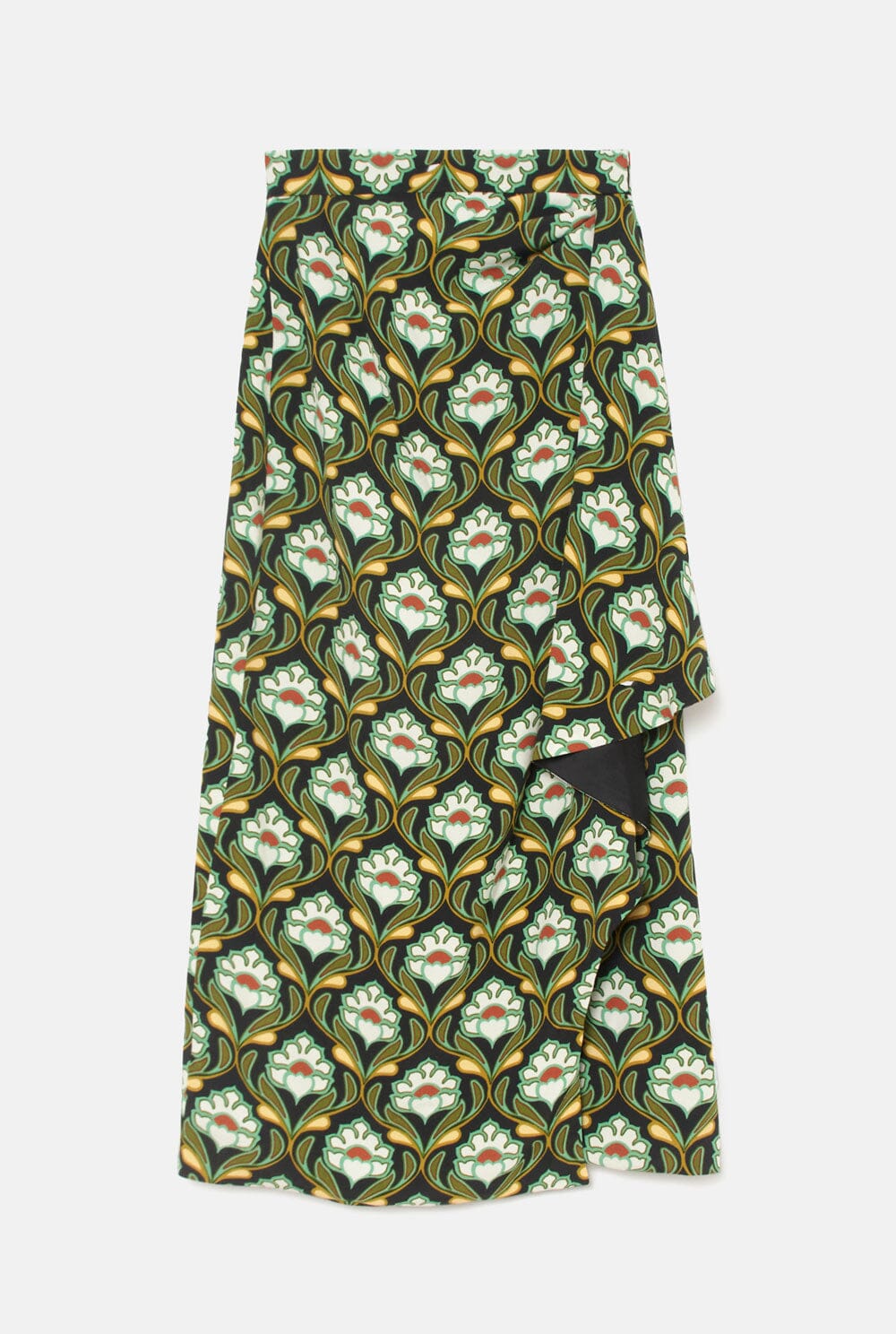 Falda cruzada de crepe en negro y verde. Diseñado por Juan Duyos.