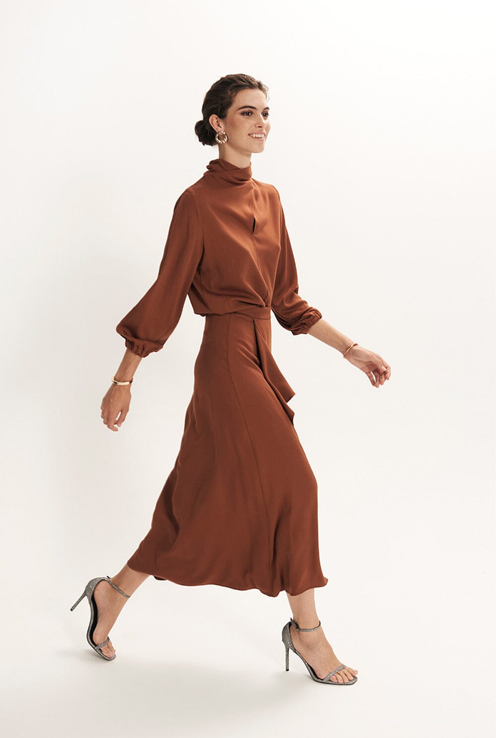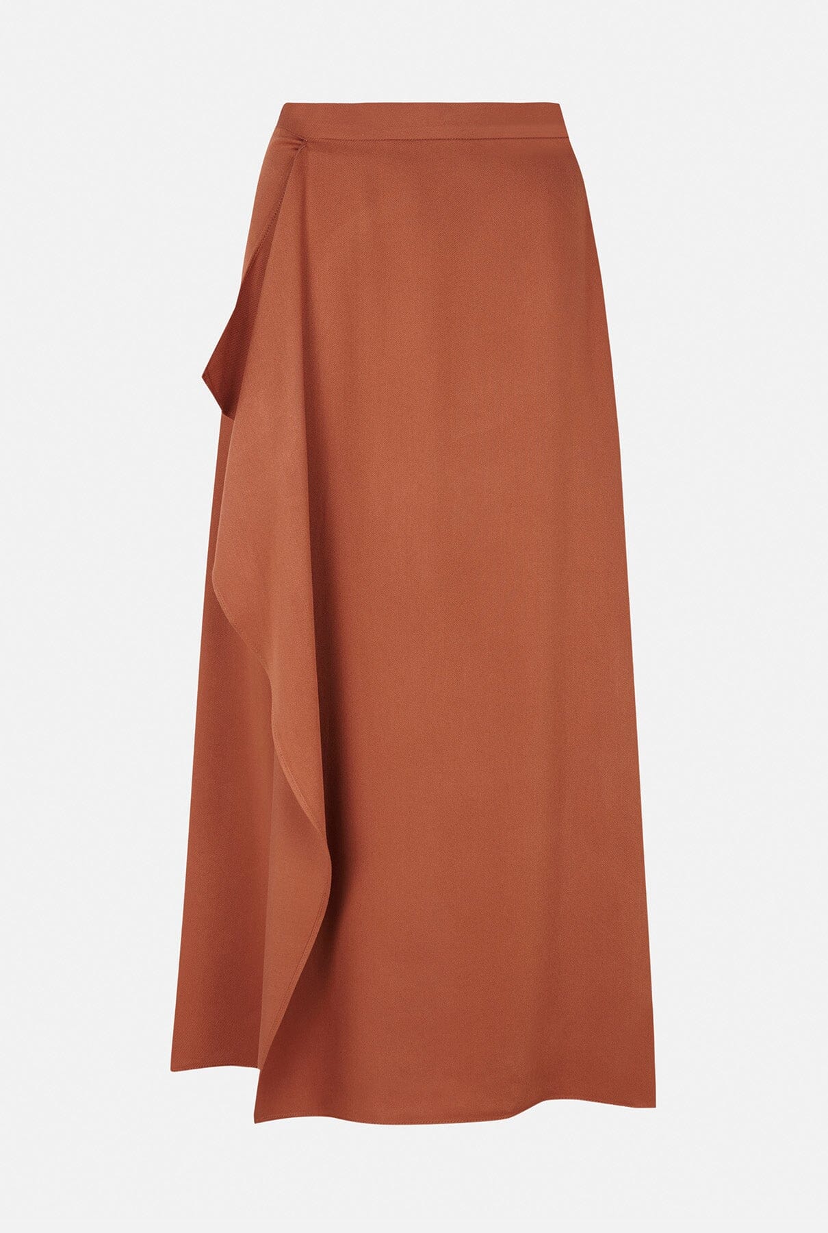 Es una falda cruzada en la que la capa interior llega hacia un lado. Tiene un volante que hace una abertura en la pierna derecha. Se cierra con cremallera en el lateral izquierdo y tiene silueta evasé.