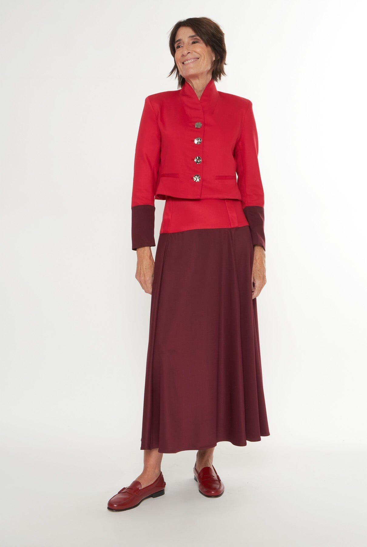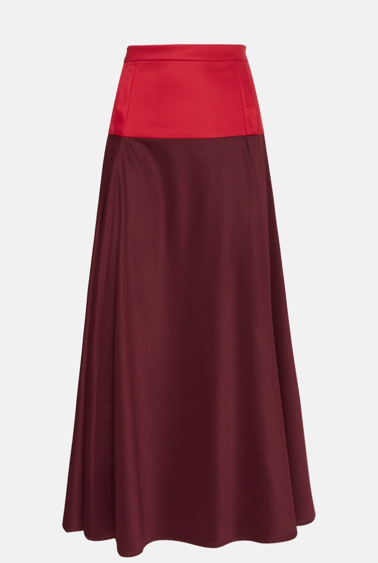 Falda midi bicolor con canesú amplio que ciñe en cintura y vuelo. Tiene dos falsos bolsillos en el frontal y cremallera en centro espalda.
