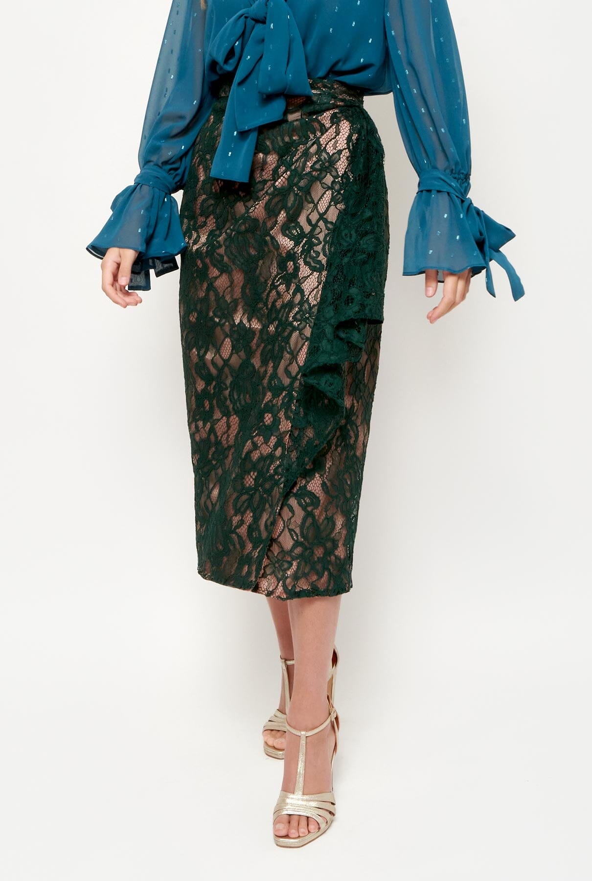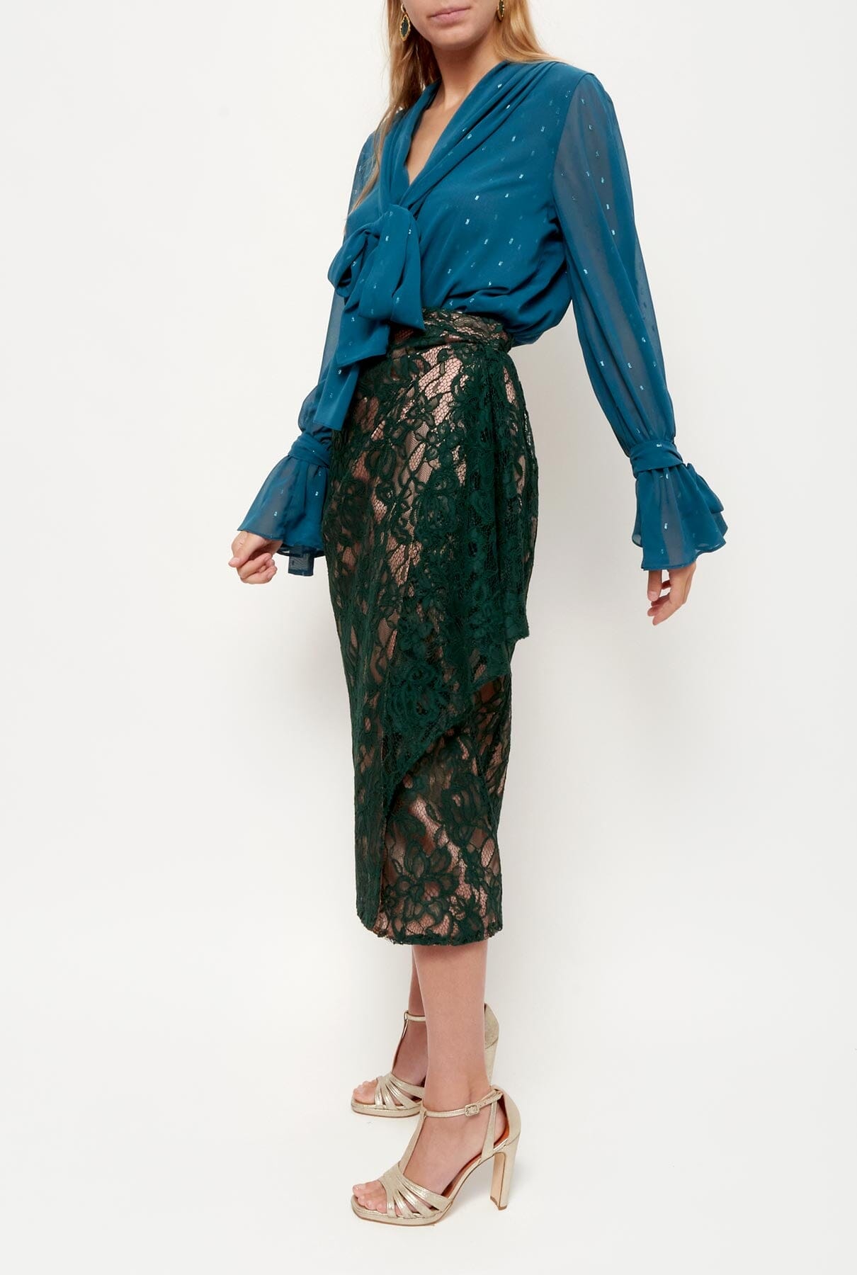 Falda cruzada cruzada. Teñido o lavado a mano. Cierre de gancho y ojo en la cintura. Diseñado por Juan Duyos.