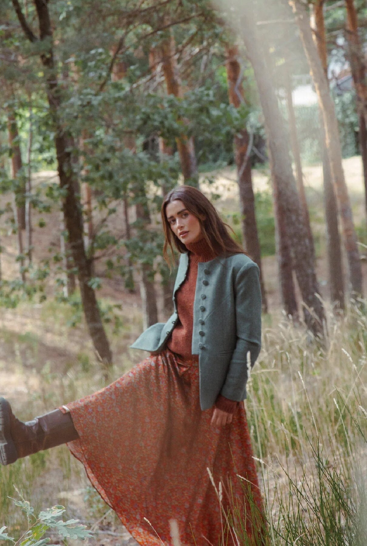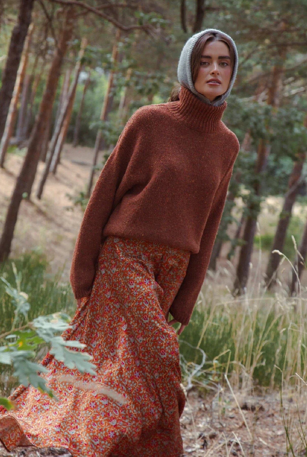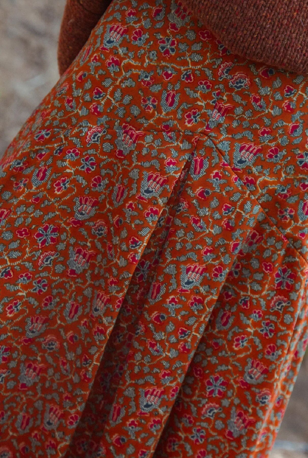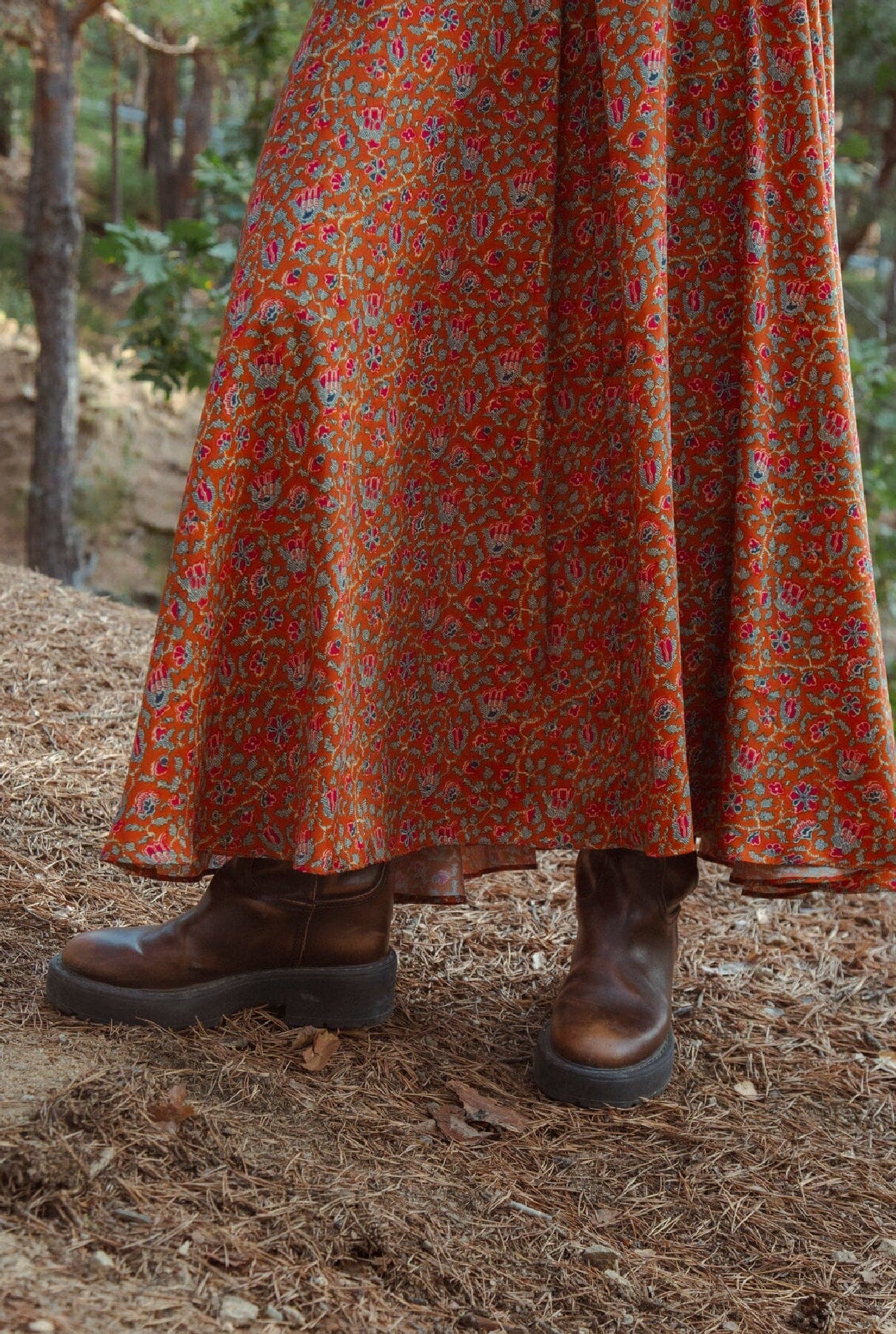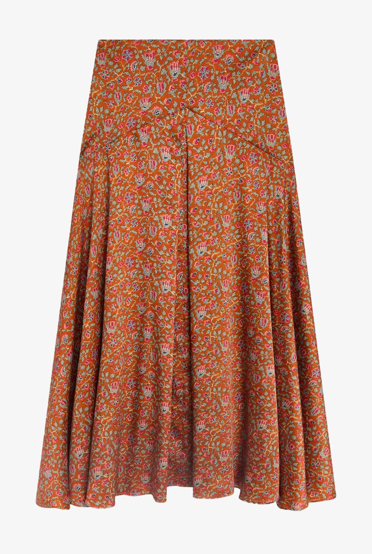 Falda larga estampada, entallada en cintura con cortes que estilizan la silueta.