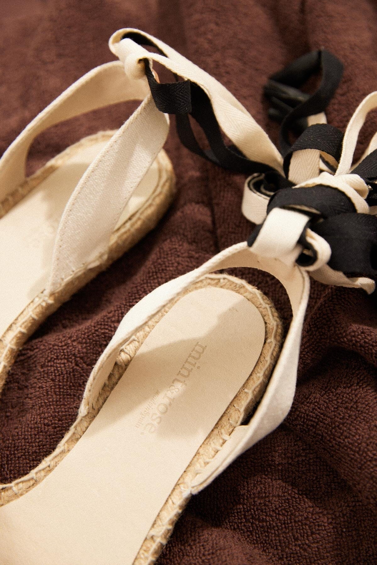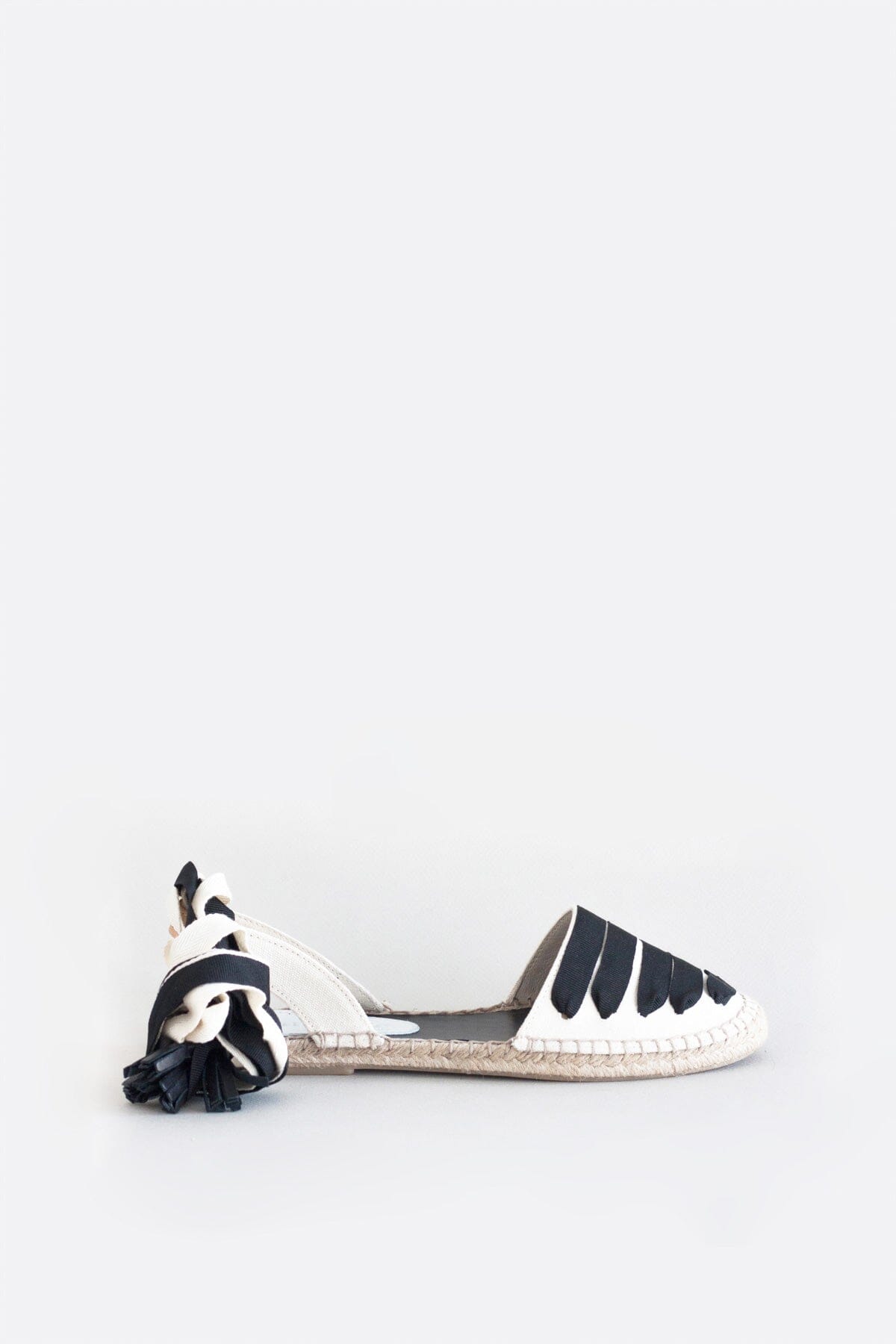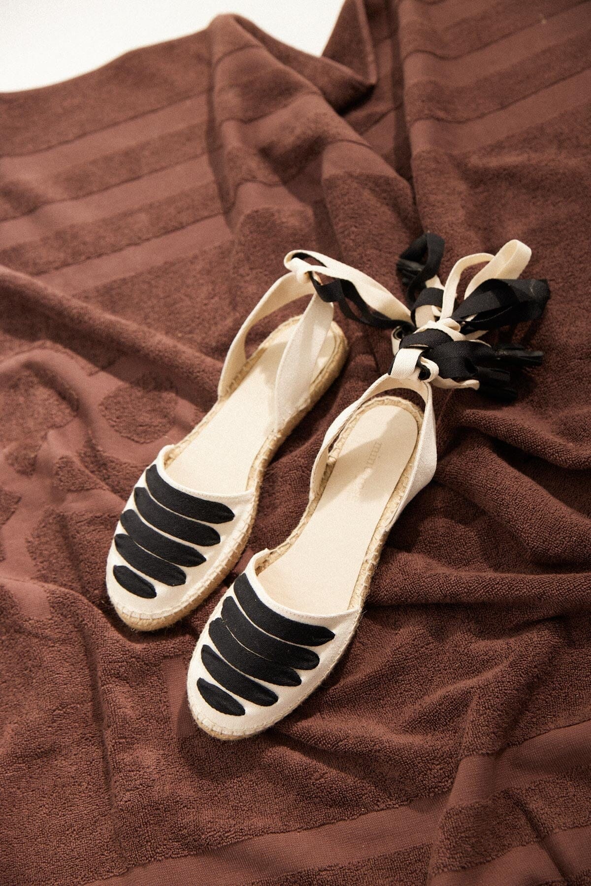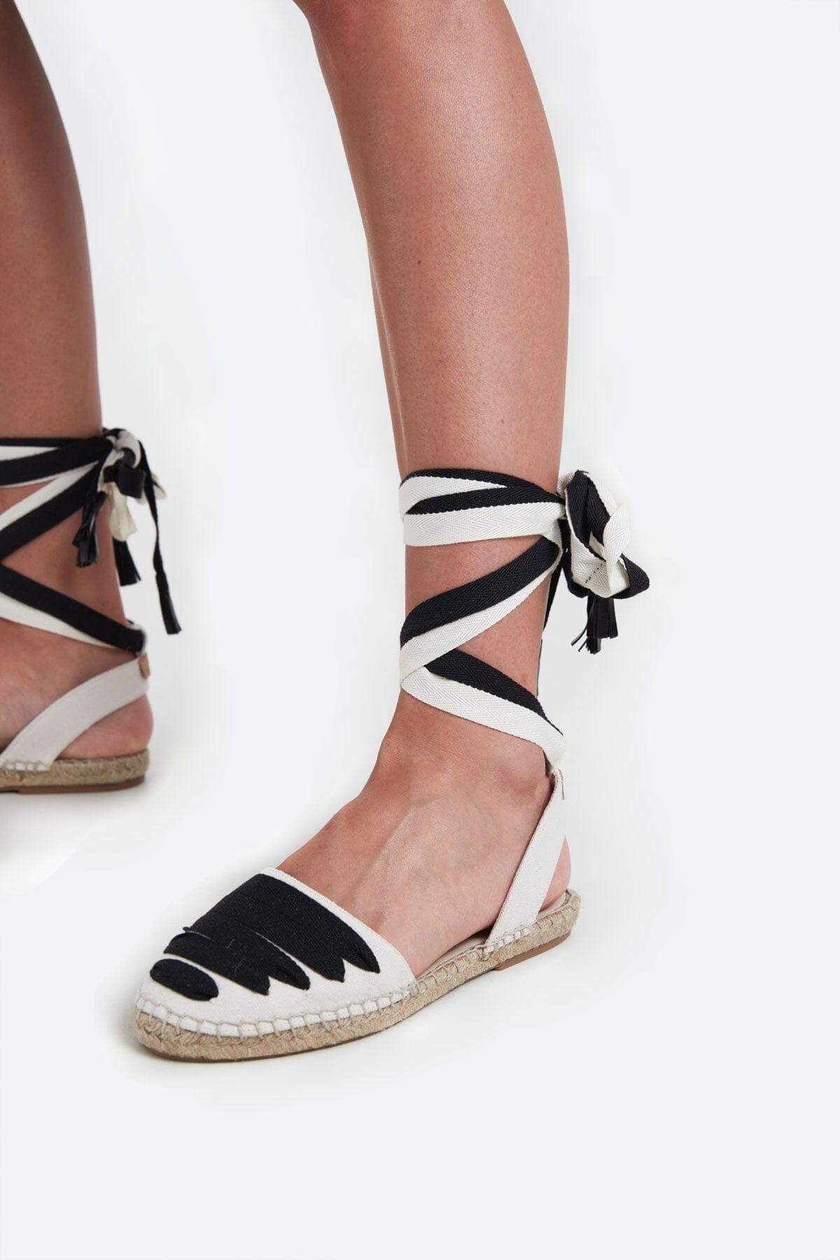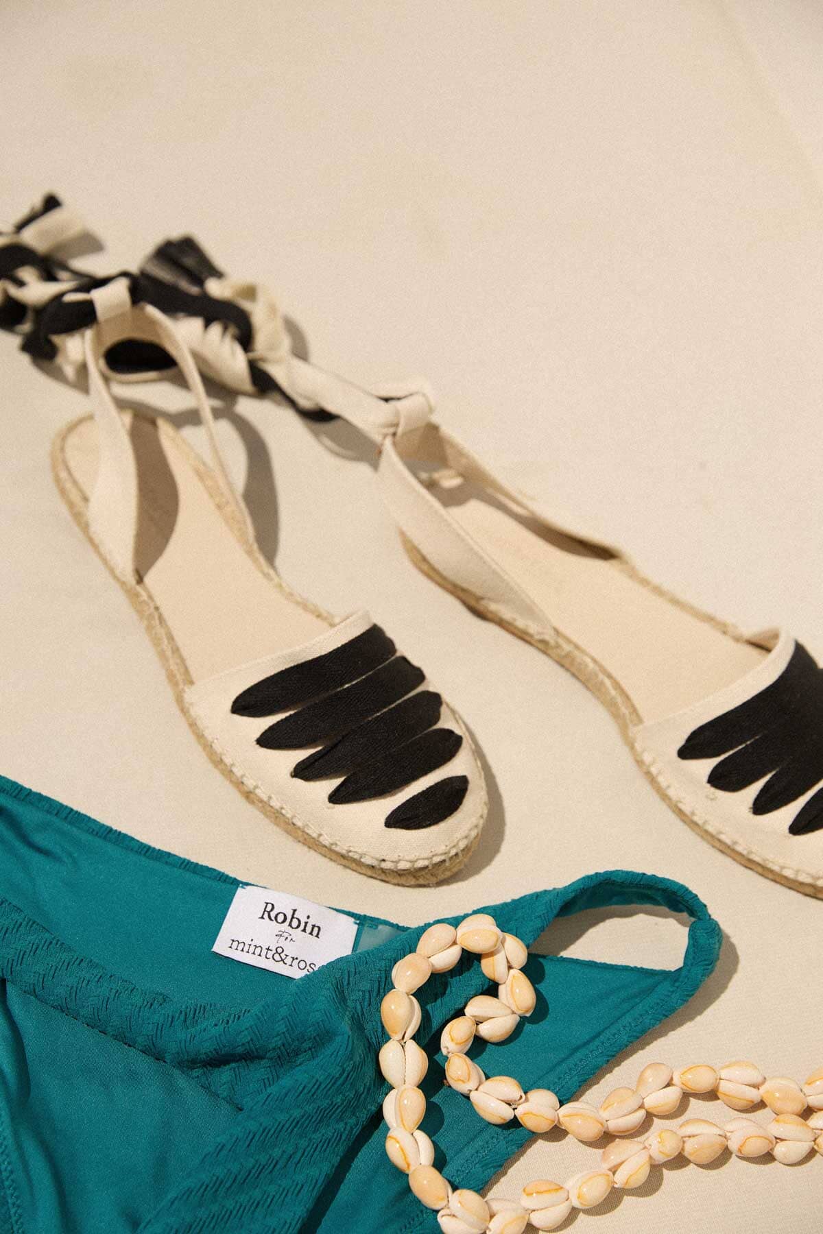 Están hechas de lona color crudo, con tiras negras en contraste que se atan por encima del tobillo para sujetar el pie. Nos encantan para el verano por su comodidad, ligereza y por ser un clásico atemporal. Suela de yute de 1,4 cm con plantilla de cuero.