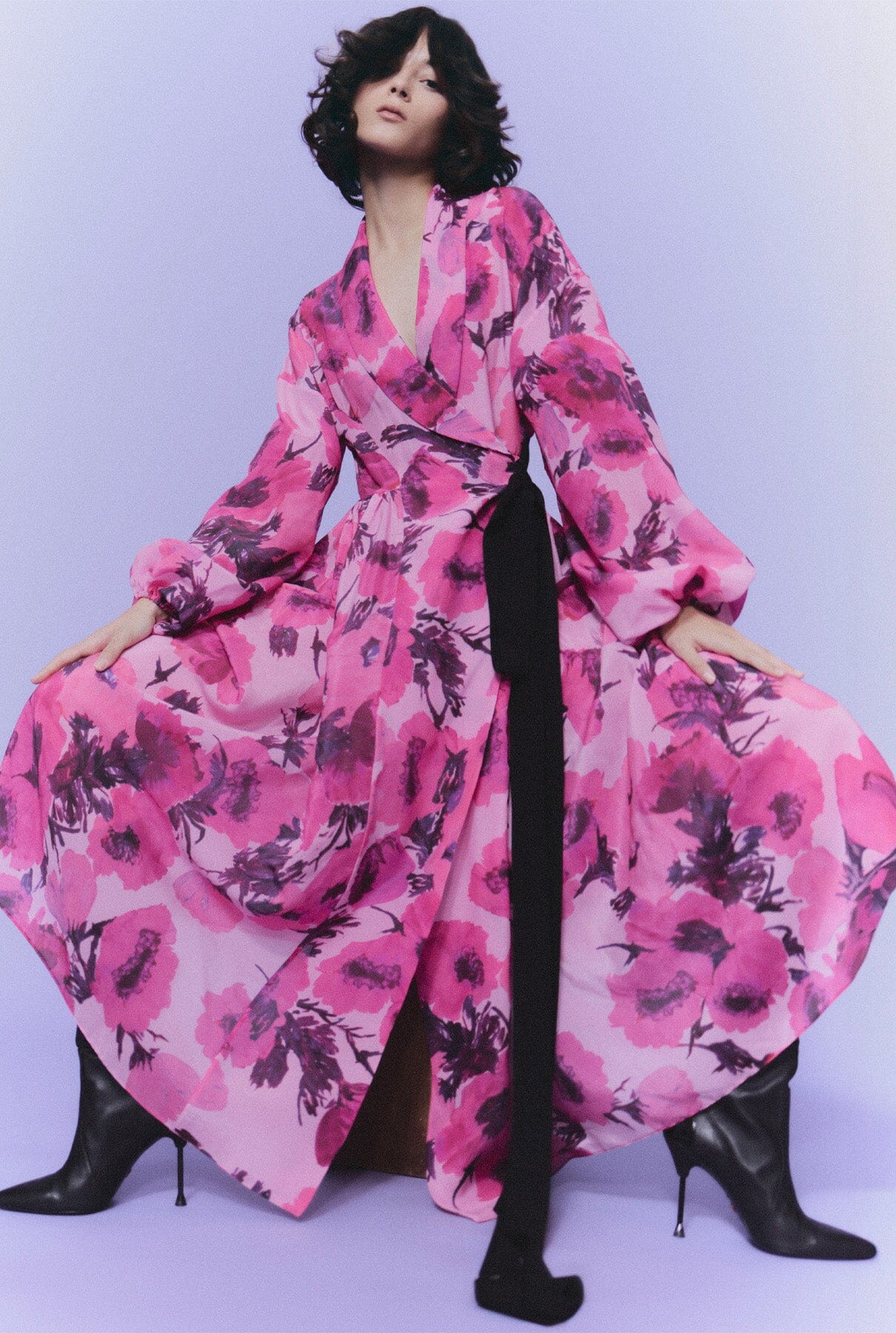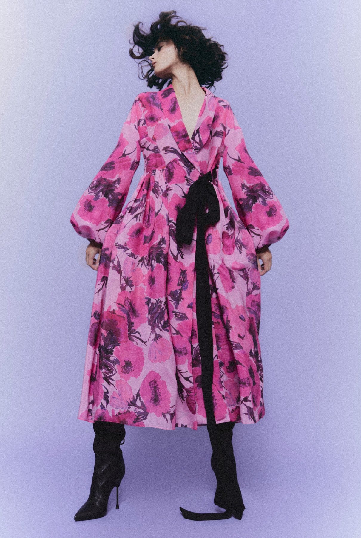 VESTIDO CAMISA CRUZADO CON CORTE EN LA CINTURA, MANGAS LARGAS ABULLONADAS Y FALDA CON VOLUMEN. ESCOTE EN V CON SOLAPA DE ESMOQUIN QUE CONDUCE A UN LAZO DE GROSGRAIN EN CONTRASTE. PARA SOPORTAR EL VOLUMEN, EL VESTIDO TIENE REFUERZOS INTERNOS DE CRIN