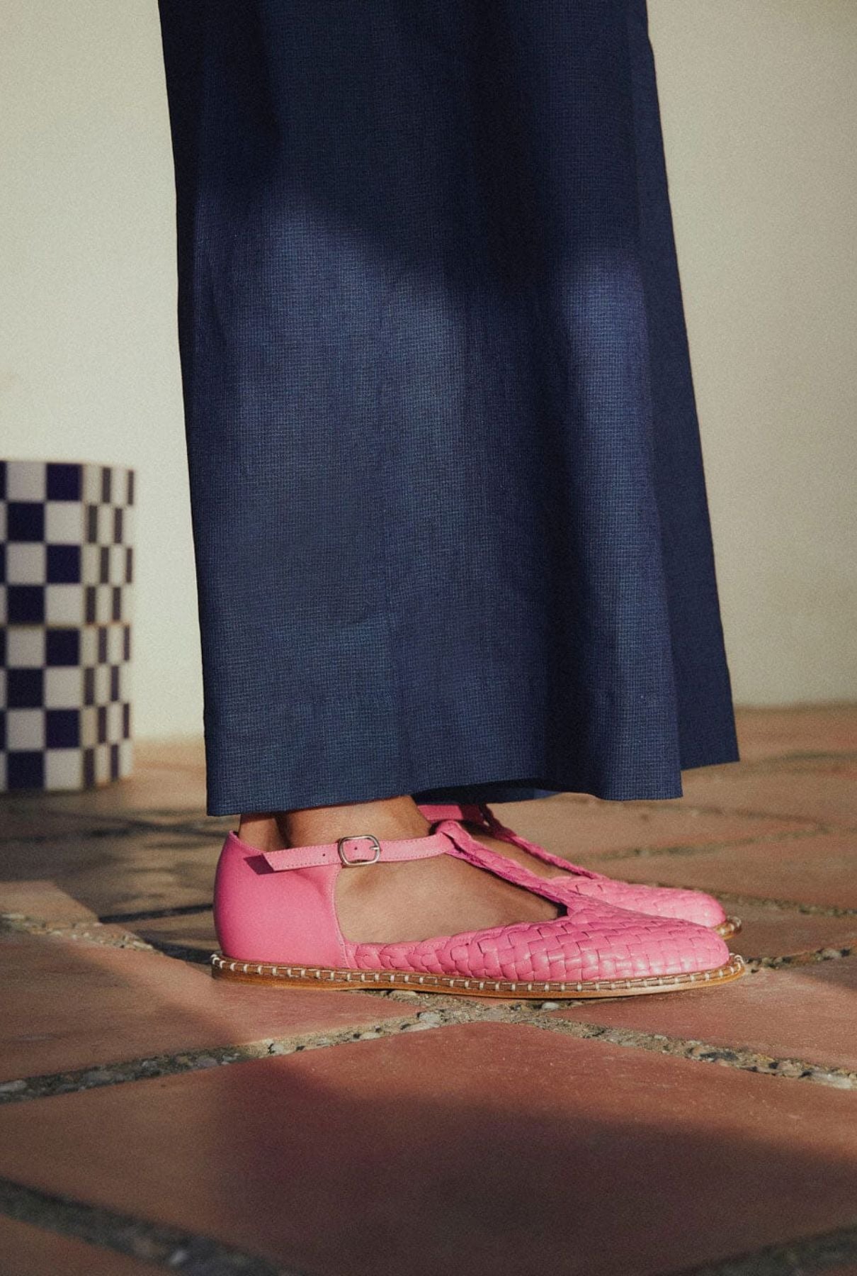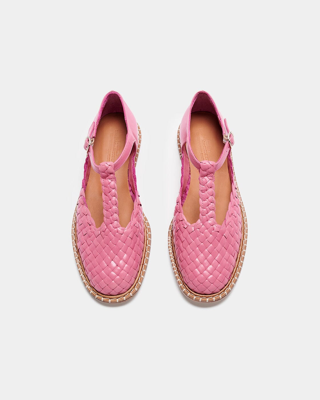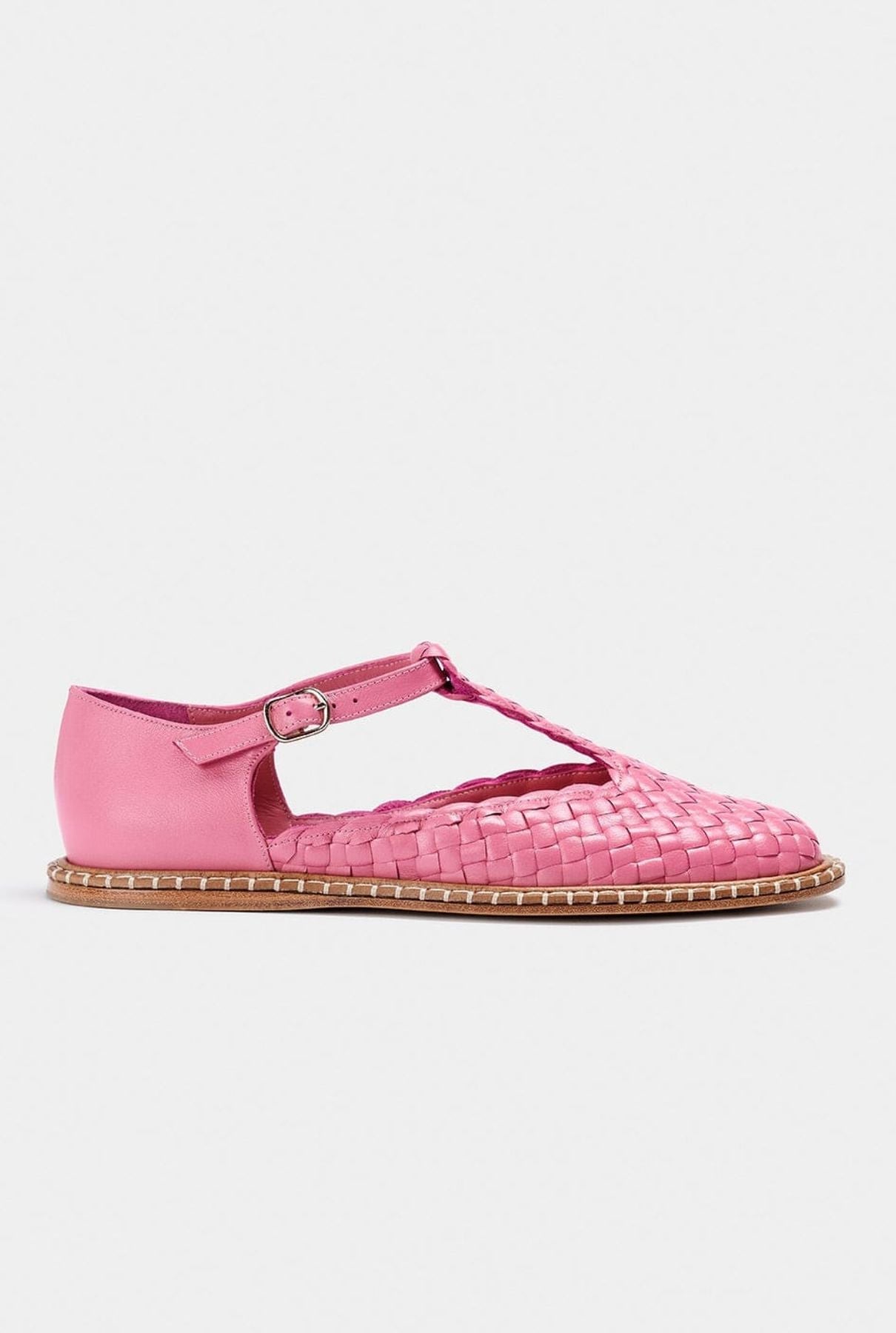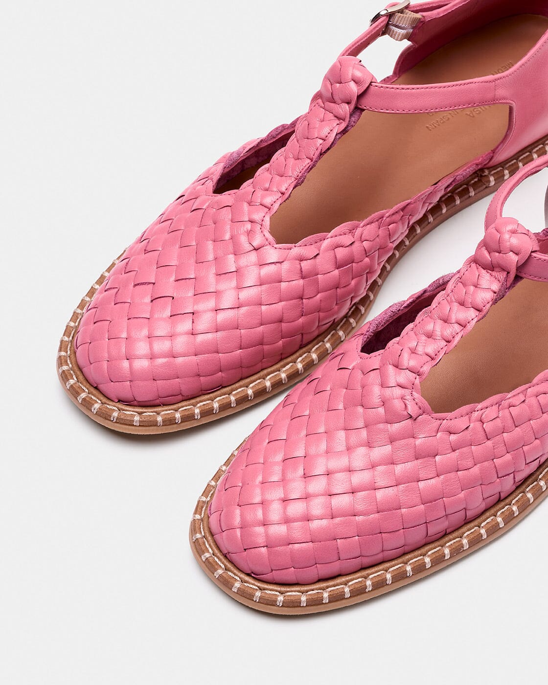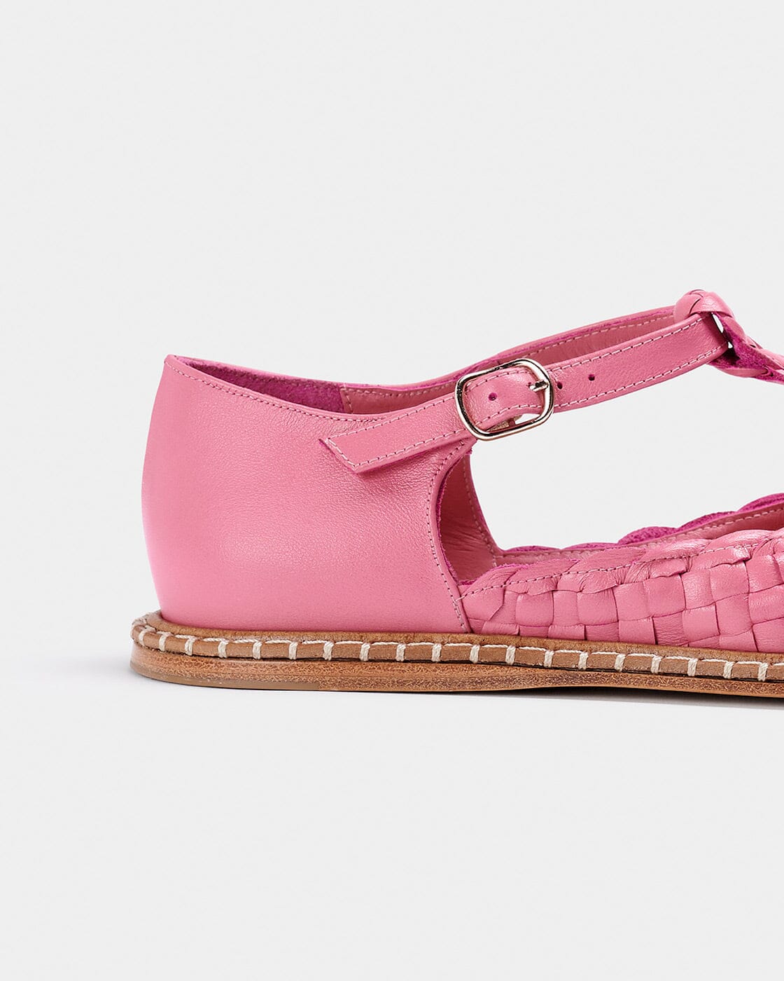 Fragaria es una bailarina con cierre de hebilla en T. La parte superior es de piel de vacuno trenzada a mano por artesanos. Forro de piel de cabra. Suela de cuero con costuras decorativas e hilo, de 0,5 cm de altura, con suela a rayas y parte superior de goma inyectada.