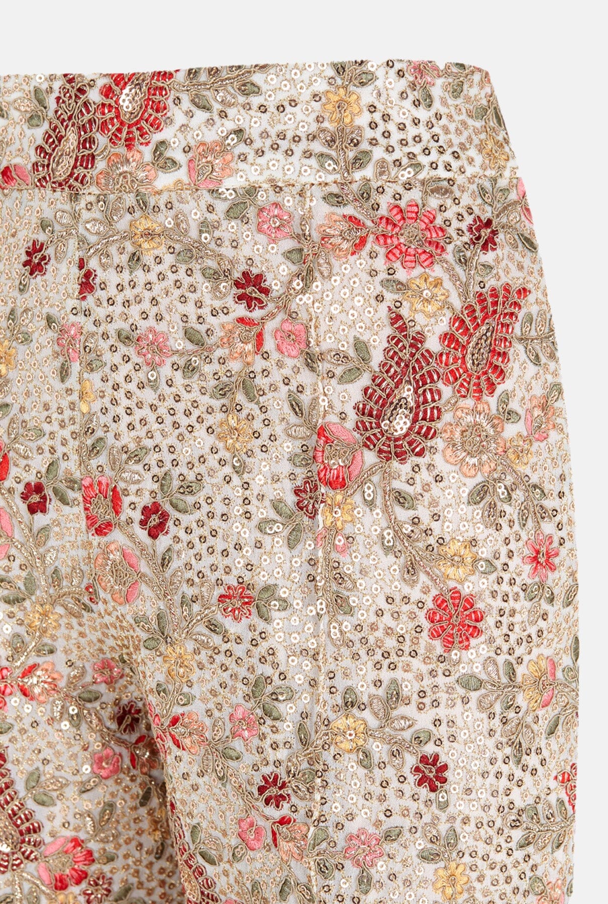 El pantalón “Fran” está confeccionado en un tejido bordado con flores con hilo dorado. Cierre frontal con cremallera y botón, tiro medio. Forrado.
