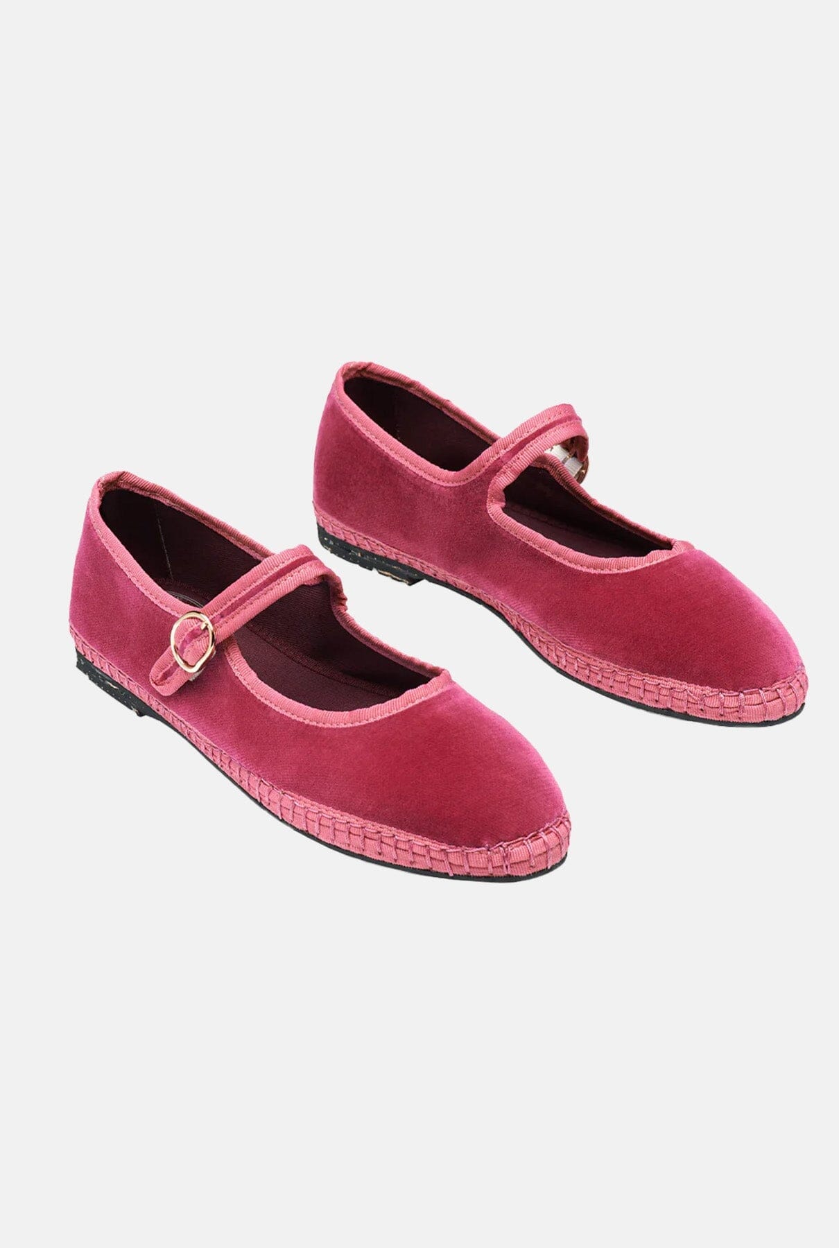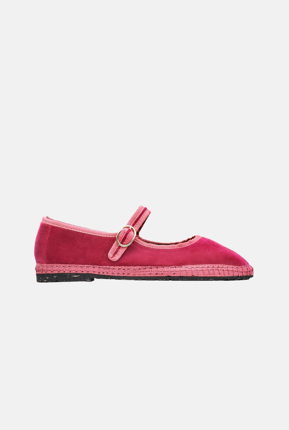 Zapatillas de casa de terciopelo de algodón rosa fresa con vivos en rosa pastel a contraste y cierre de hebilla ajustable. El exterior del zapato es 100% terciopelo de algodón, y el interior del zapato es 100% algodón orgánico con tratamiento antibacteriano. La suela está hecha de caucho producido a partir de neumáticos de bicicleta reciclados.