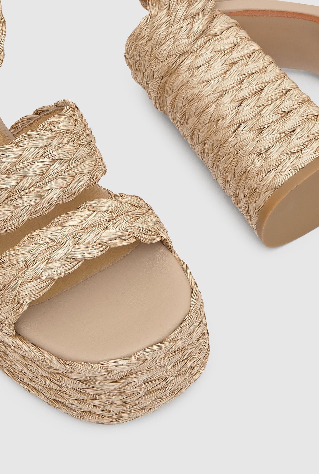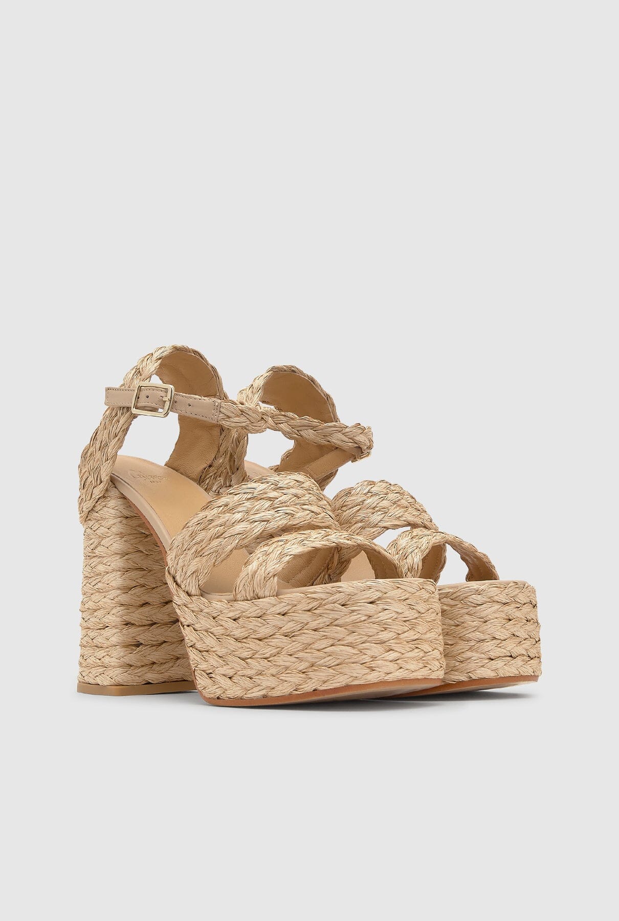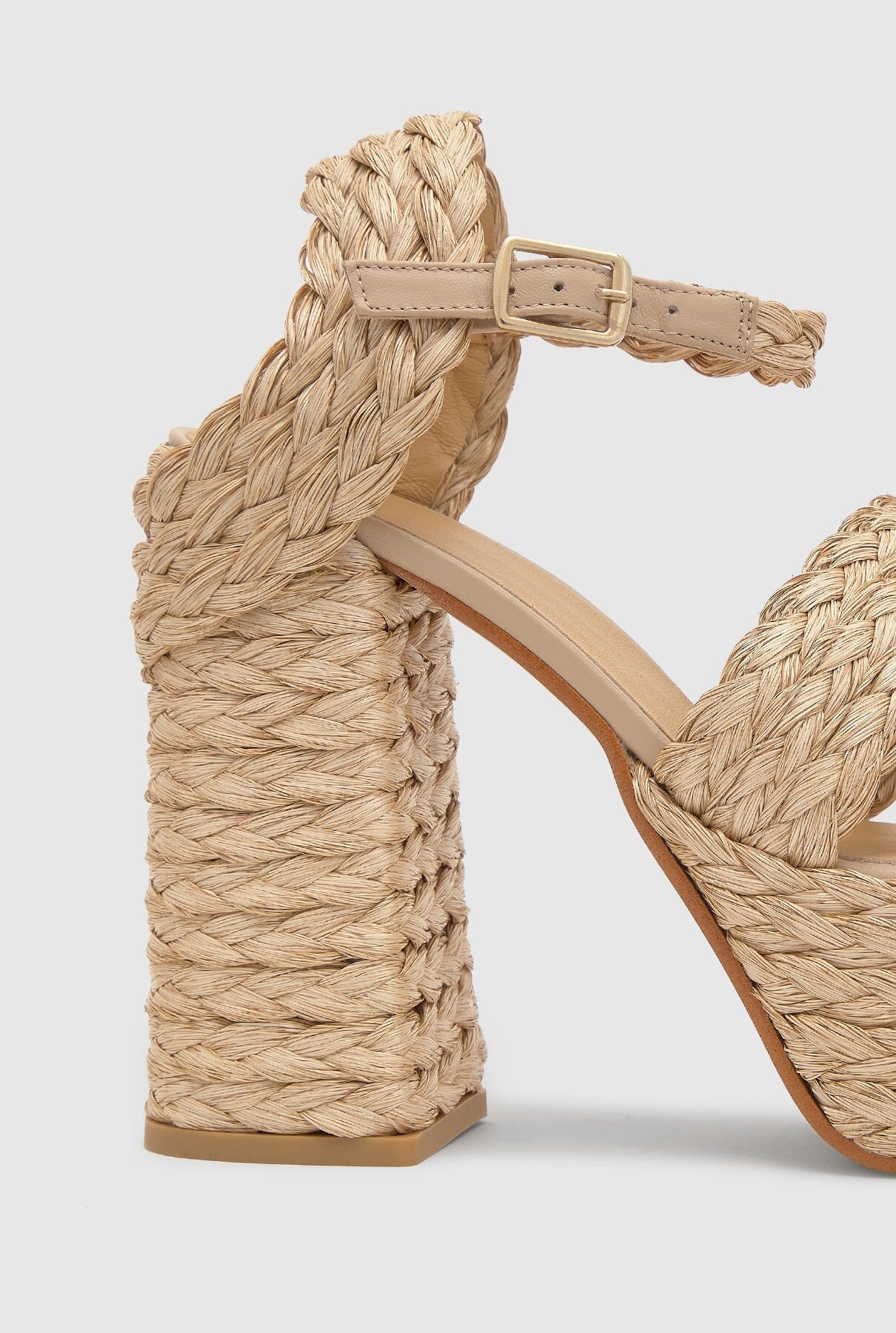 Sandalia fresa realizada en rafia tintada con cierre de tiras y planta acolchada. Tacón y plataforma a juego de 13 cm.