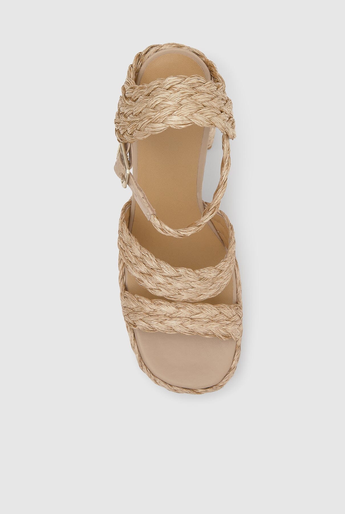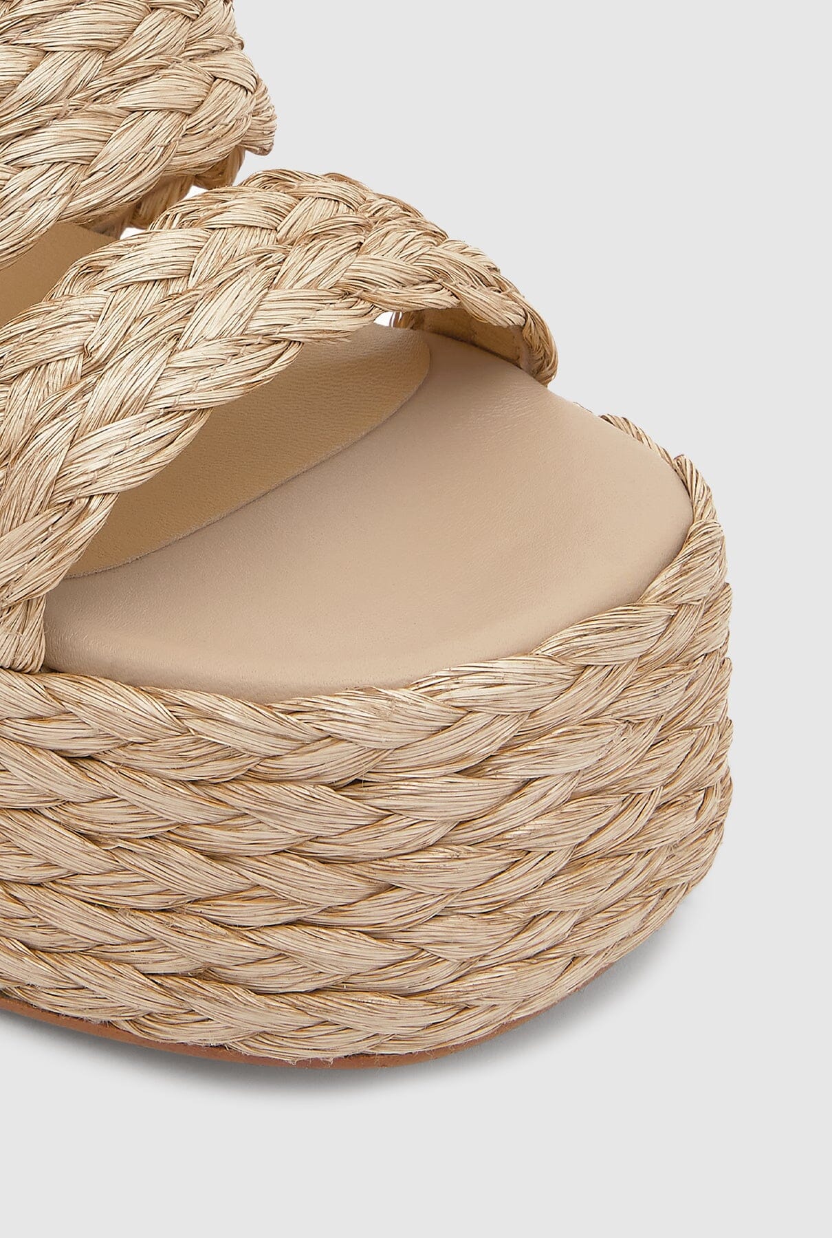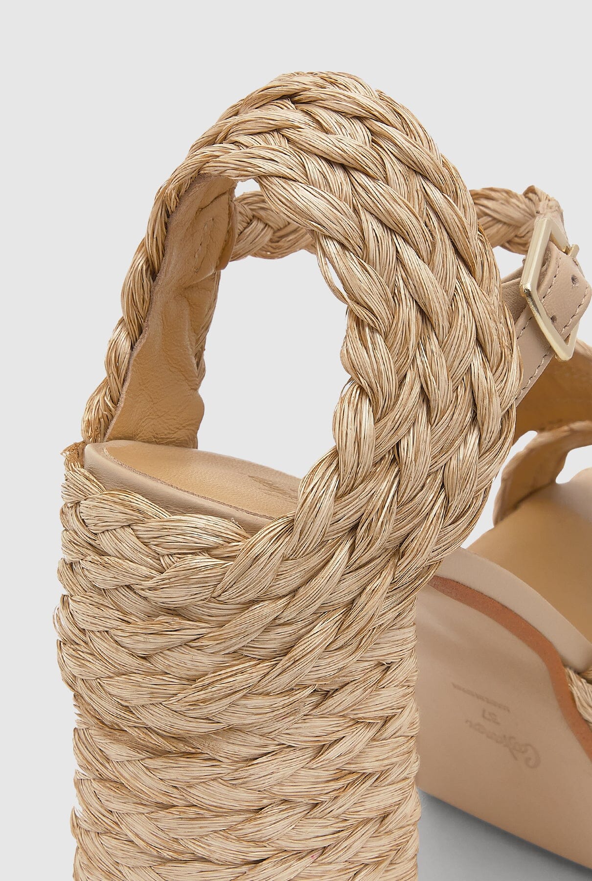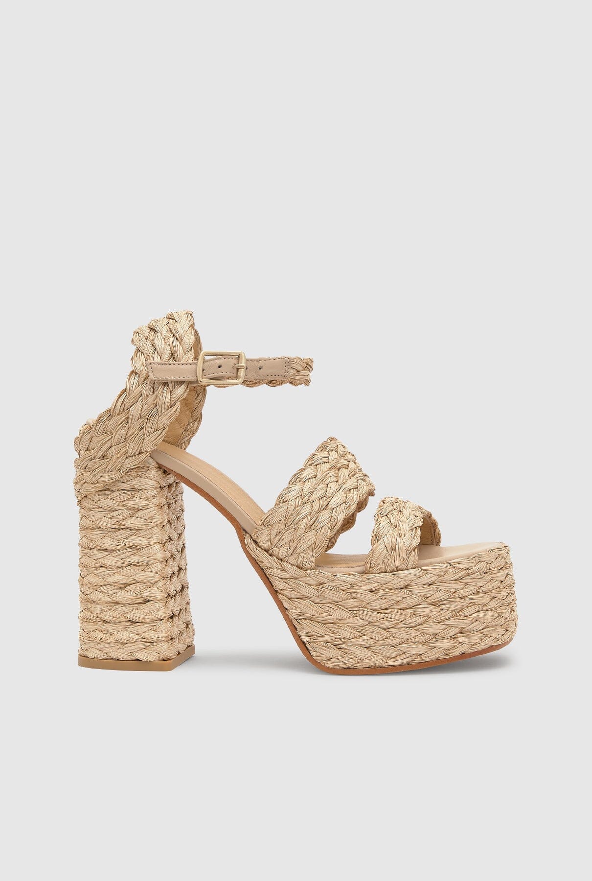 Sandalia fresa realizada en rafia tintada con cierre de tiras y planta acolchada. Tacón y plataforma a juego de 13 cm.