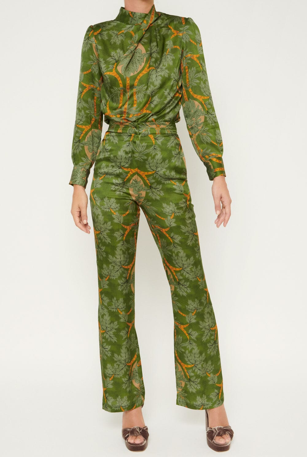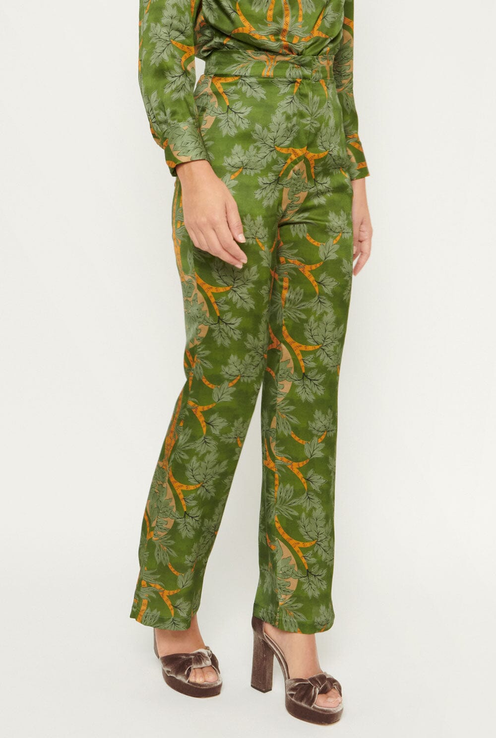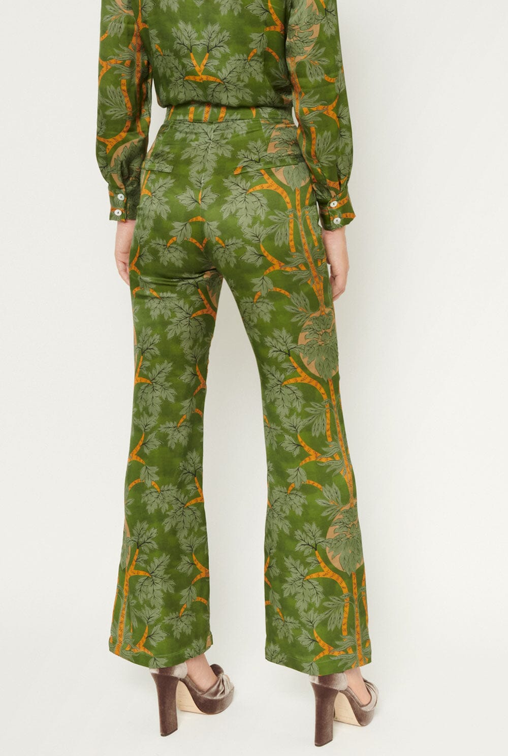 Pantalón estilo palazzo, cierre frontal con botón interior y cremallera en tejido estampado verde y mostaza. Bolsillos laterales en costura y detalle de falso bolsillo en espalda. Lavar a 30 grados, planchar a baja temperatura o con un pañuelo encima, no secar en secadora, no limpiar en seco y no usar lejía.