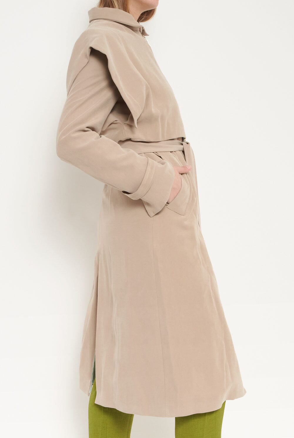 Gabardina ligera en color beige ideal para entretiempo. El cuello se puede llevar levantado a modo de cuello alto o de solapa. Bolsillos laterales delanteros y cinturón ajustable del mismo tejido. Cierre frontal con cremallera dorada vista. Forro en algodón. Diseñado por Julise Magon.