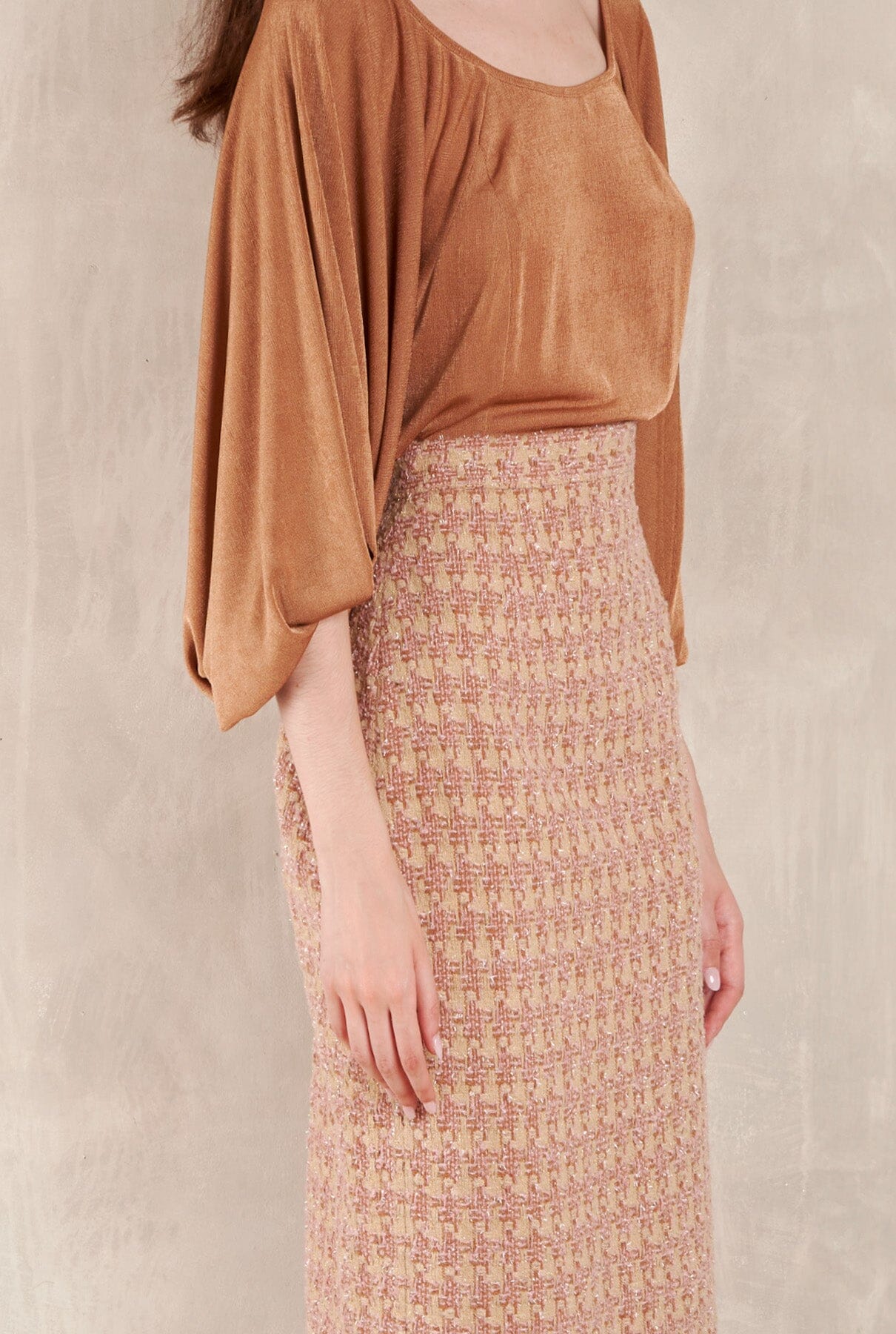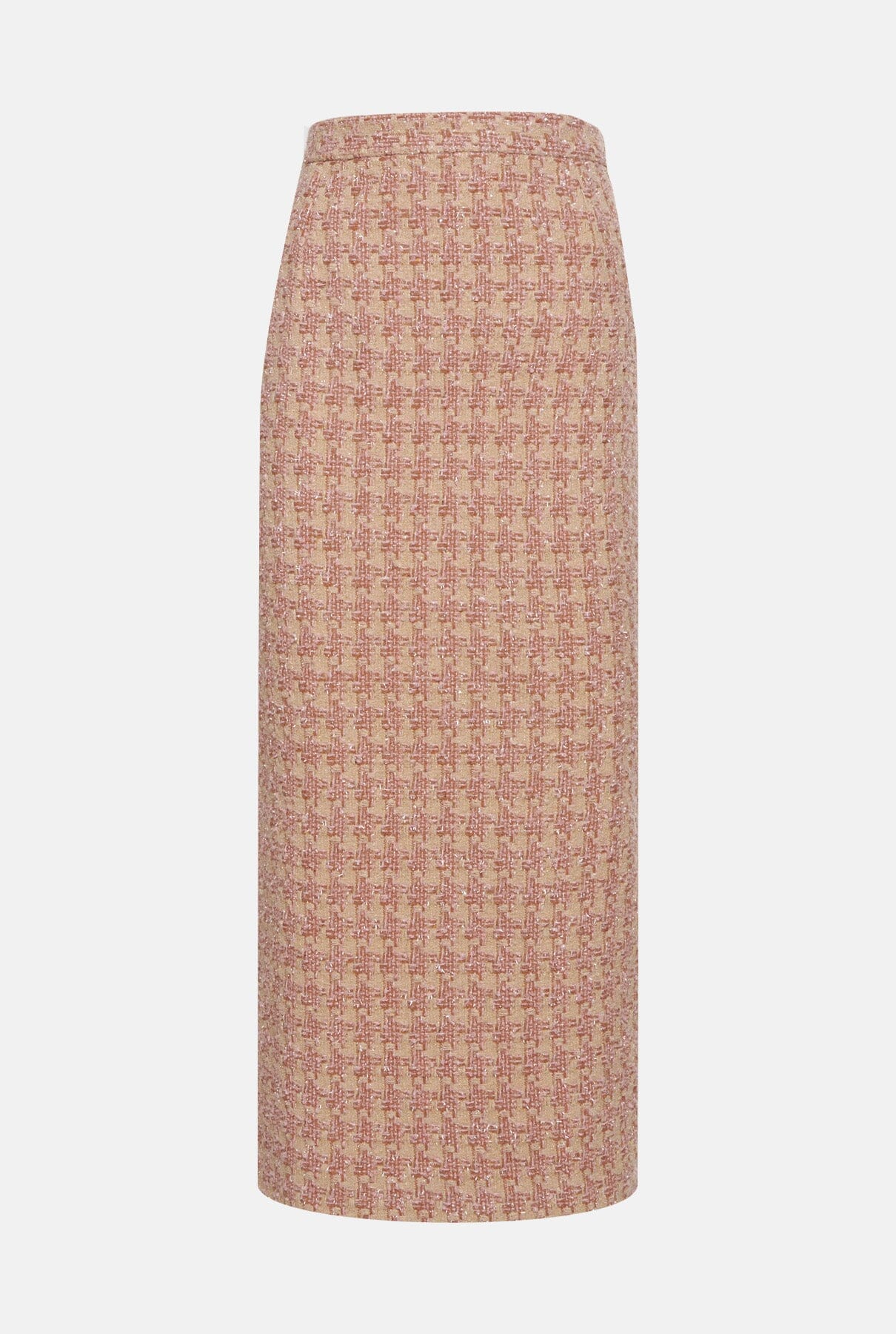 Falda de tweed rosa con forro, cinturilla y cremallera. Diseño de Juan Duyos.