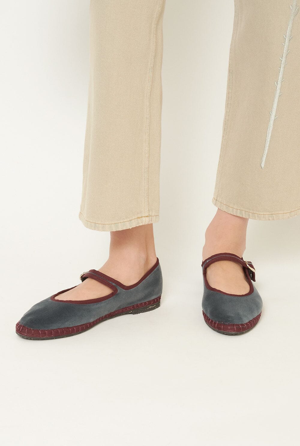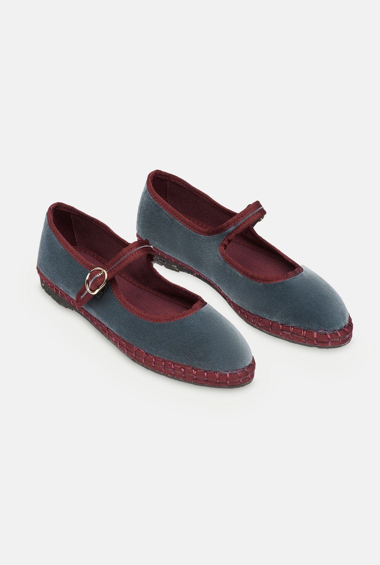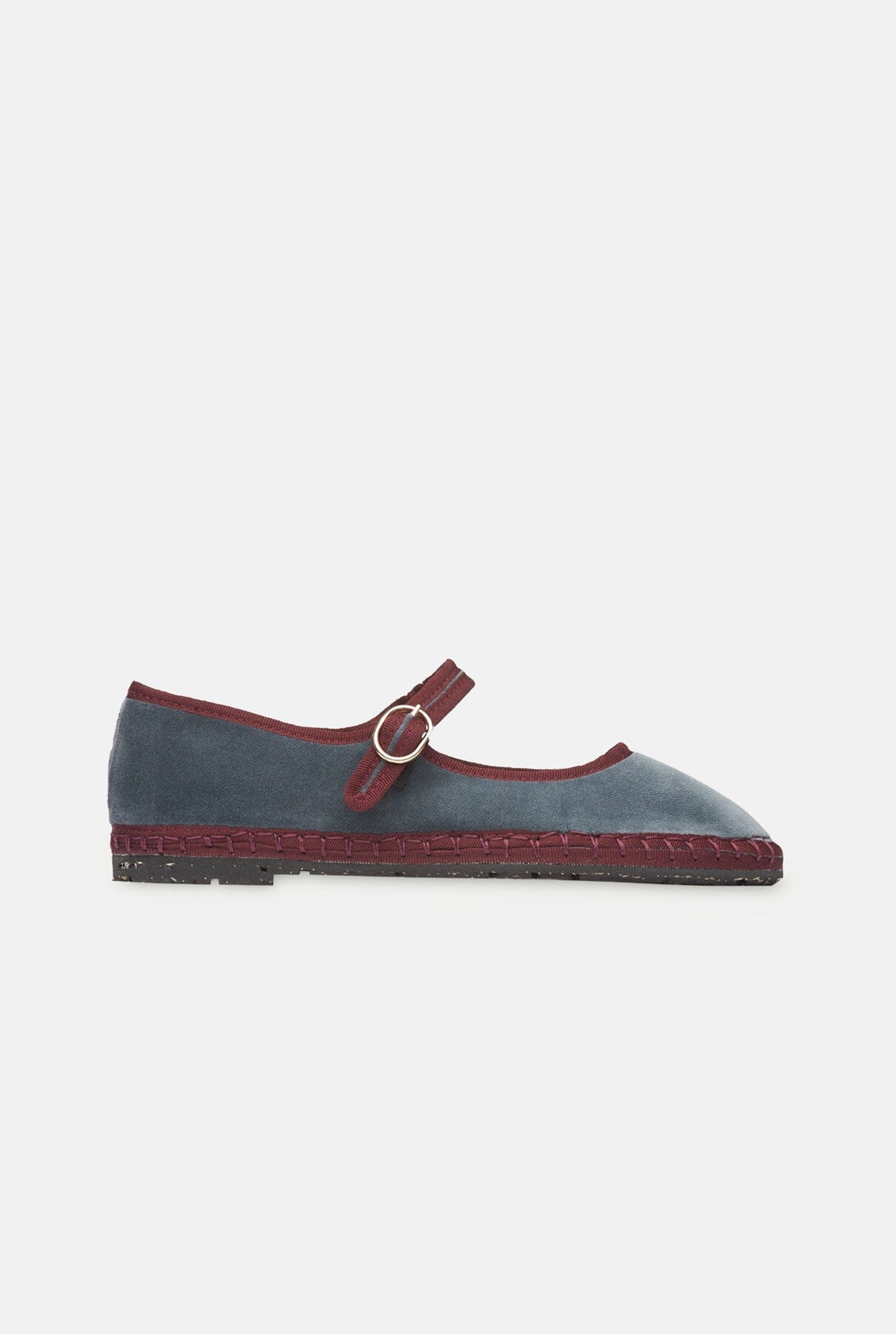 Mercedita de terciopelo en color gris oscuro con vivos en color burdeos y cierre con hebilla. El exterior del zapato es 100% terciopelo de algodón, y el interior del zapato es 100% algodón ecológico con tratamiento antibacteriano. La suela está hecha de caucho procedente de neumáticos de bicicleta reciclados.