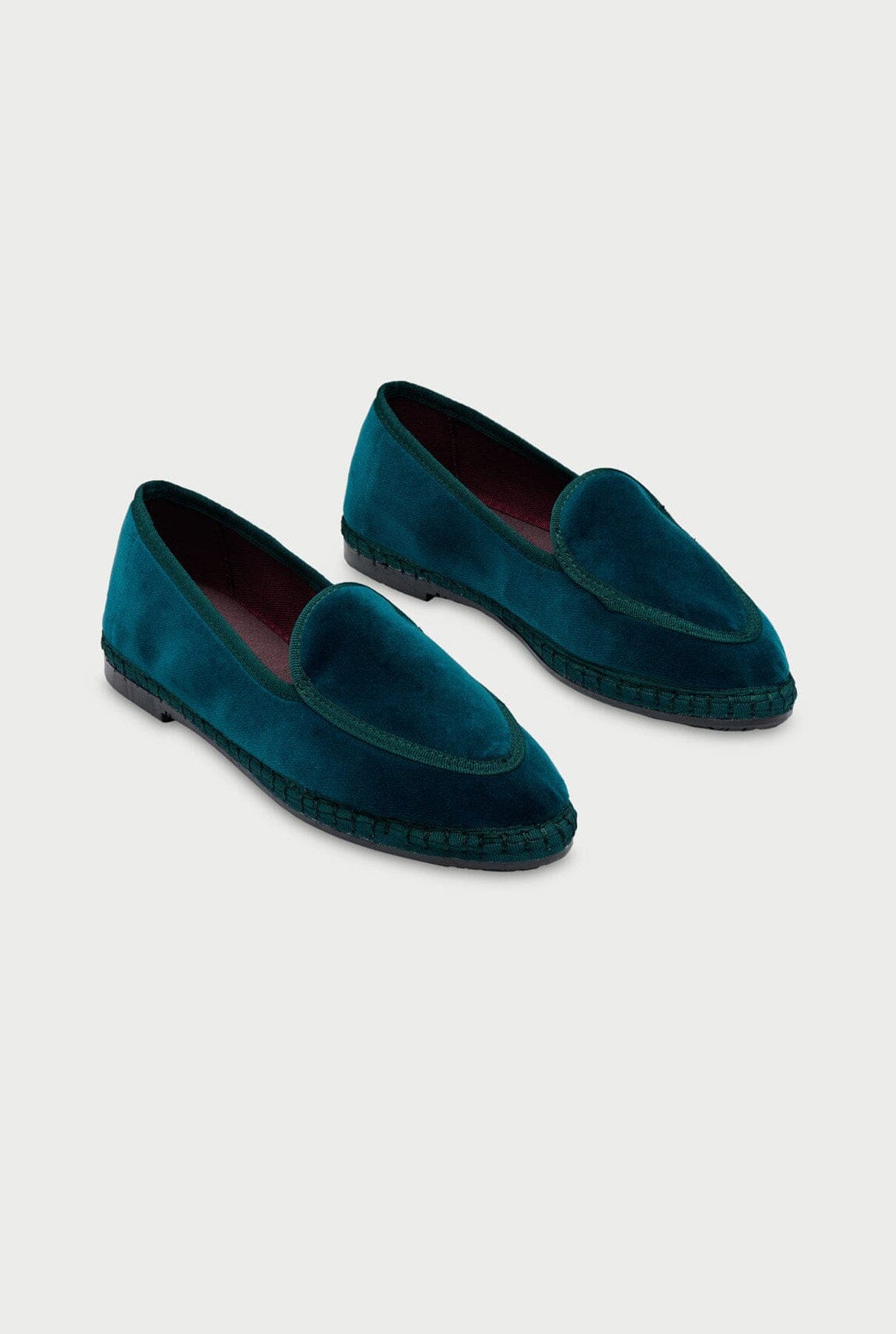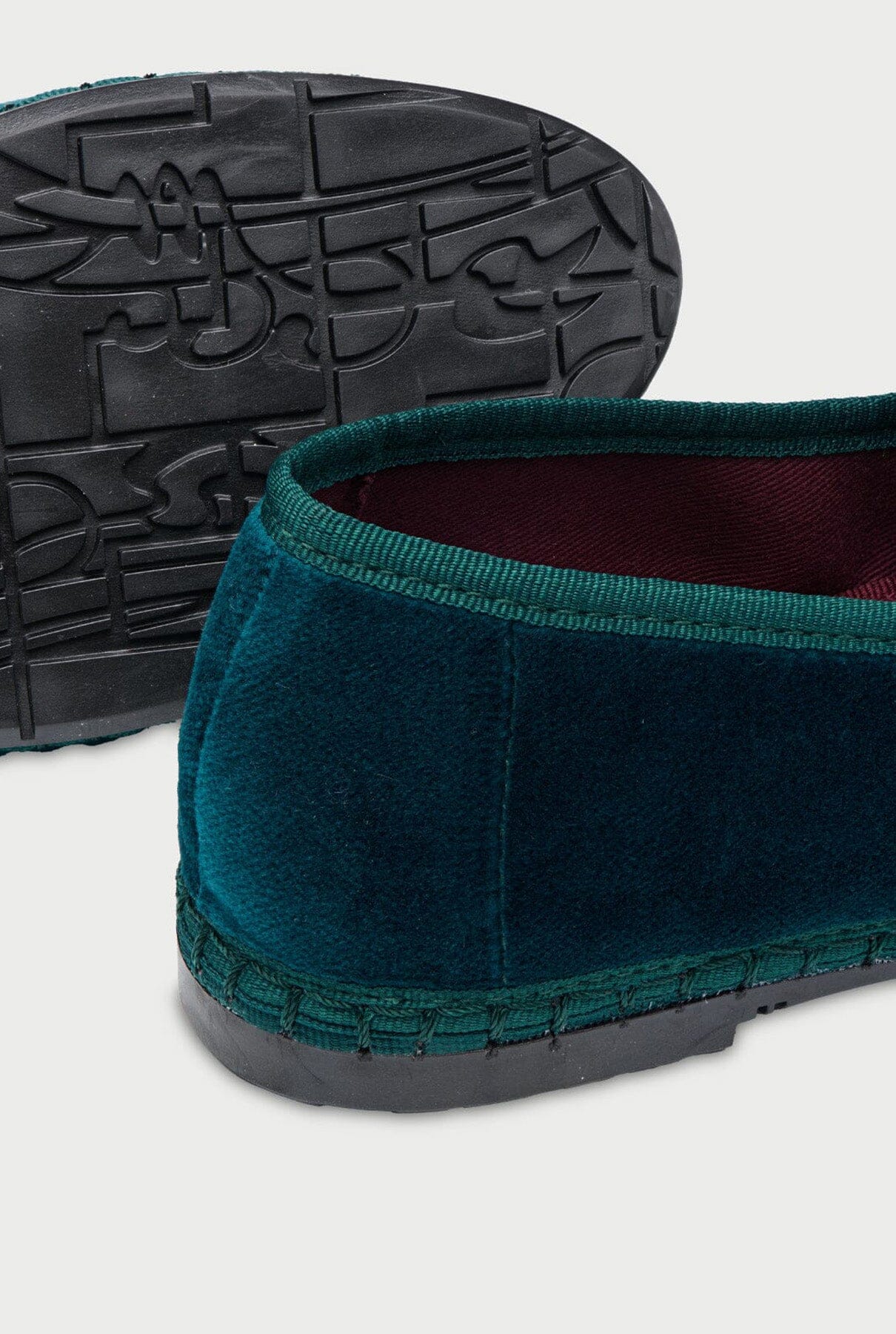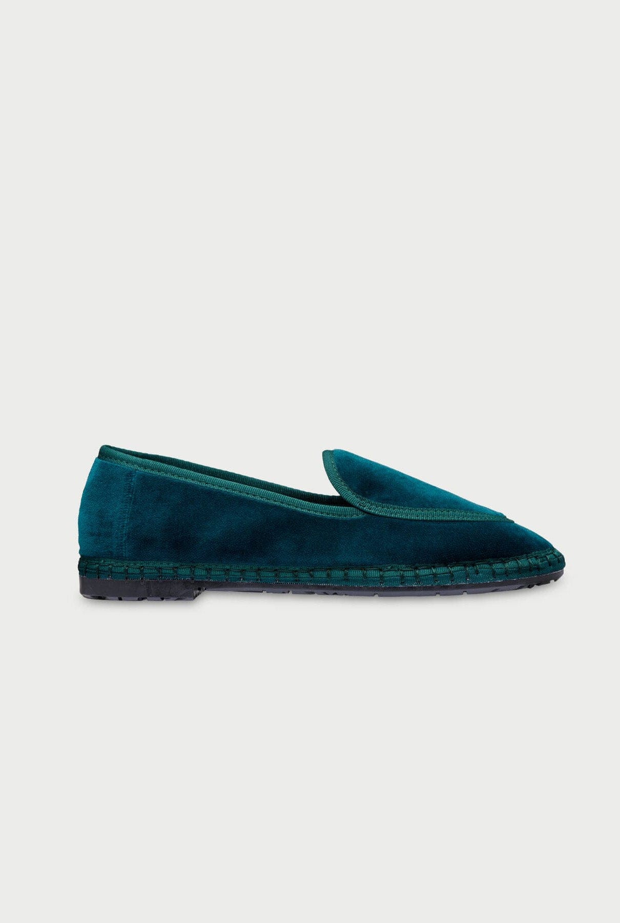 Zapato belga de terciopelo en color verde oscuro con empeine verde oscuro y ribete verde.