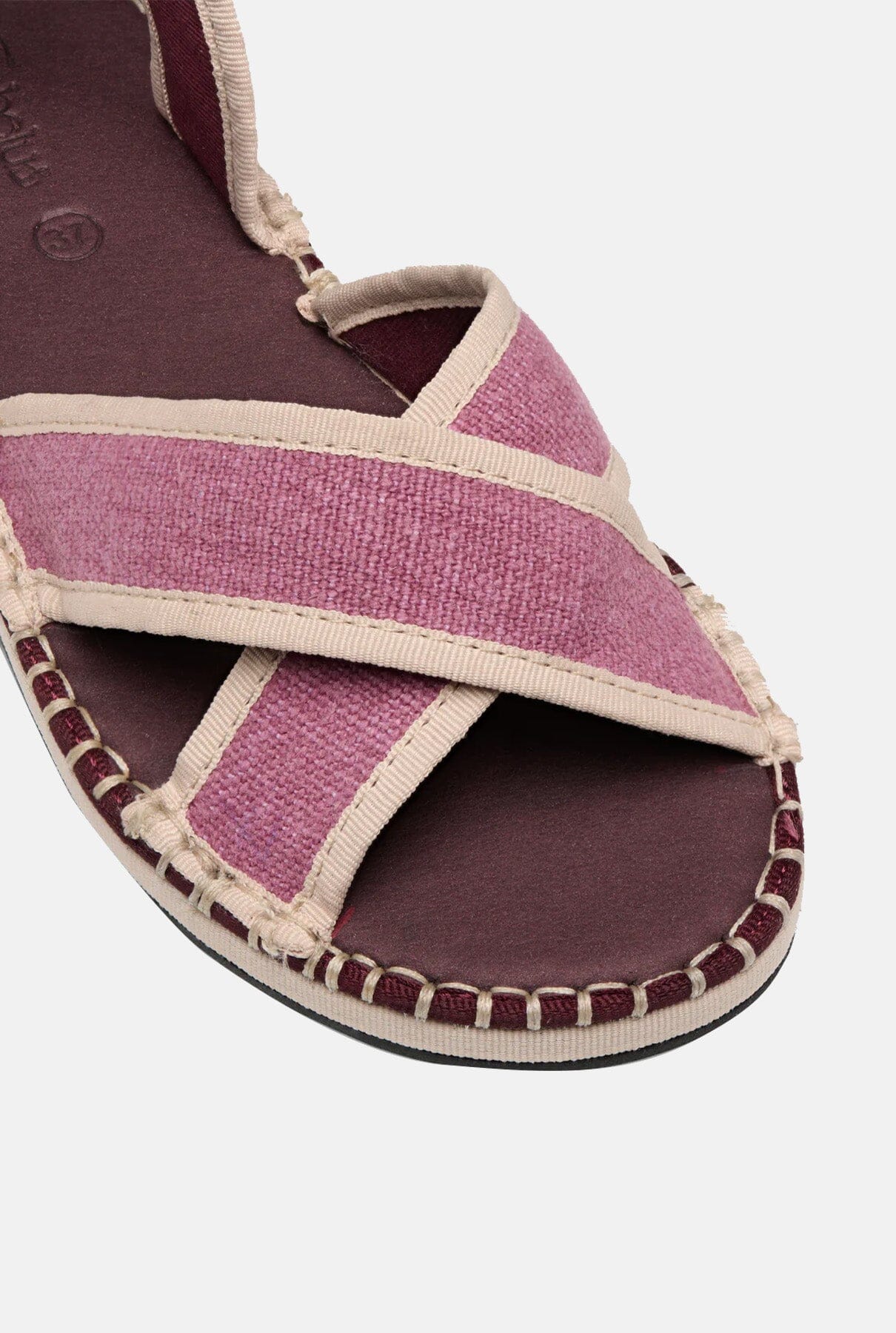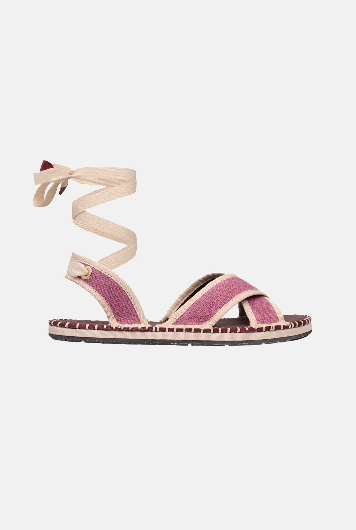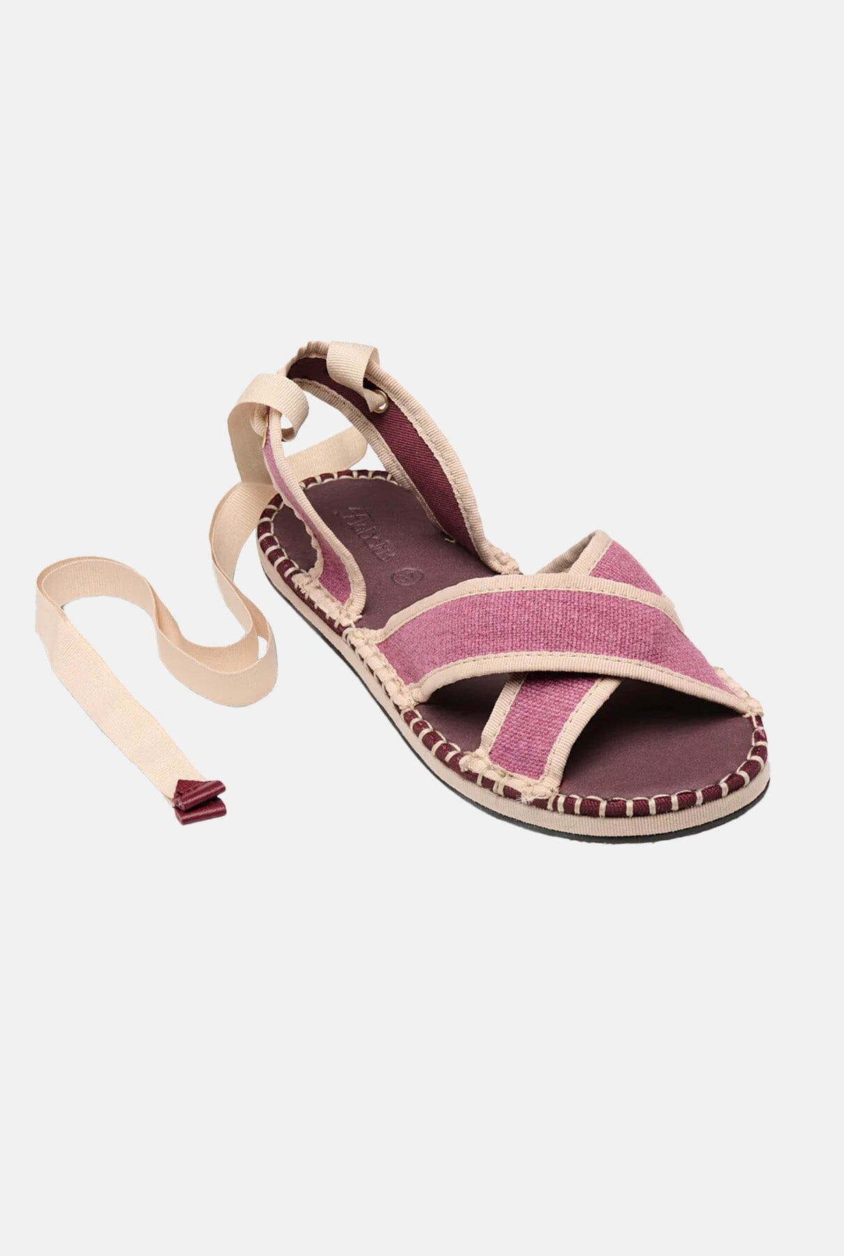 Sandalias color ciruela con ribetes beige claro y cordones beige claro.