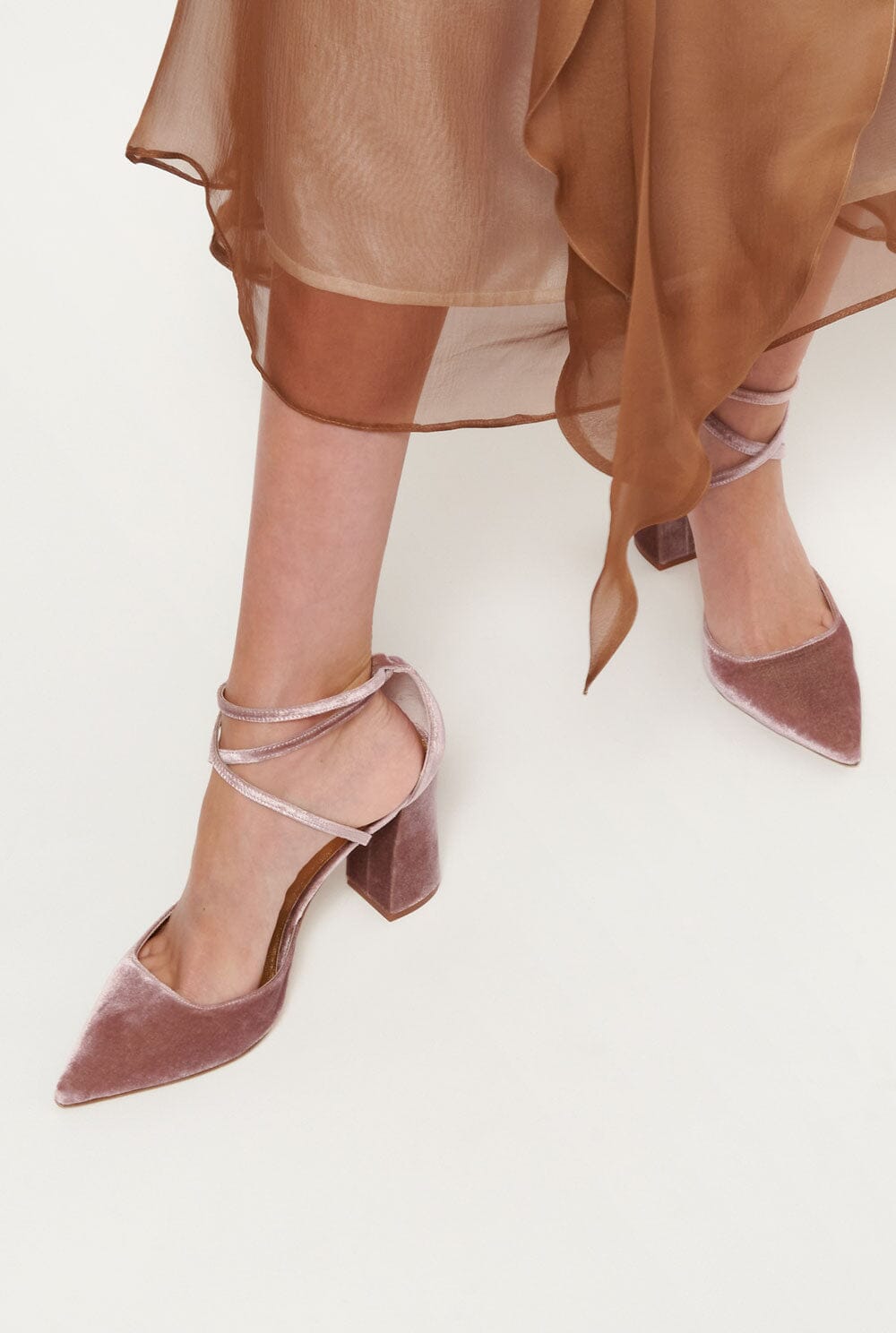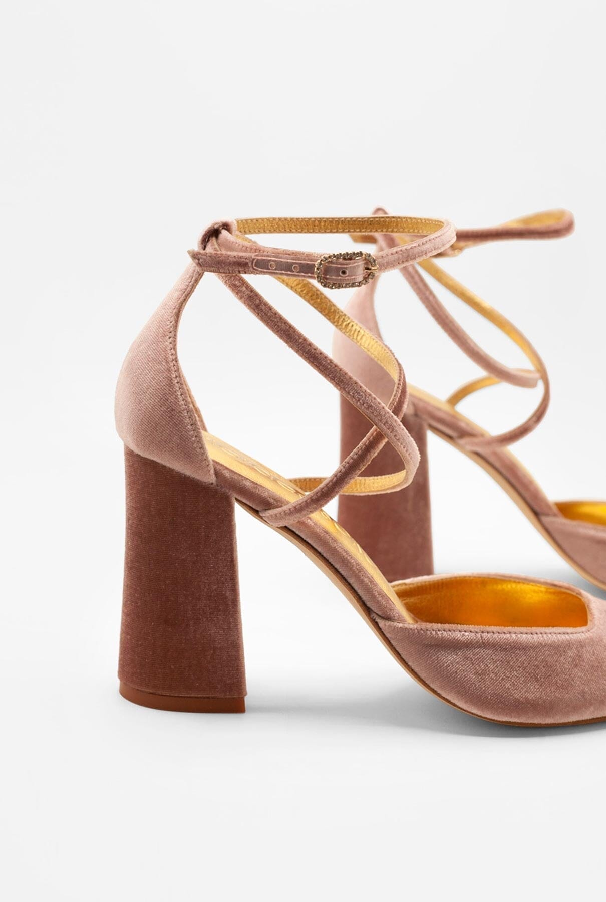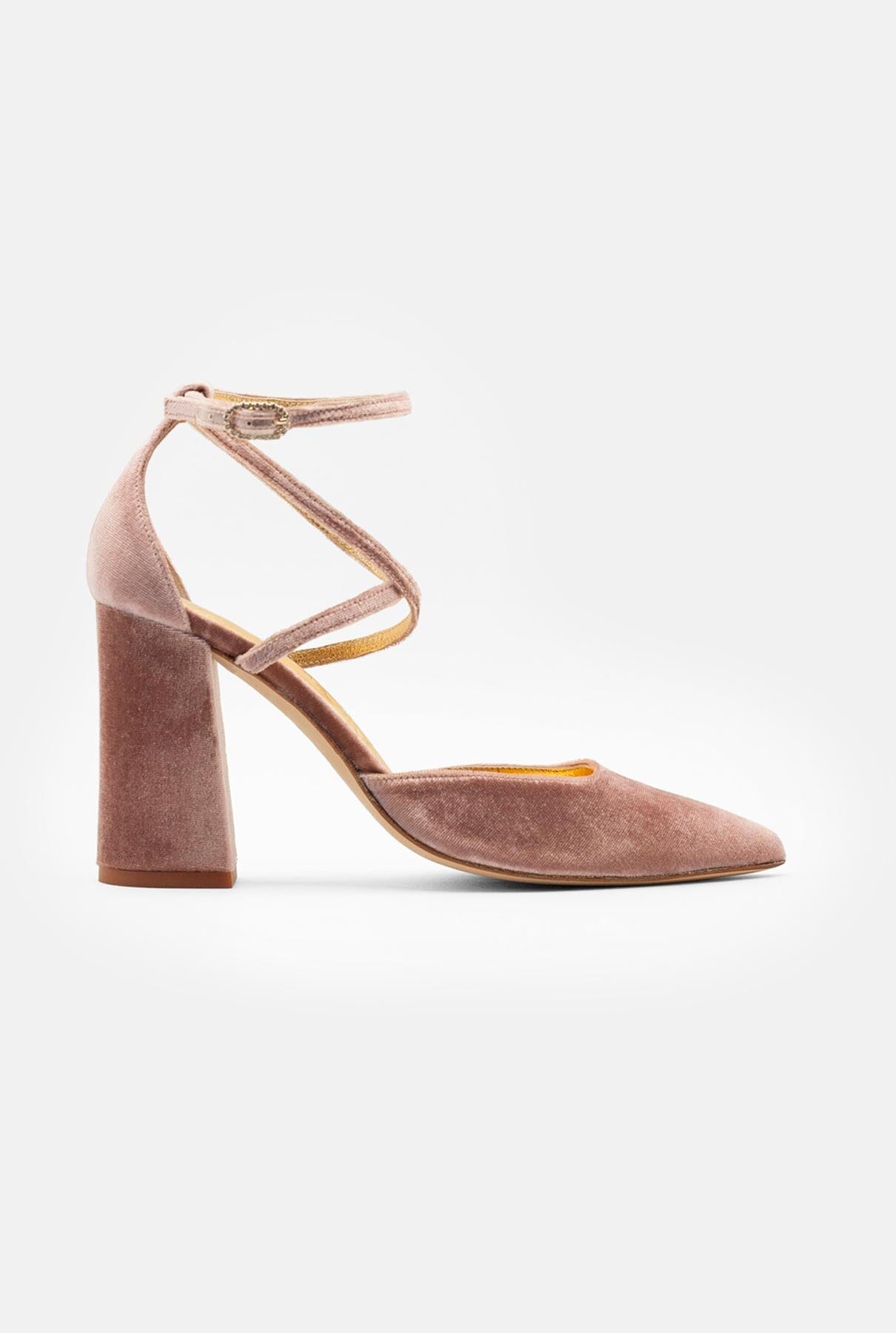 Sandalias diseñadas y fabricadas 100% artesanalmente en España. Tacón bloque de terciopelo de 9 cm. Diseñado por Flordeasoka