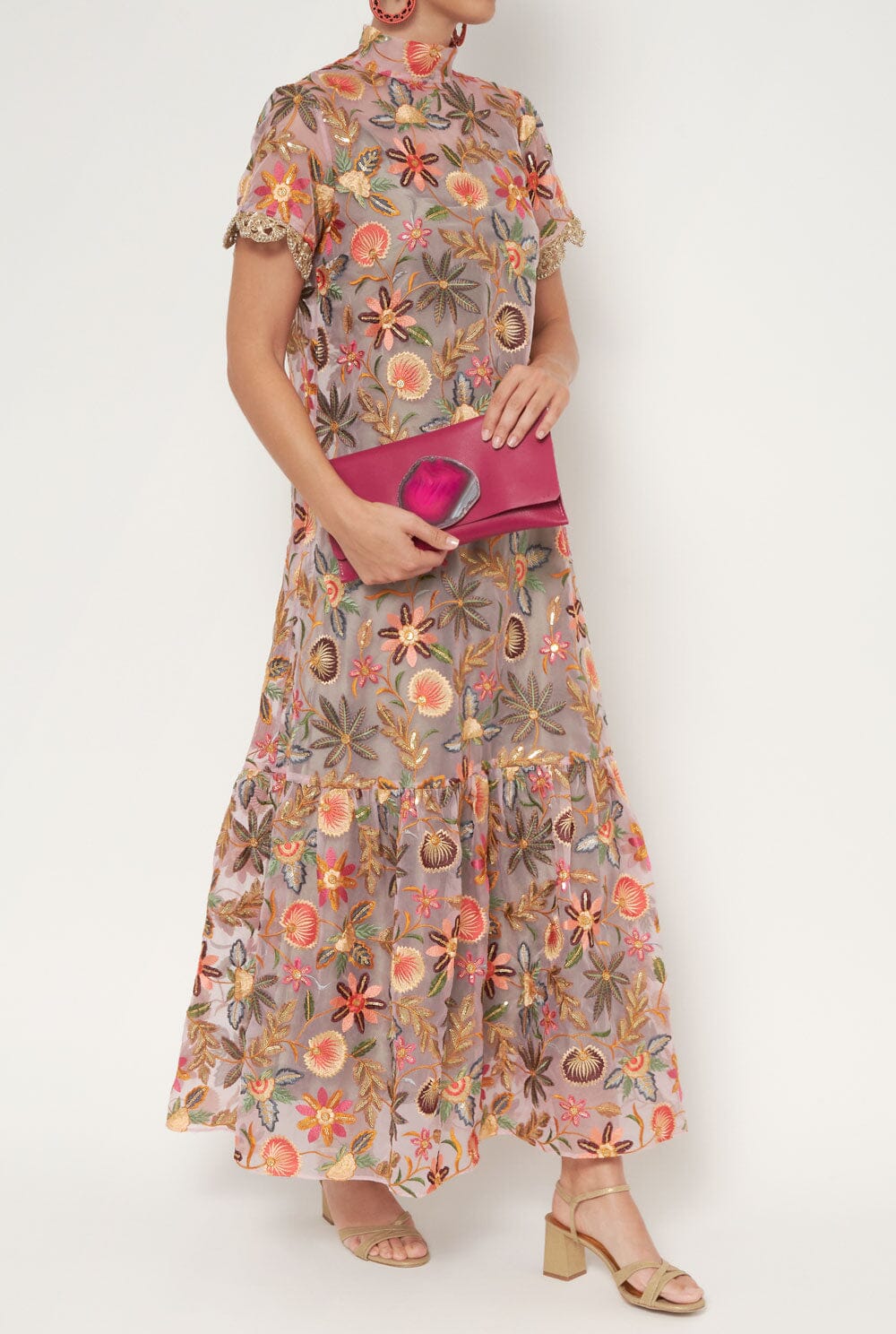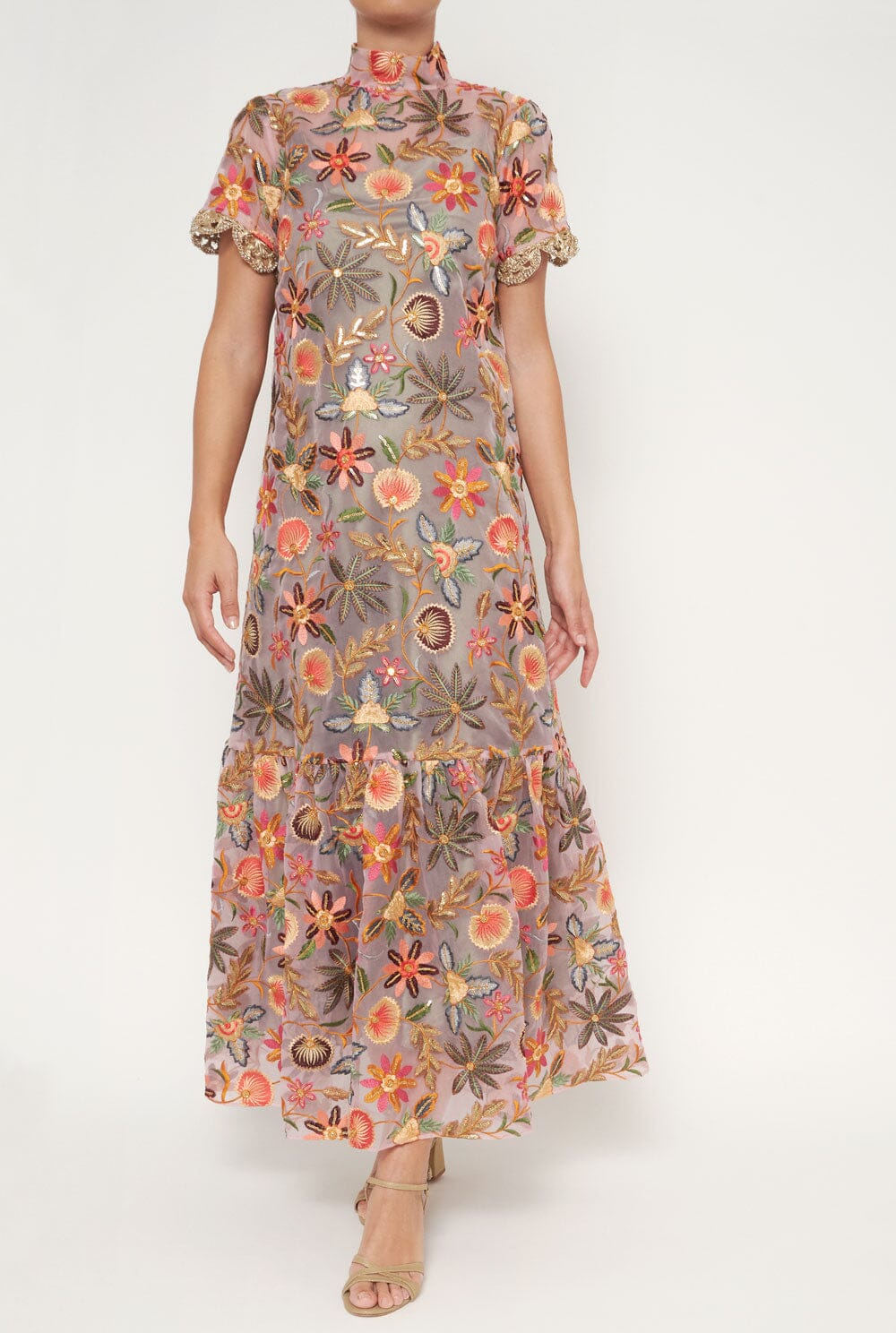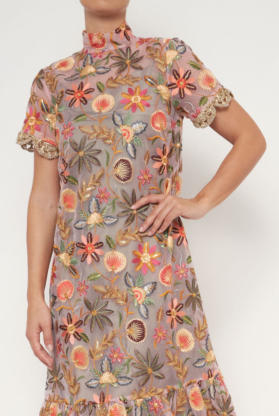 Encuentra en LD piezas para ocasiones especiales como el vestido de flores Halinka en organza bordada con hilos dorados y lentejuelas. Diseño fluido y semitransparente con escote alto. Incorpora un vestido interior de raso verde oliva que se puede llevar por separado. Detalle de ribete dorado en manga. Cierre trasero con botones joya.