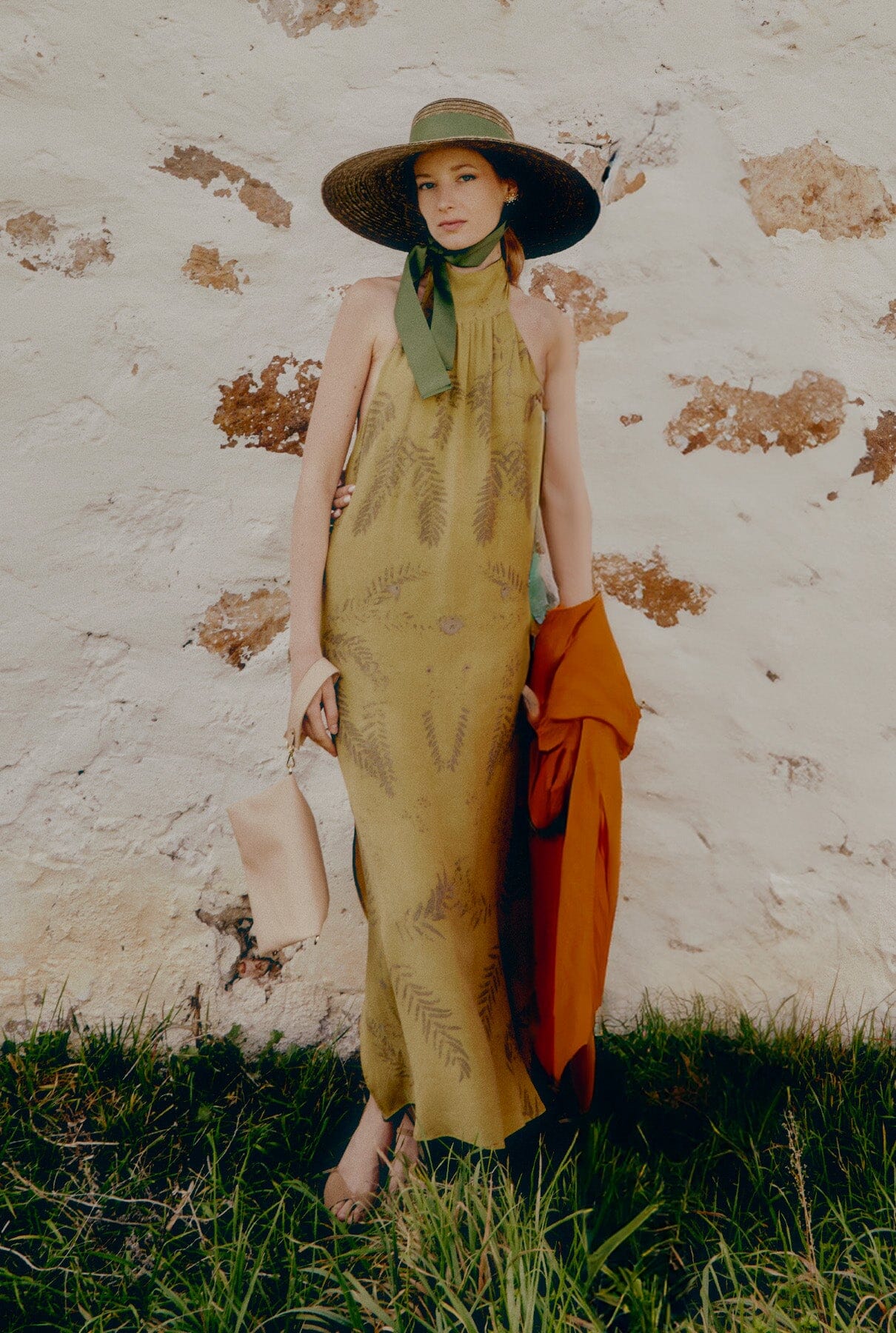 Este vestido halter con ecoprint es un vestido largo de crepé 100% seda que se ata alrededor del cuello. Esta pieza única pertenece a la colaboración entre Aletheia x Macarena Márquez.