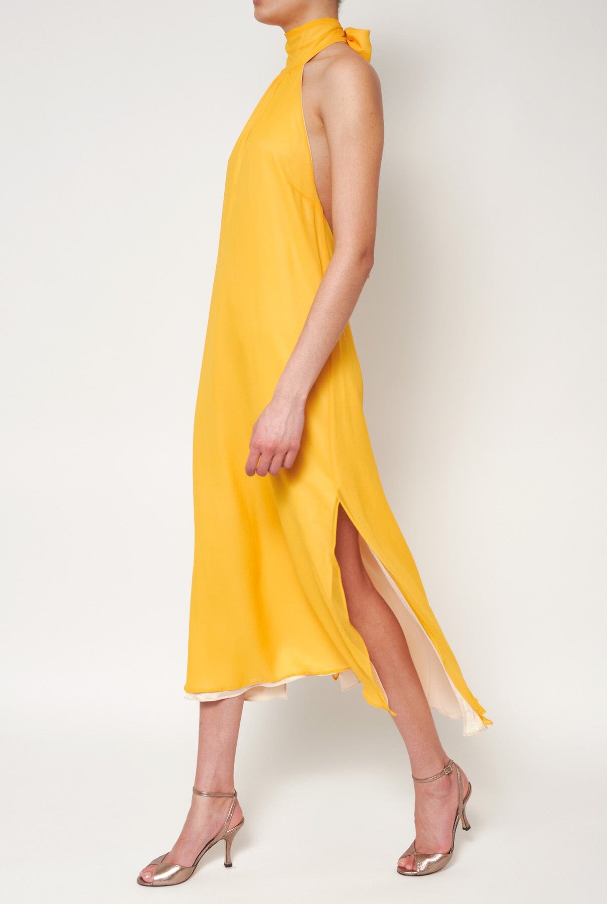 Un vestido sin mangas muy elegante y versátil, fácil de llevar con tacones, bailarinas, sandalias o deportivas. Está confeccionado en crepe de seda 100% y es reversible, por lo que podrás usarlo dos días seguidos o cambiar de color cuando quieras. Viene con cinturón, y un pañuelo largo bicolor te permite atarlo como quieras alrededor de tu espalda o alrededor de tu cuerpo a modo de cinturón. Como todo en Aletheia, este vestido está elaborado con tintes naturales provenientes de plantas. Para esta pieza hemos utilizado Gardenia.