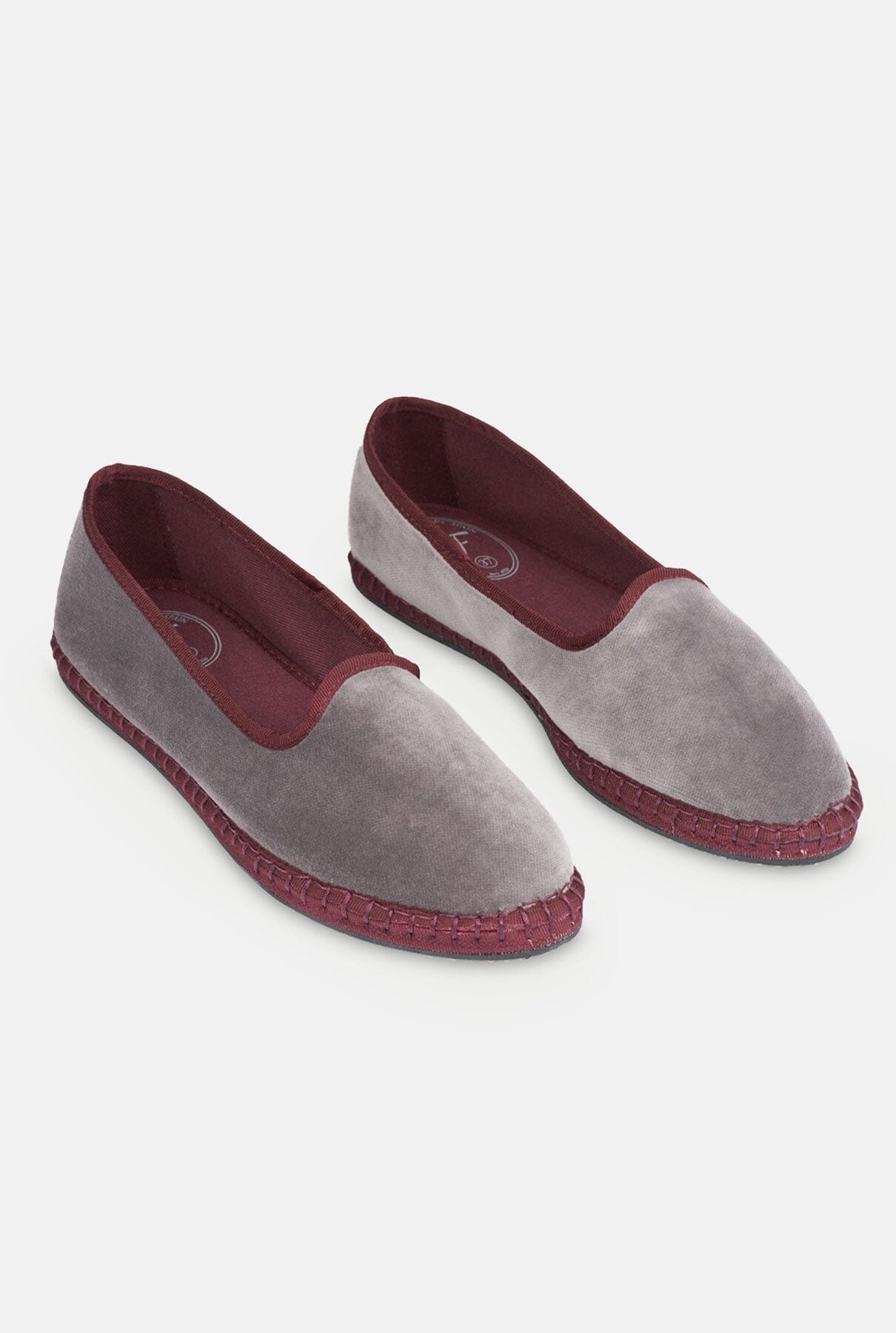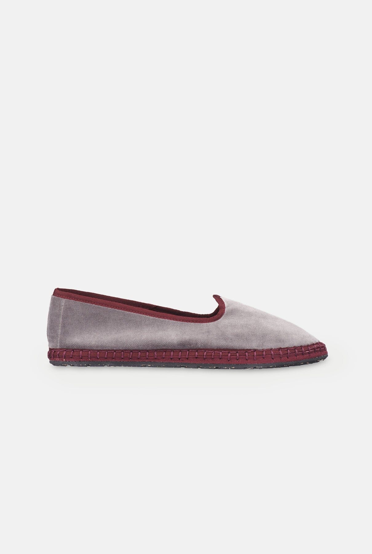 Zapatilla de terciopelo gris con ribetes a contraste en color burdeos. El exterior del zapato es 100% terciopelo de algodón, y el interior del zapato es 100% algodón ecológico con tratamiento antibacteriano. La suela está hecha de caucho procedente de neumáticos de bicicleta reciclados.