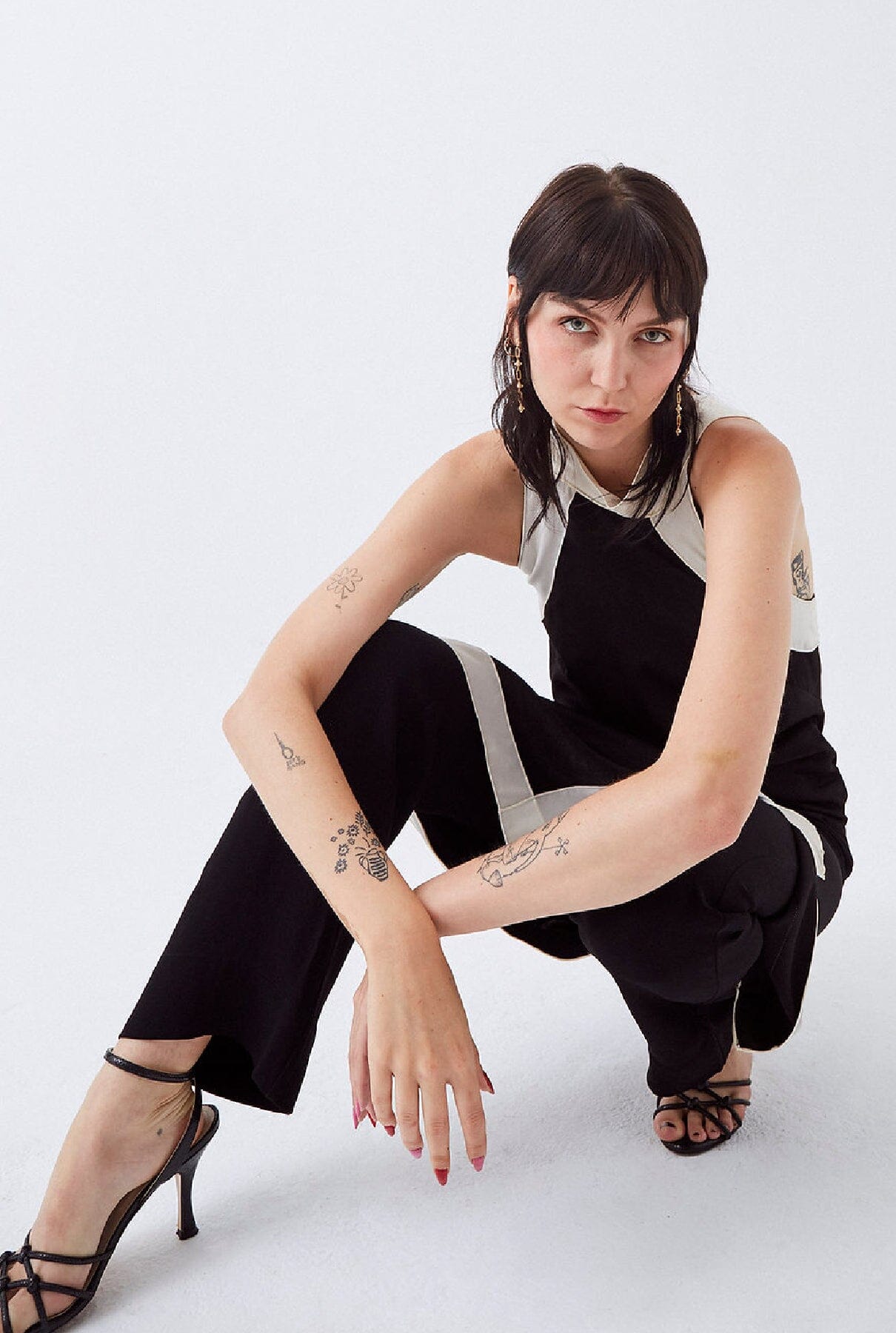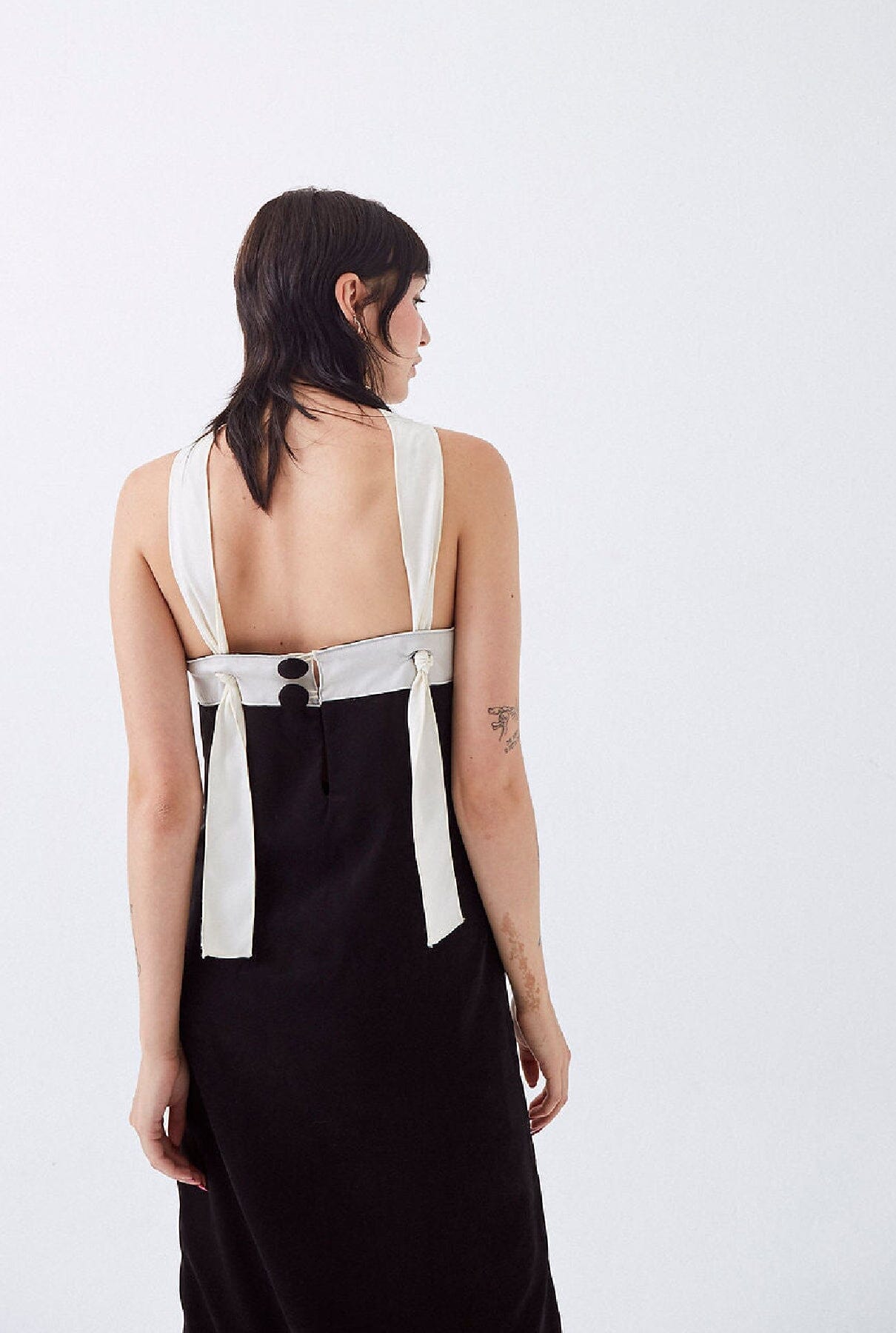 Vestido halter bicolor en raso texturizado con abertura lateral.