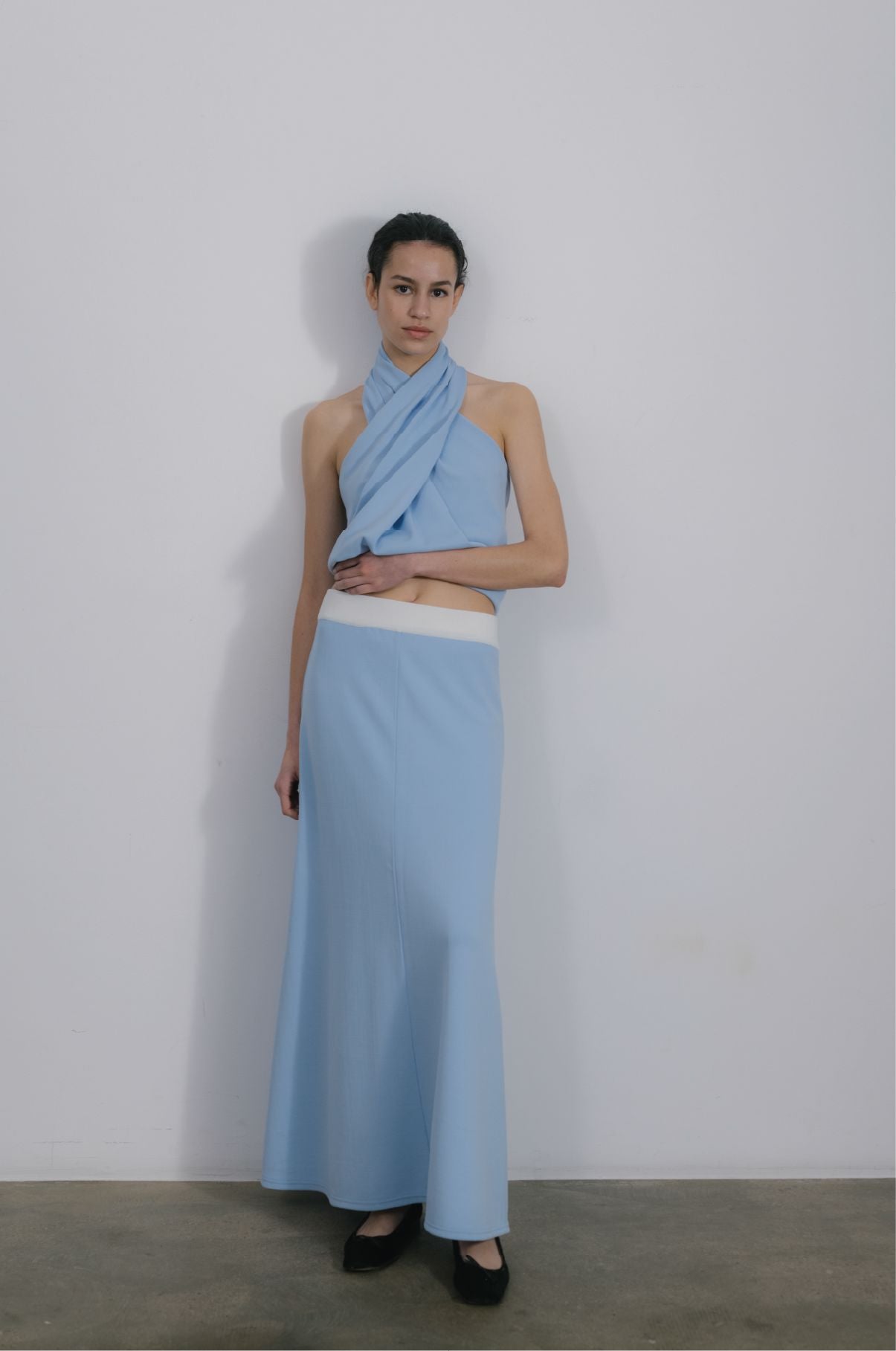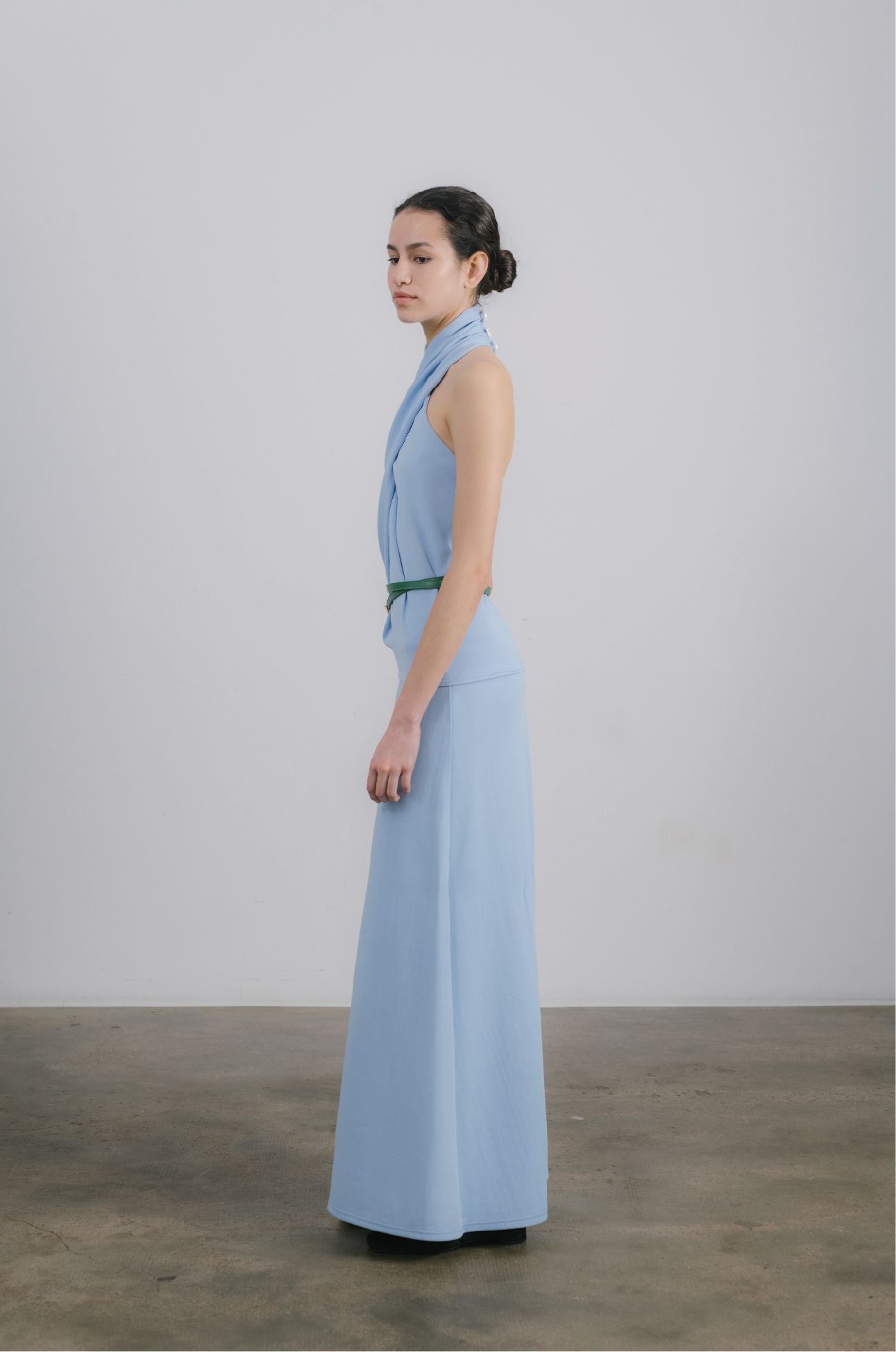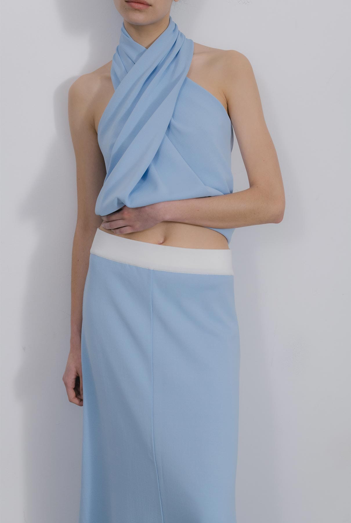 The Isa Top is a stop-and-stare piece. It is made from viscose blend breathable fabric knitted in house. This unique piece has a eye catching halterneck structure and open back. The final detail is a three pearl button closure.